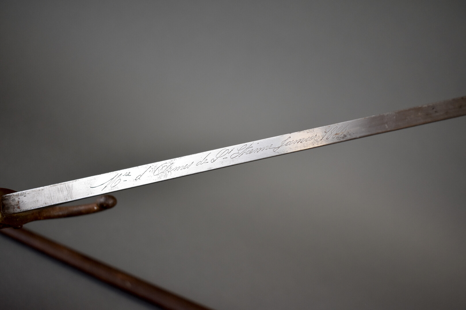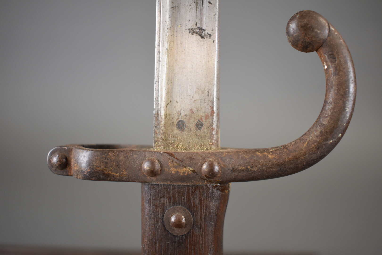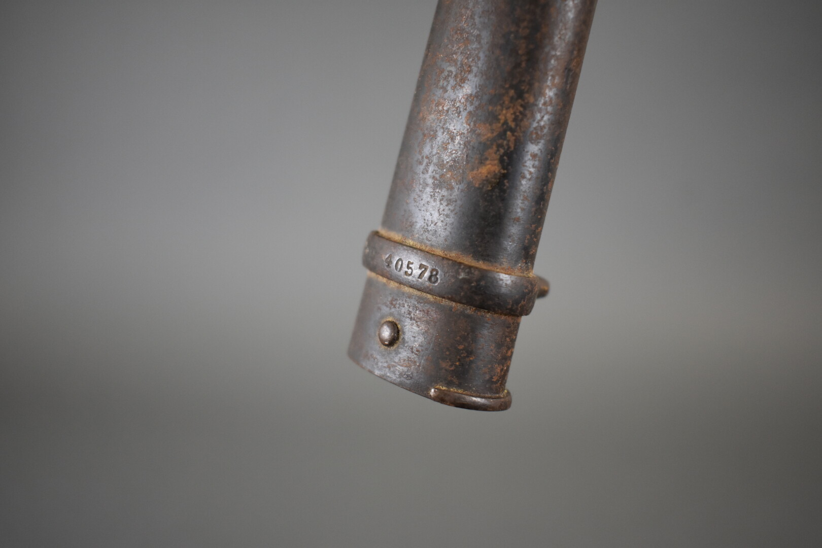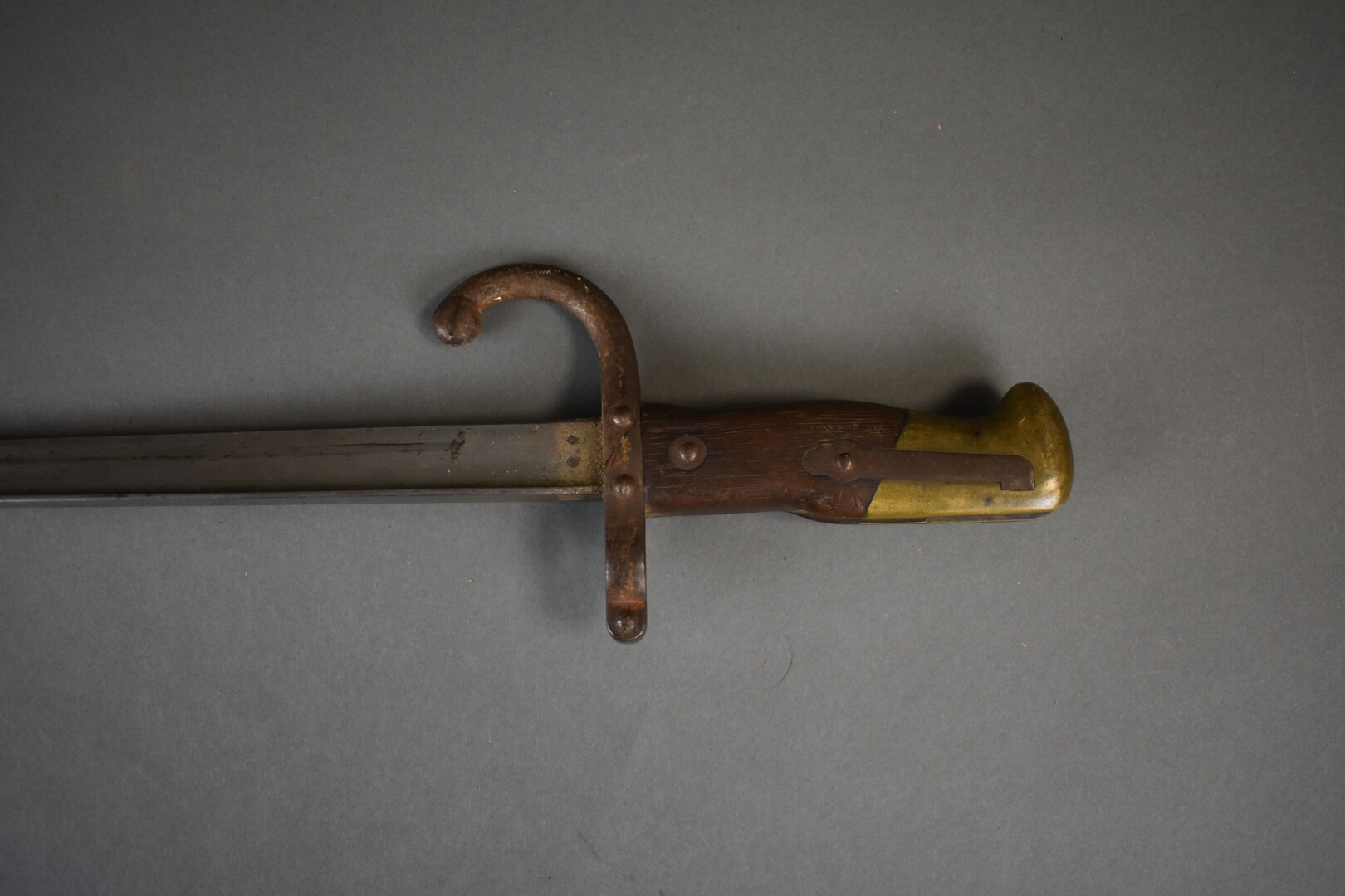 Baïonnette de fusil Gras infanterie dans son fourreau fabrication « Manufacture d’Armes de Saint Étienne janvier 1880 ». Fourreau au numéro. État 2.