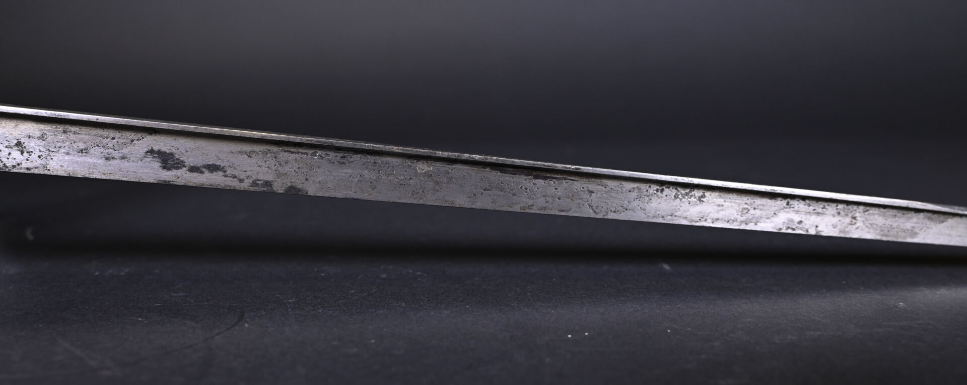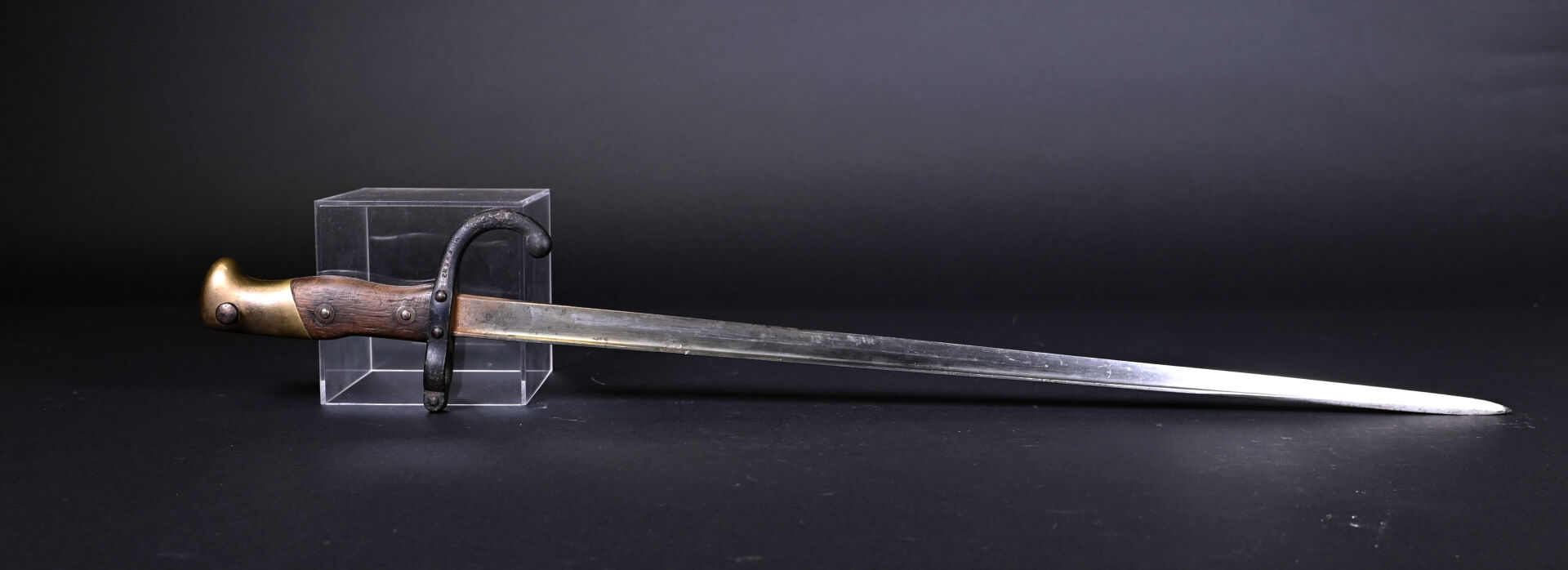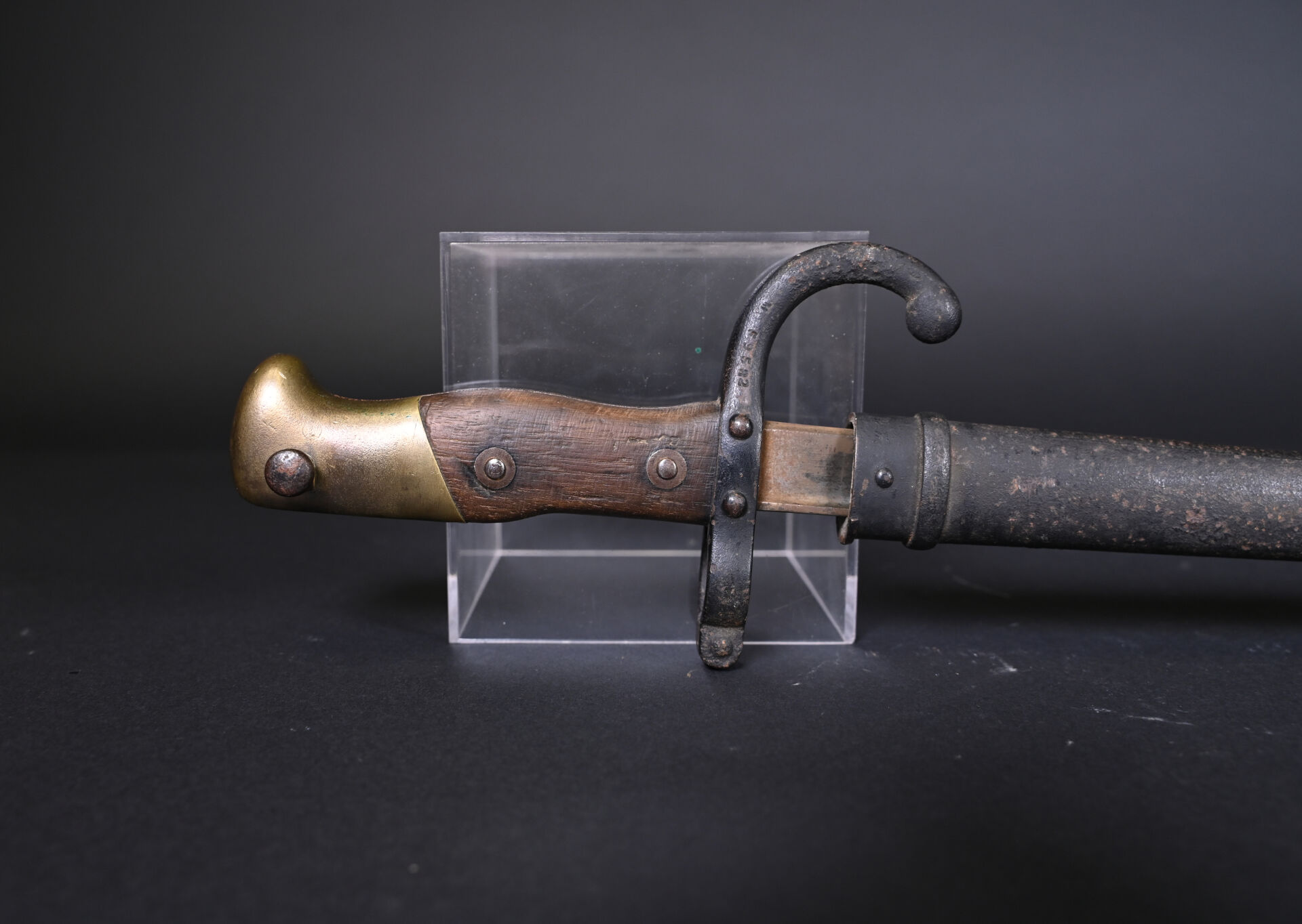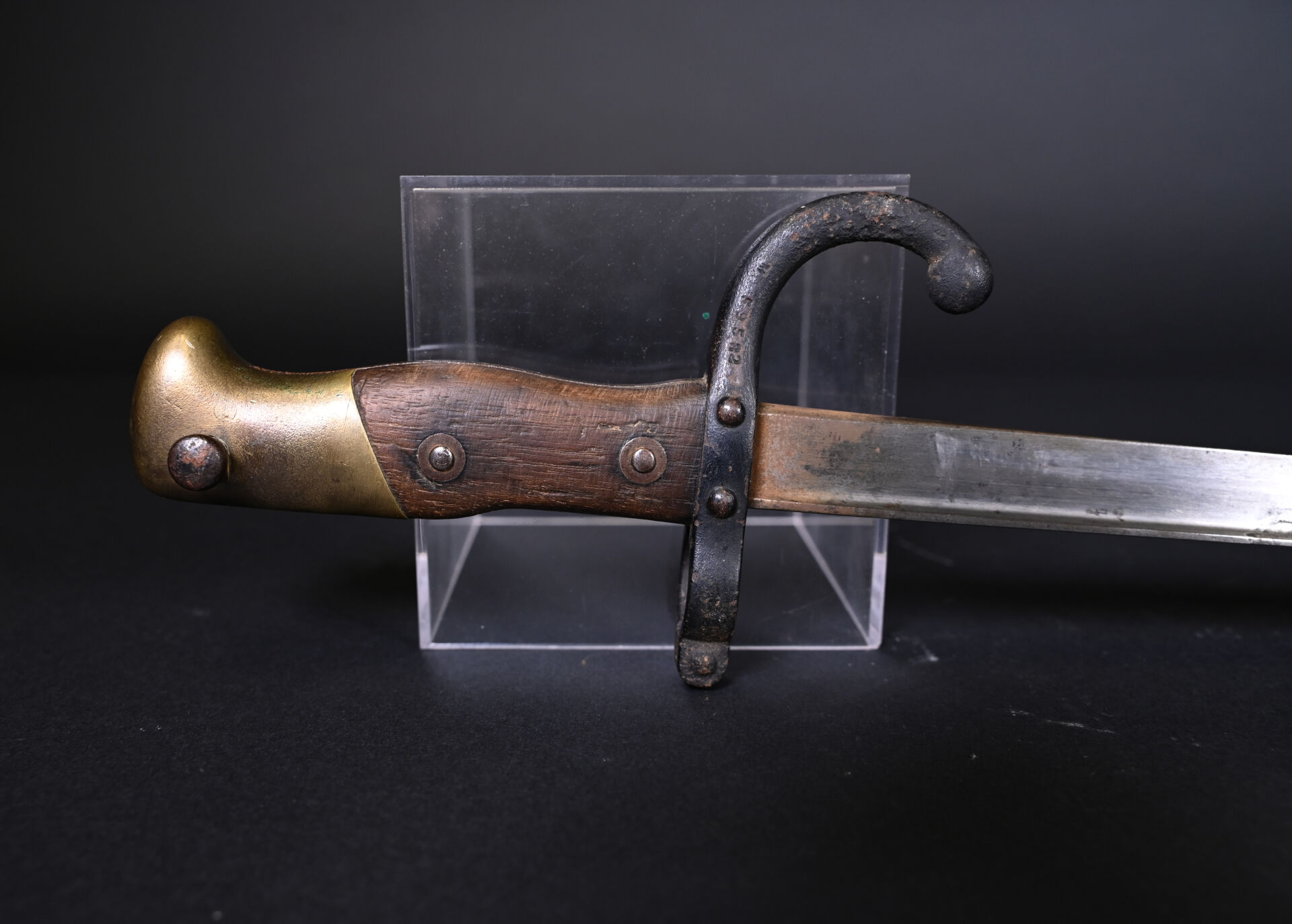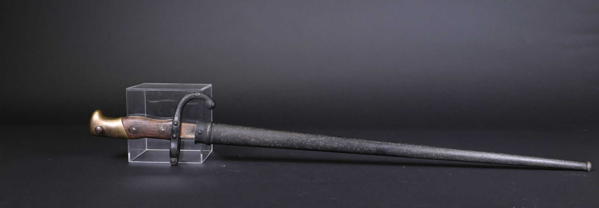Baïonnette réglementaire d’infanterie au fusil Gras. Modèle 1874. Fabrication Manufacture d’Armes de St-Etienne, Février 1880, dans un fourreau pas au numéro. État 2.