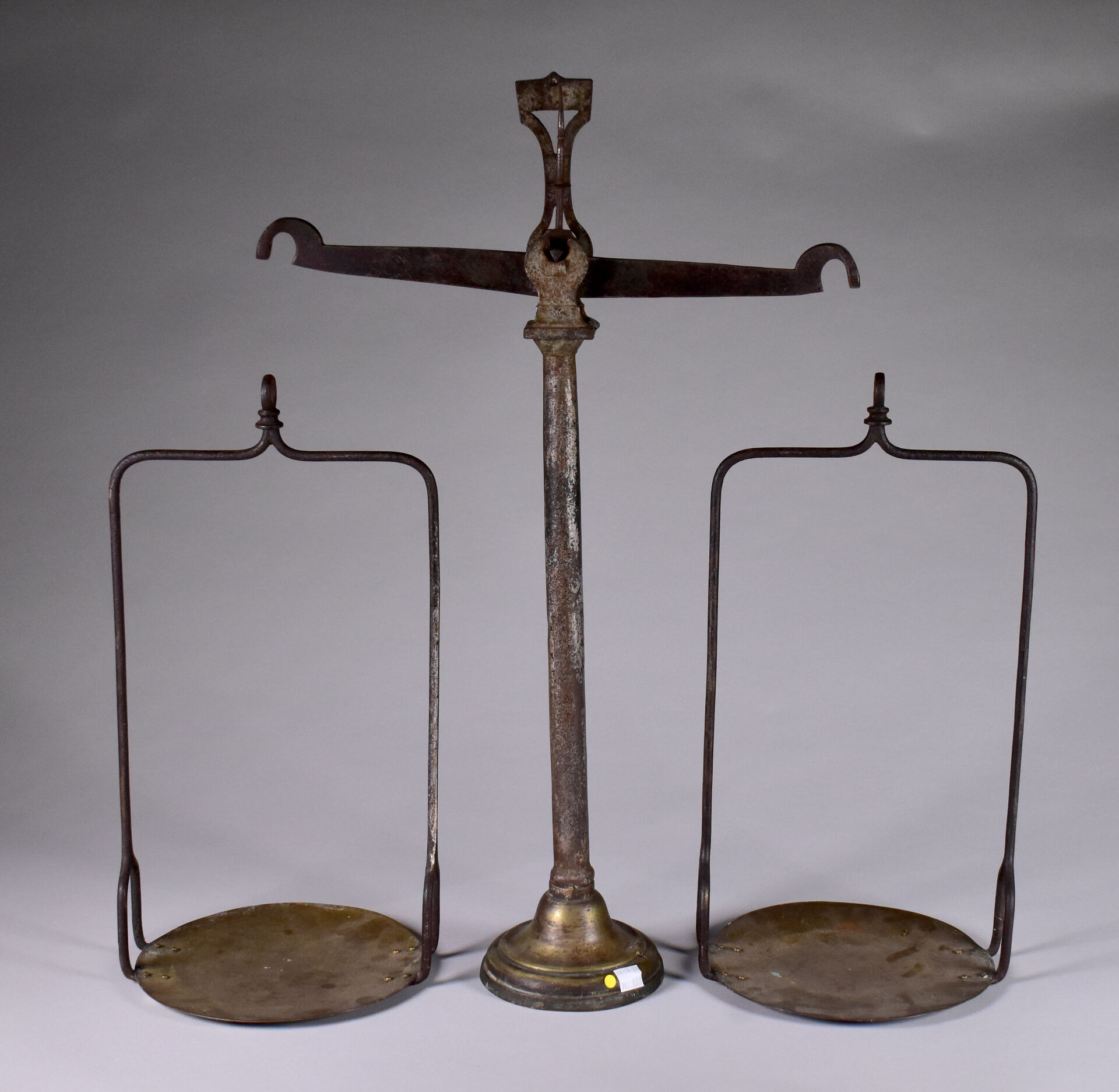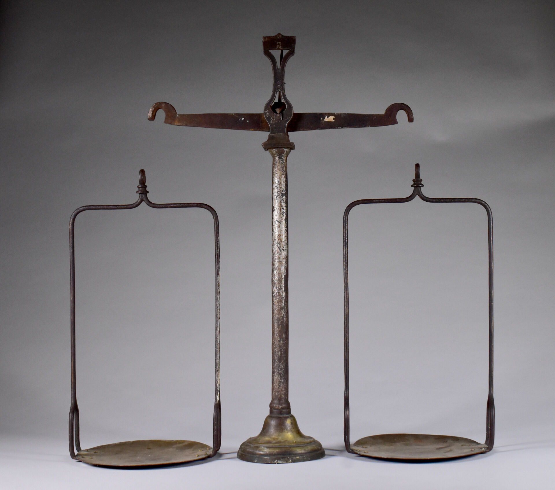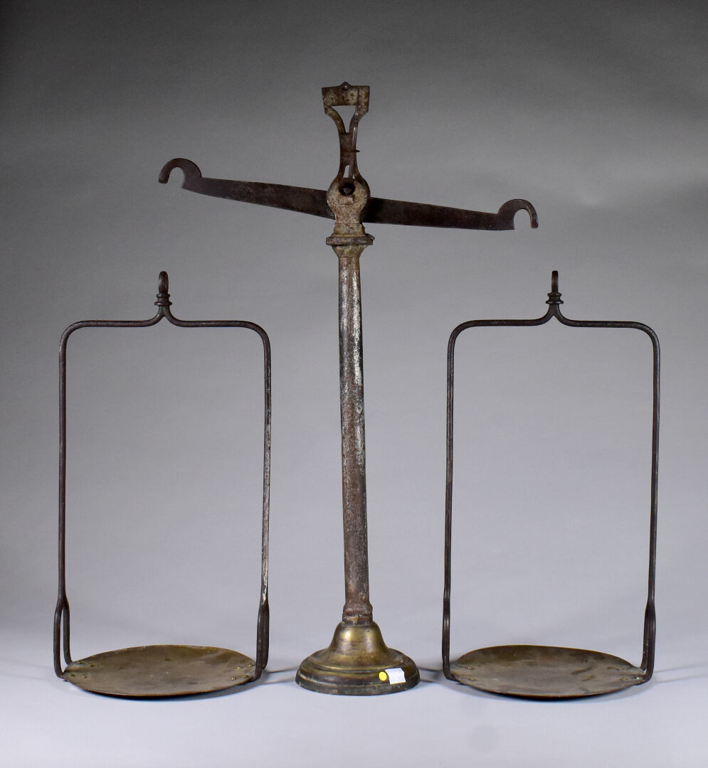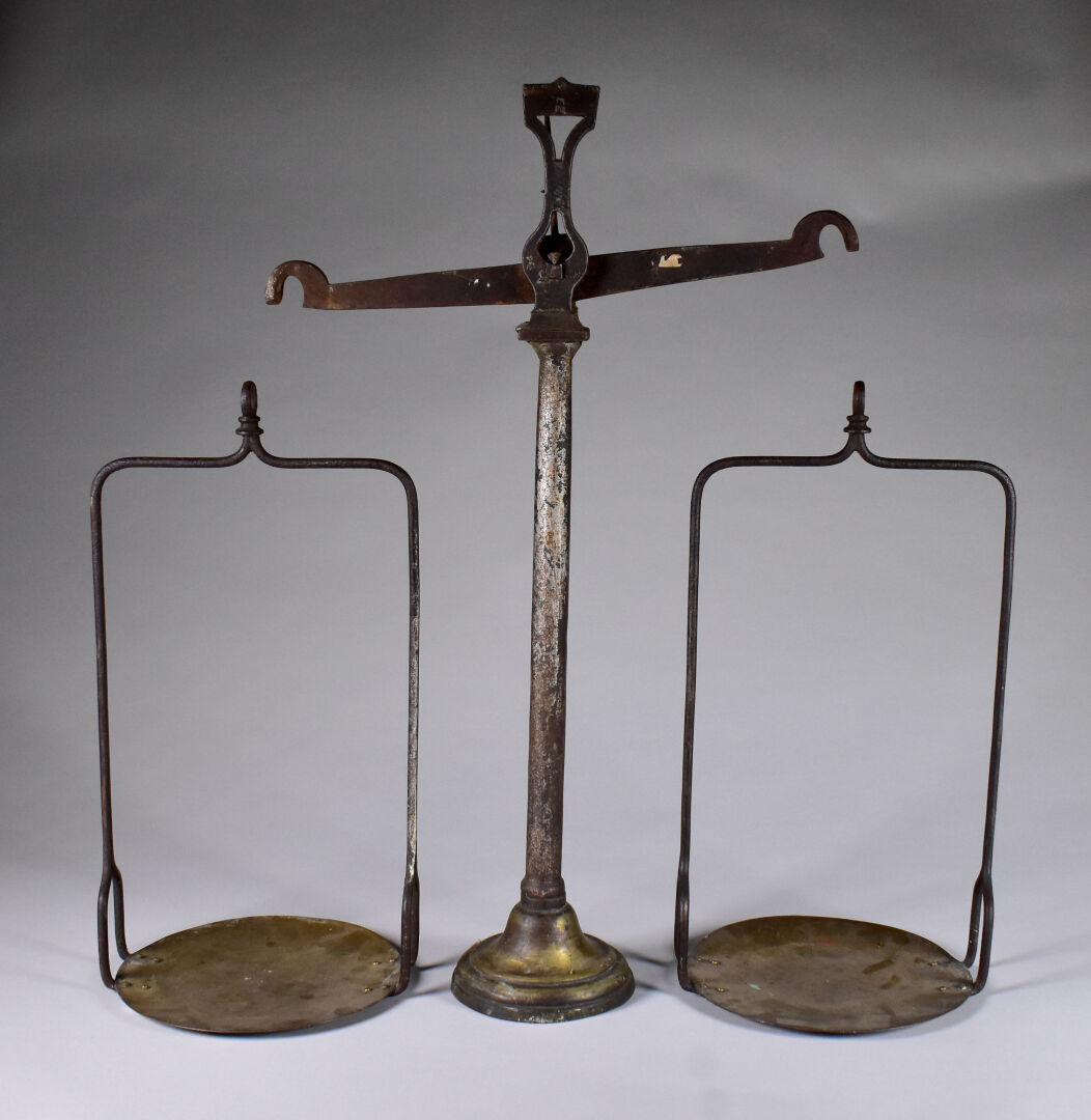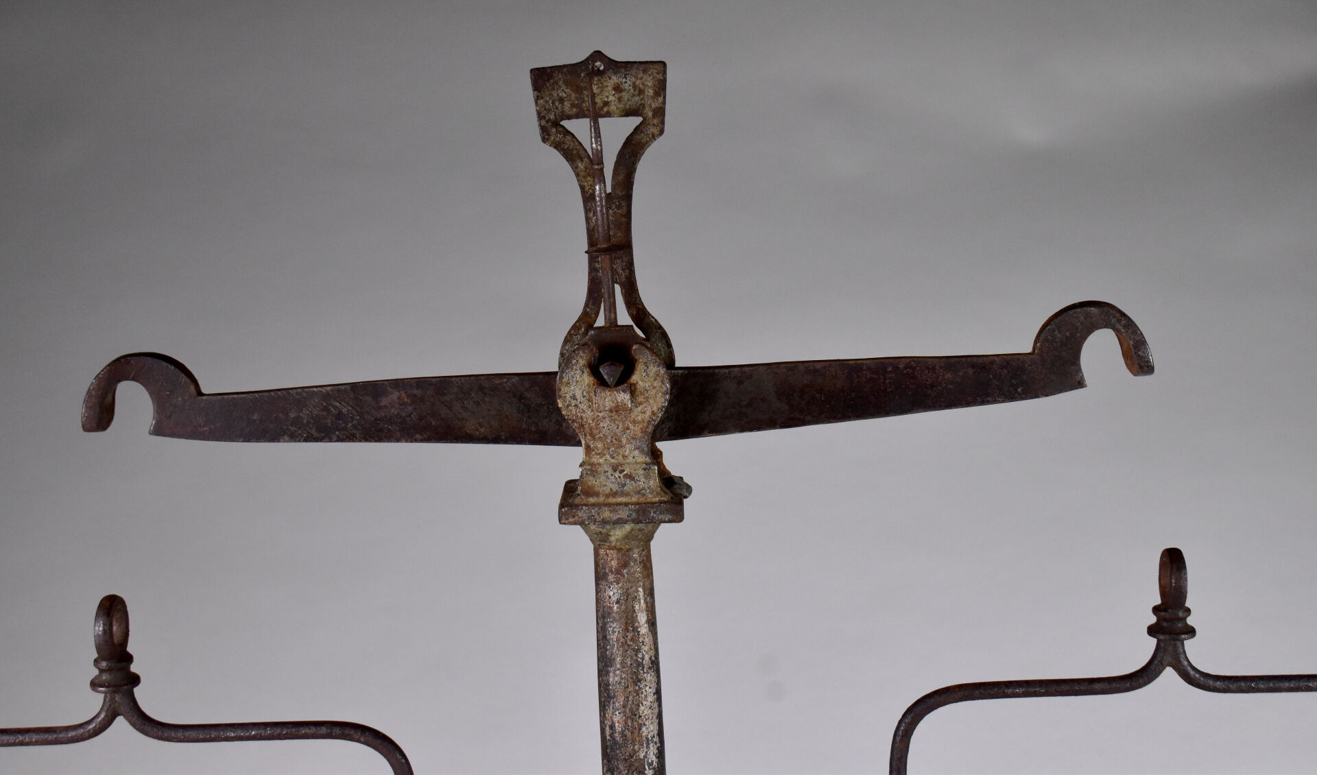 Balance de commerce ou de pharmacien ou de boulanger en laiton et fer forgé (?) (manquent les attaches). XIXe siècle. Haut. : 63 cm.