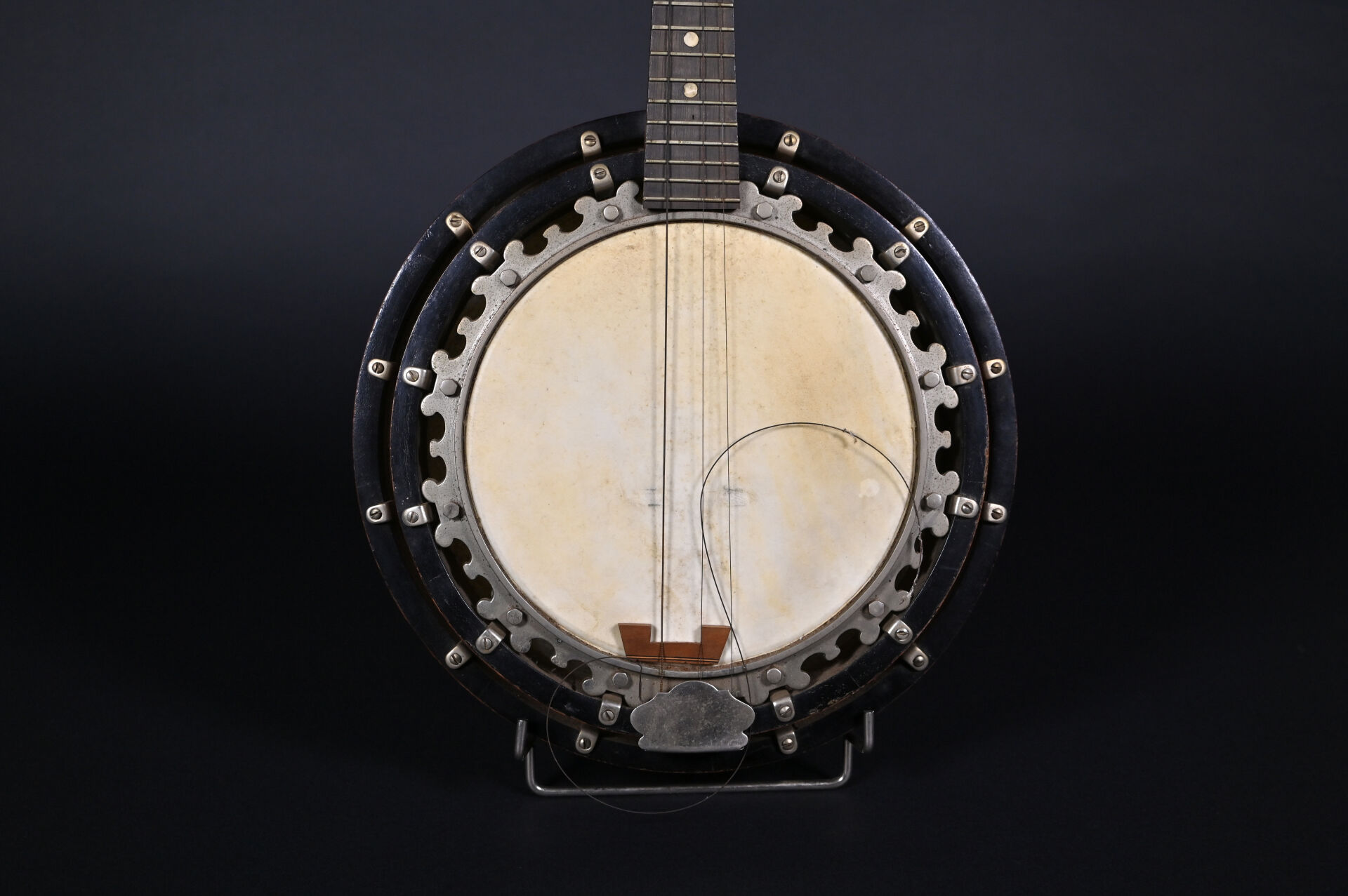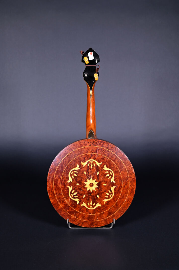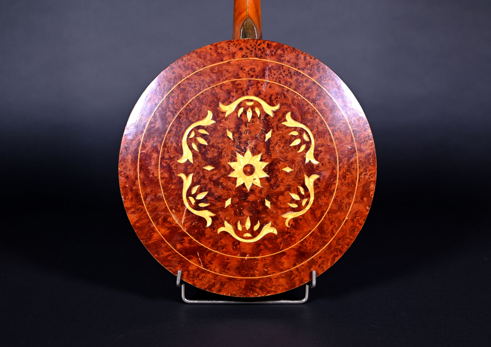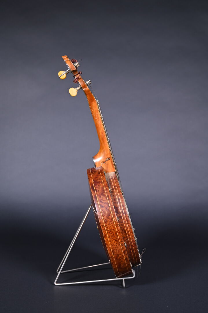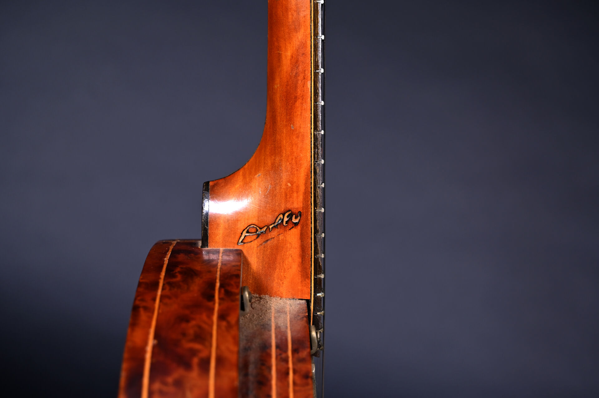 Banjo-ukulélé portant marque au fer Dolly, fabriqué en France circa 1920. Construction élaborée avec fût et résonateur ; fût en ronce de thuya, résonateur en ronce de thuya dont le fond est marqueté de filets circulaires et de motifs en nacrolaque. Semble en bel état général, marques d’usage, usure et patine au vernis, deux chevilles endommagées.