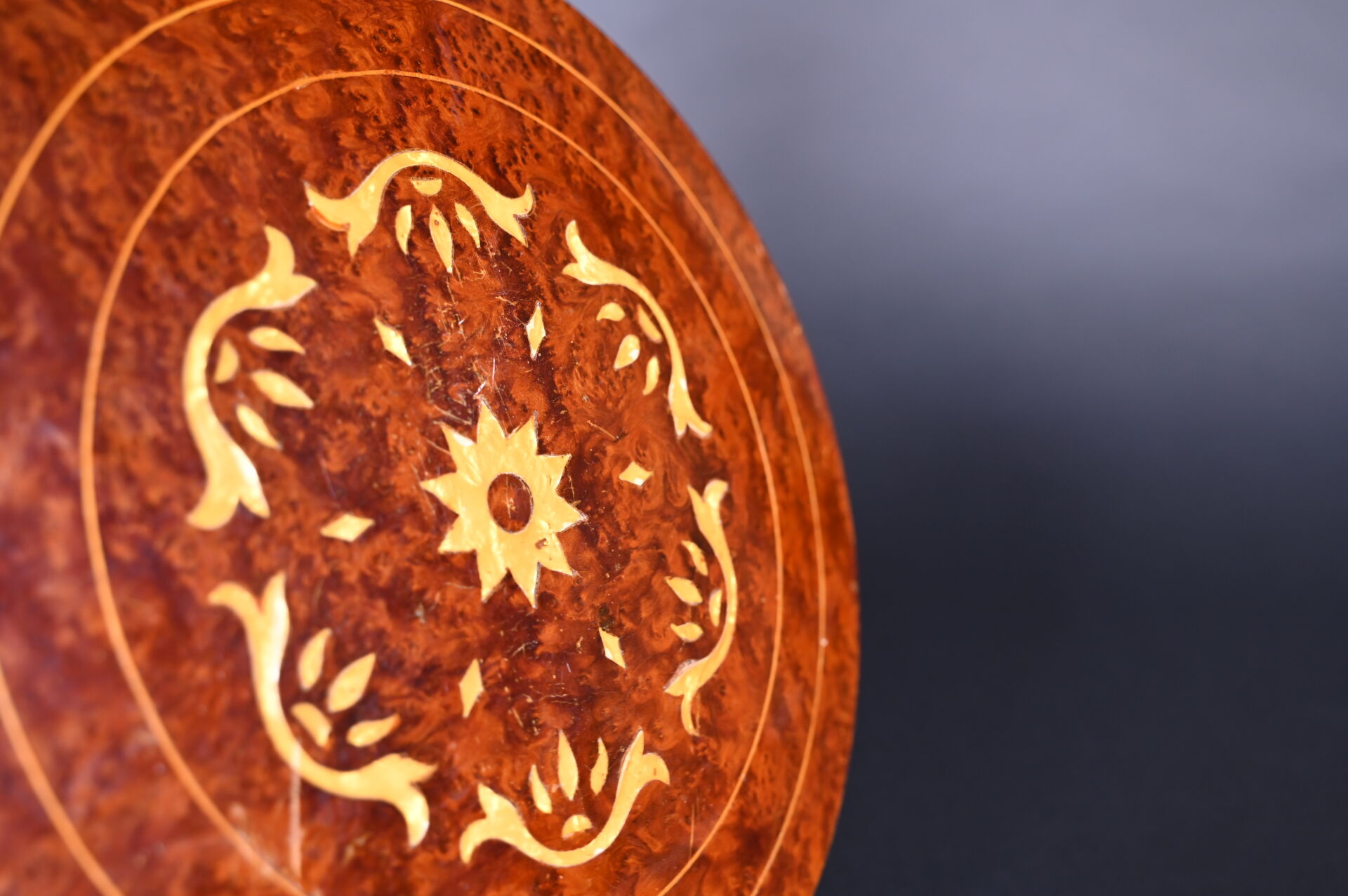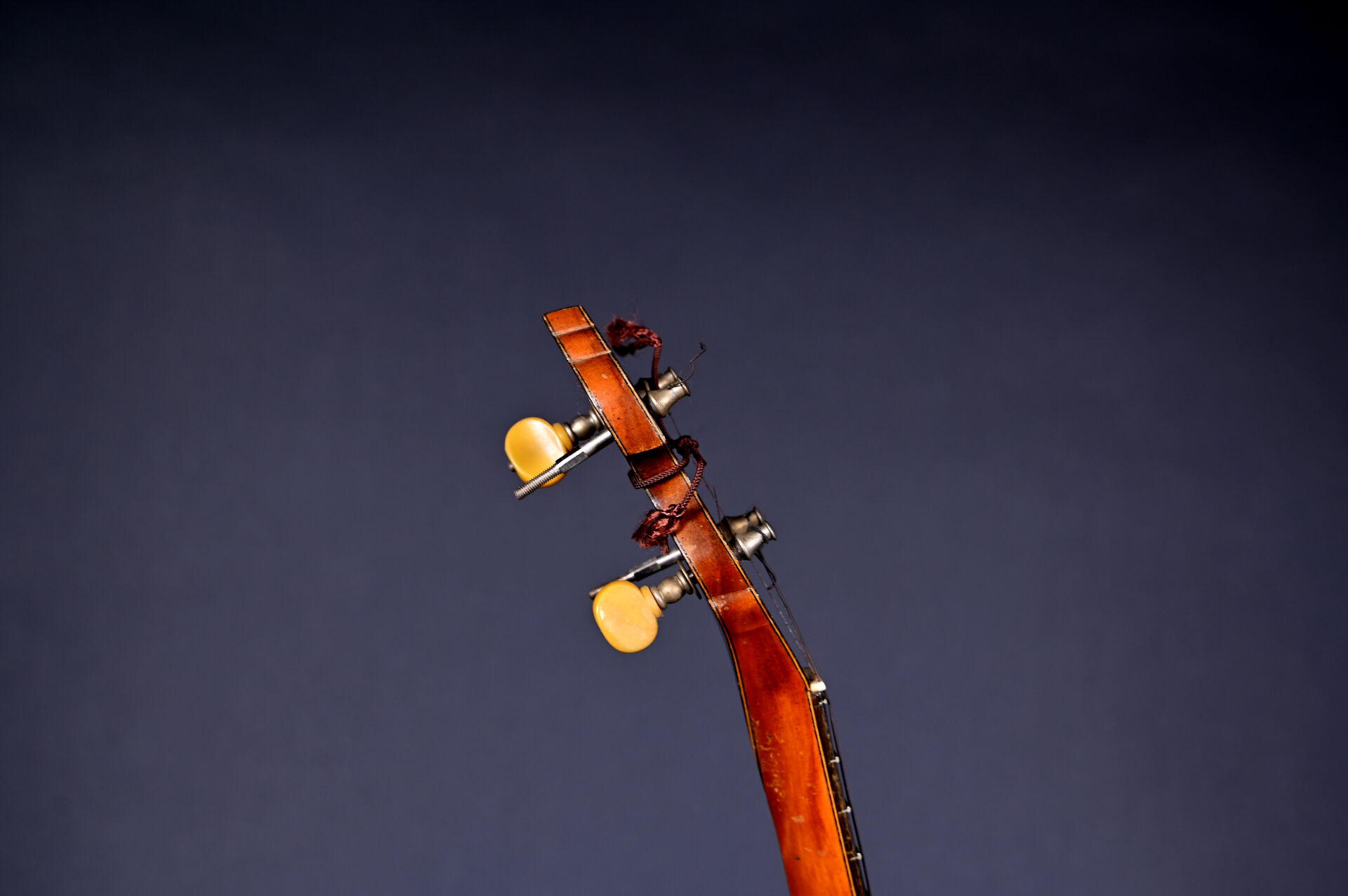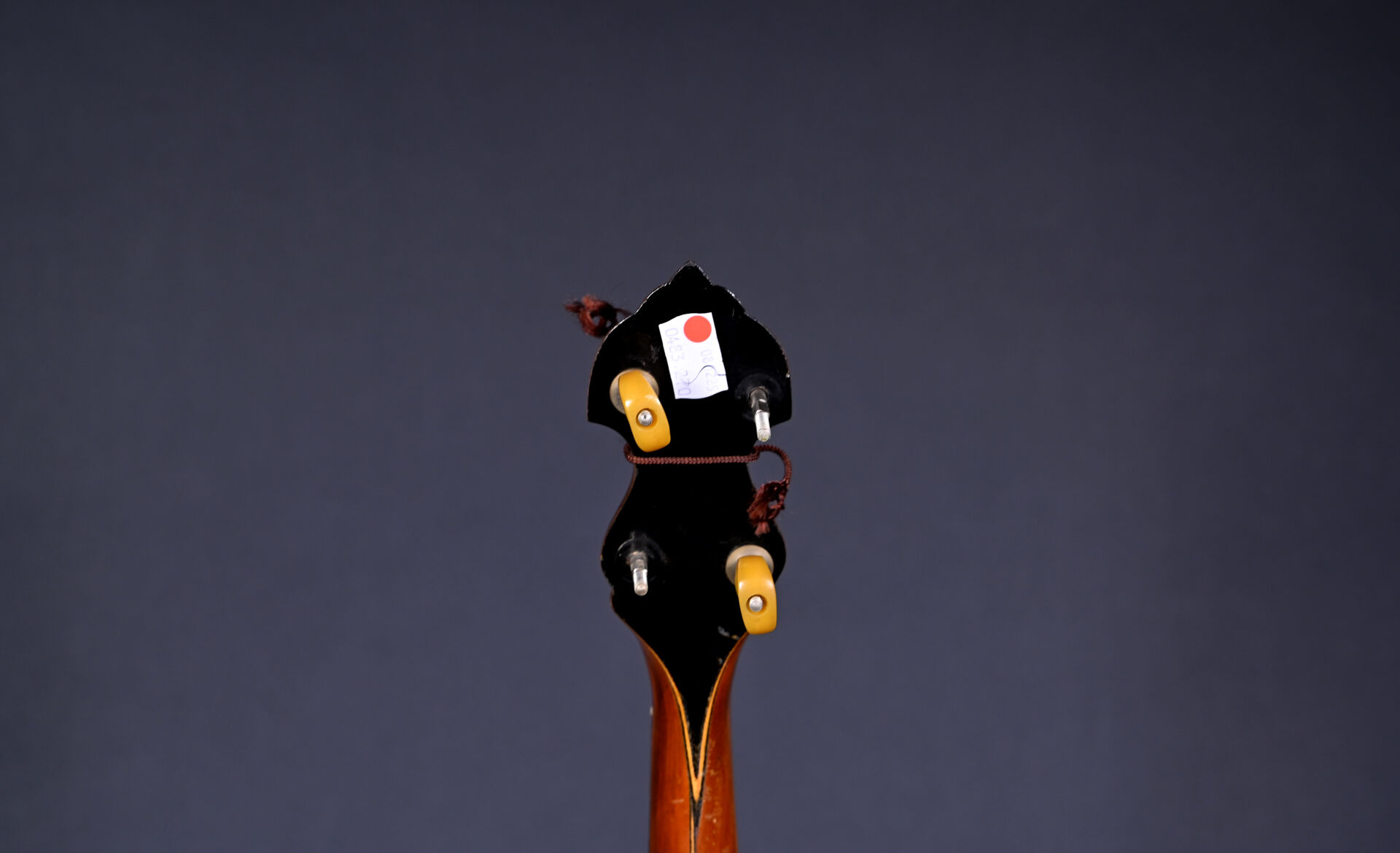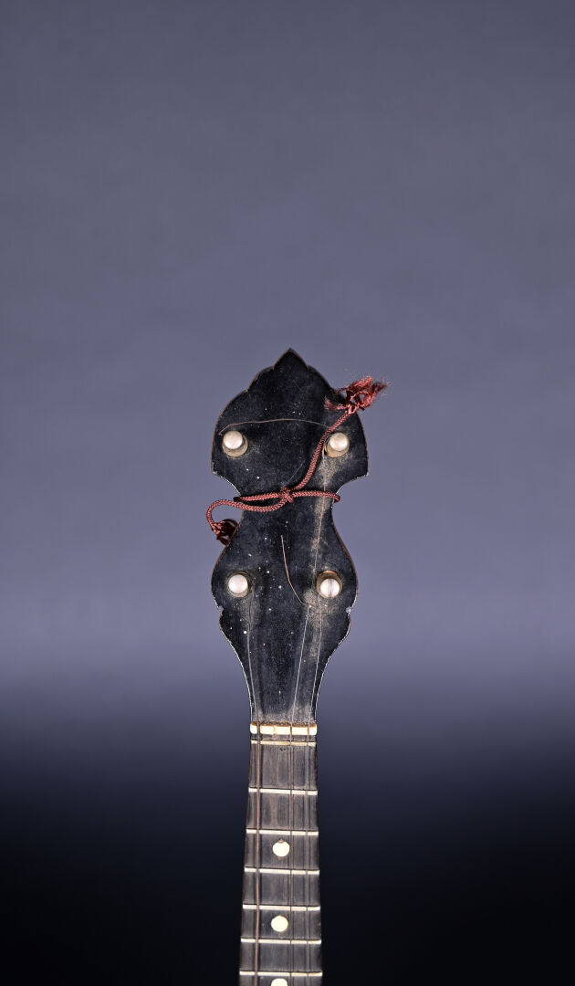 Banjo-ukulélé portant marque au fer Dolly, fabriqué en France circa 1920. Construction élaborée avec fût et résonateur ; fût en ronce de thuya, résonateur en ronce de thuya dont le fond est marqueté de filets circulaires et de motifs en nacrolaque. Semble en bel état général, marques d’usage, usure et patine au vernis, deux chevilles endommagées.
