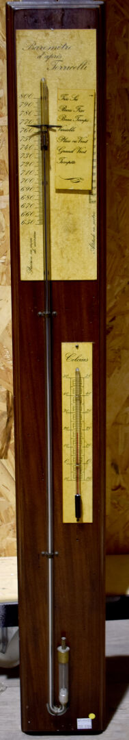 Baromètre -Thermomètre sur une plaque d’acajou d’après Torricelli (avec son mercure). Haut. : 98 cm.