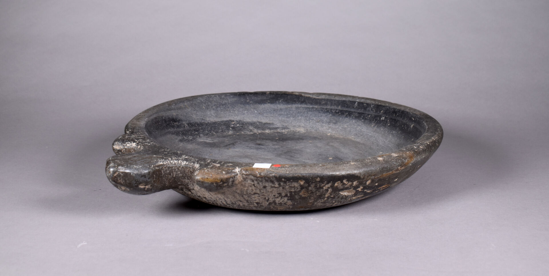 Bassin en pierre brune sculptée à bord ourlé. Une poignée latérale creusée dans la masse. Probablement Afrique du Nord. Dimensions : 51 x 43 x 9 cm.