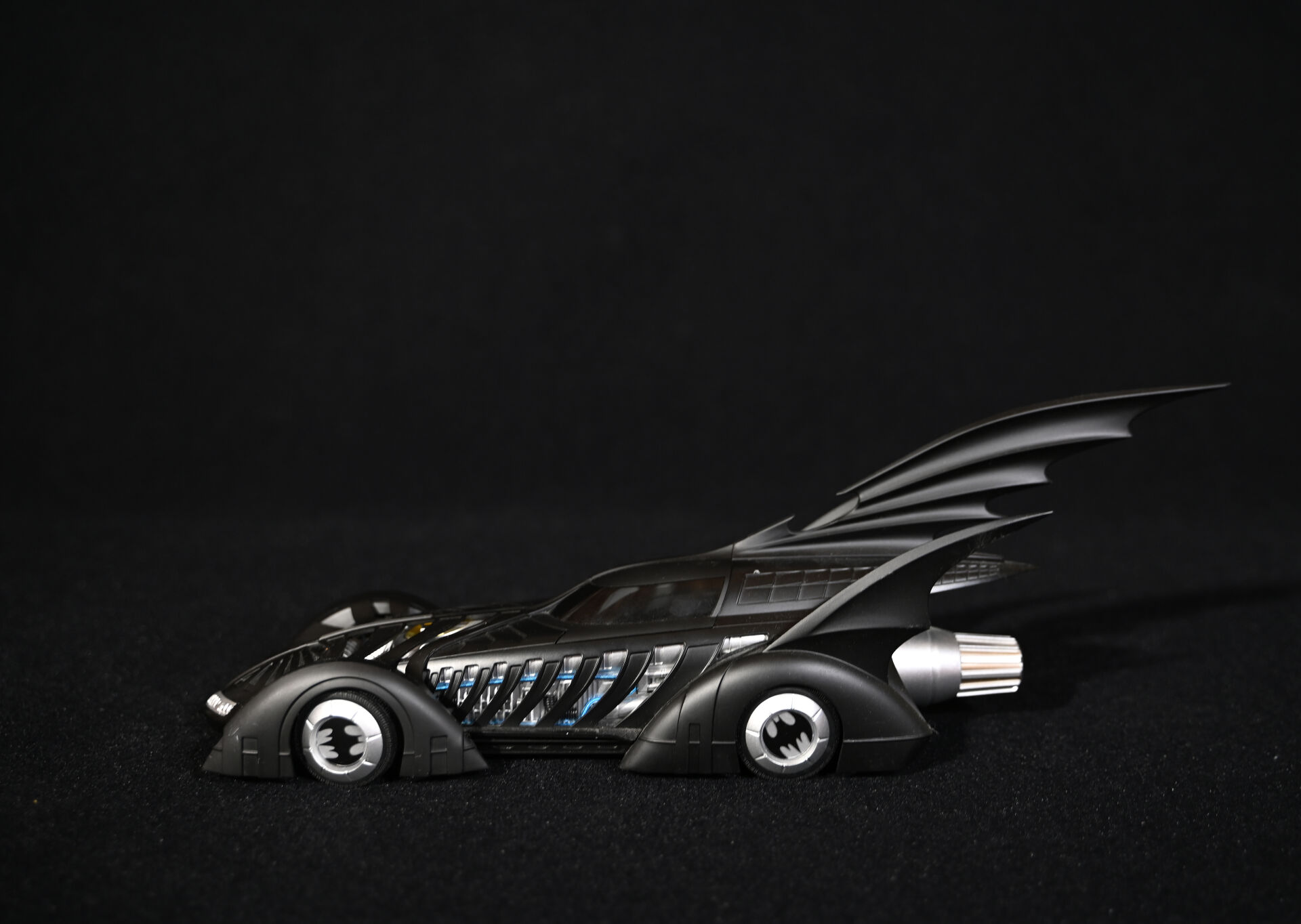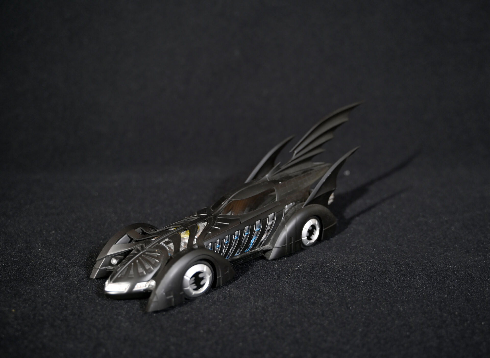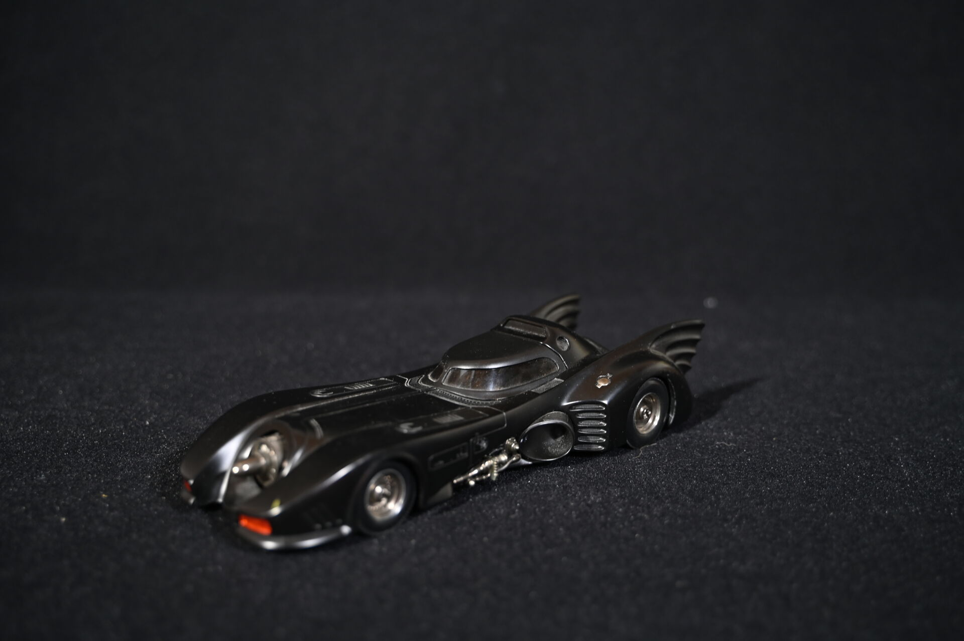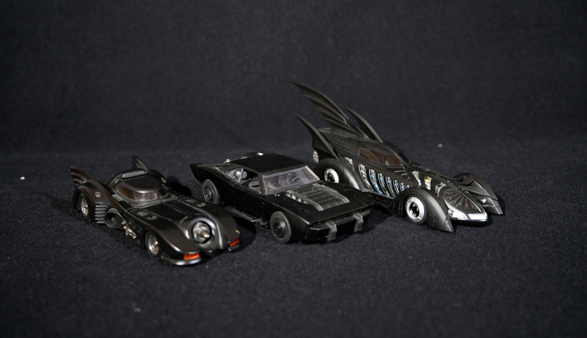 BATMAN. Ensemble de trois véhicules Batmobiles issus de générations différentes. Marques MATTEL HOTWHEELS (une de 2014) et JADA TOYS (échelle 1/18 et électrifiée piles). Dim. de la plus haute : 15 x 43 cm.