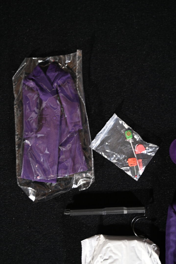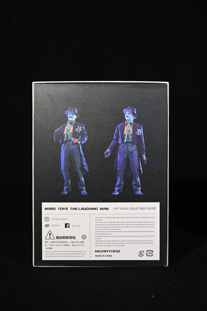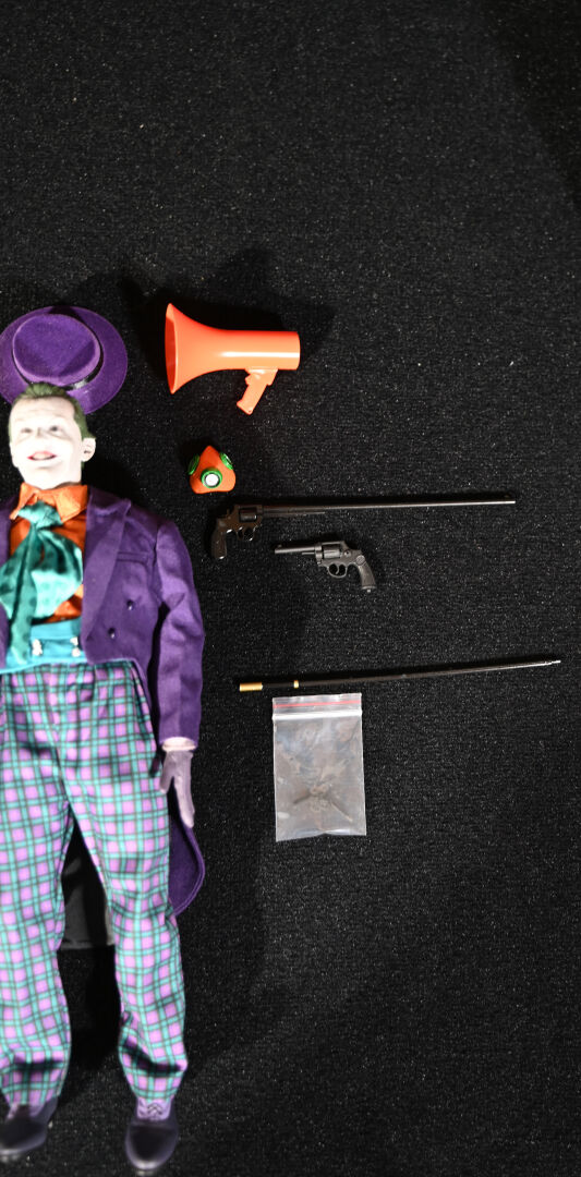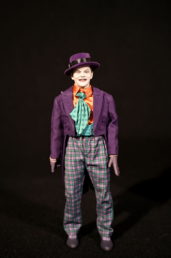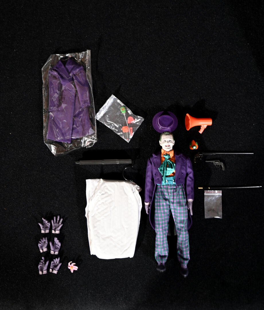 BATMAN – MARS TOYS. Figurine réaliste du Joker « The Laughing Man » avec les traits de Jack Nicholson et ses accessoires, notamment gants, pistolets, fleur et canne. Référence NO.MAT002. Échelle 1/6. Haut. : 31 cm. Aucune information sur la complétude.