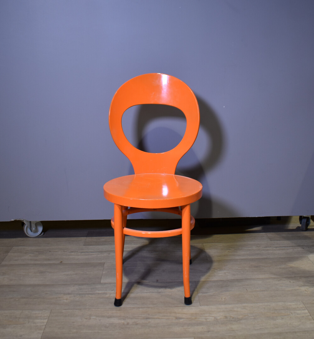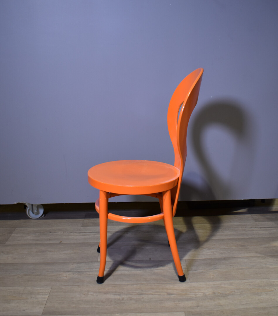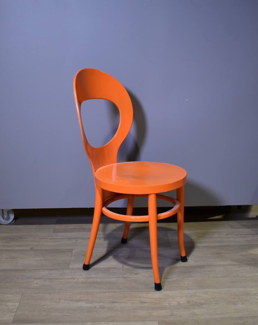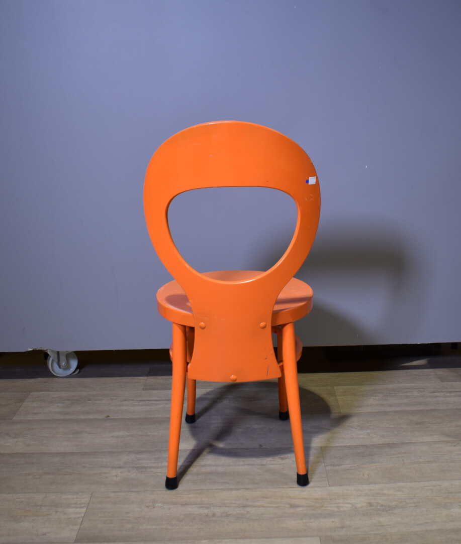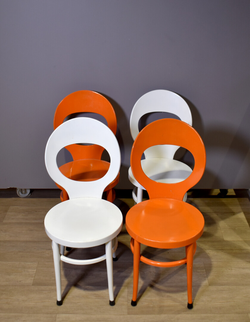 BAUMANN. Ensemble de quatre chaises modèle « Mouette », soit deux blanches et deux oranges (quelques légères usures). Haut. : 89 cm.