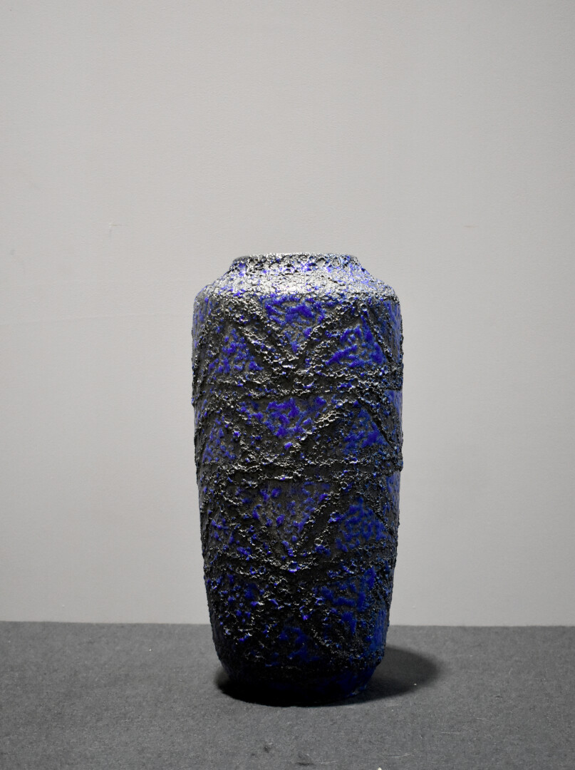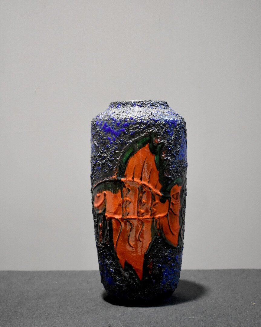 BAY KERAMIK – WEST GERMANY. Grand vase fuseau en céramique émaillée à concretions à décor d’un poisson rouge et vert sur fond noir et bleu. Milieu du XXe siècle. Haut. : 45,5 cm.