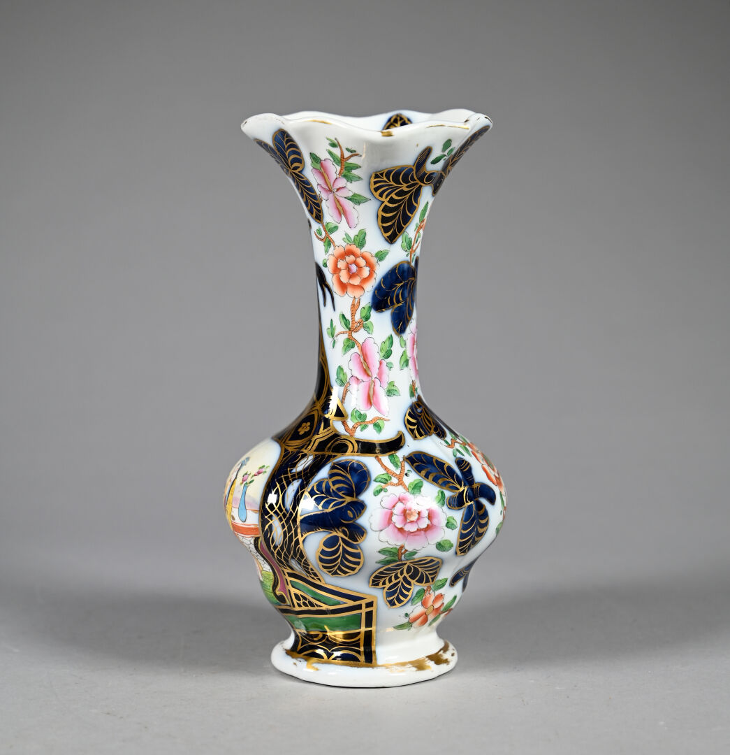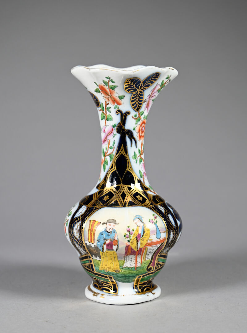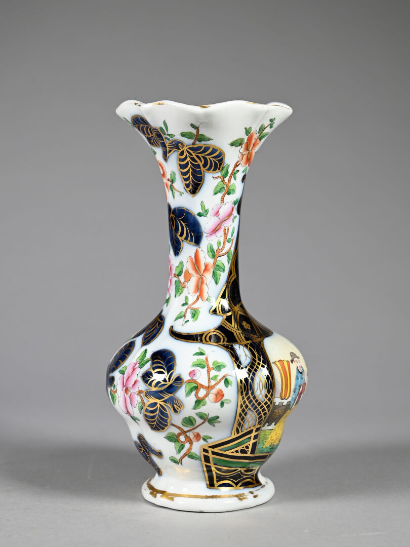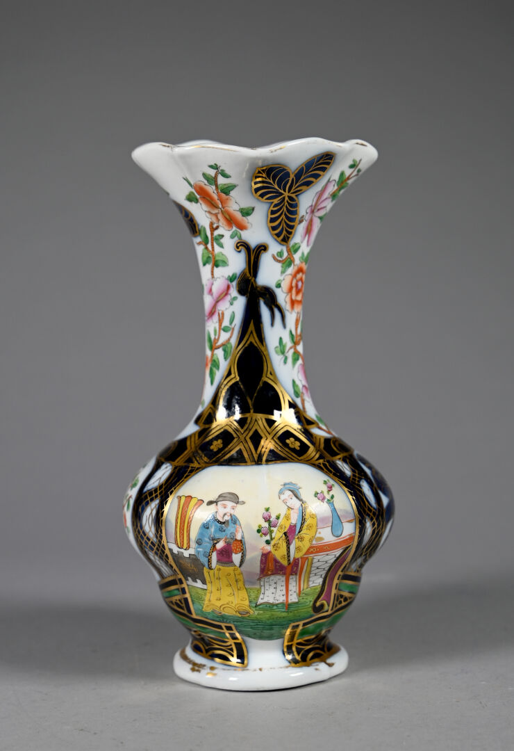 BAYEUX, manufacture RUAUD. Vase à haut col cornet en porcelaine à décor en polychromie d’une scène dans le goût asiatique sur fond de fleurs (fèle de cuisson). Marqué en creux au dessous. Haut. : 29 cm.