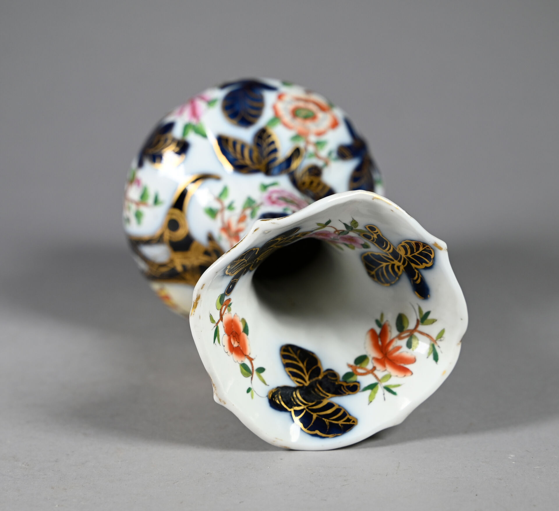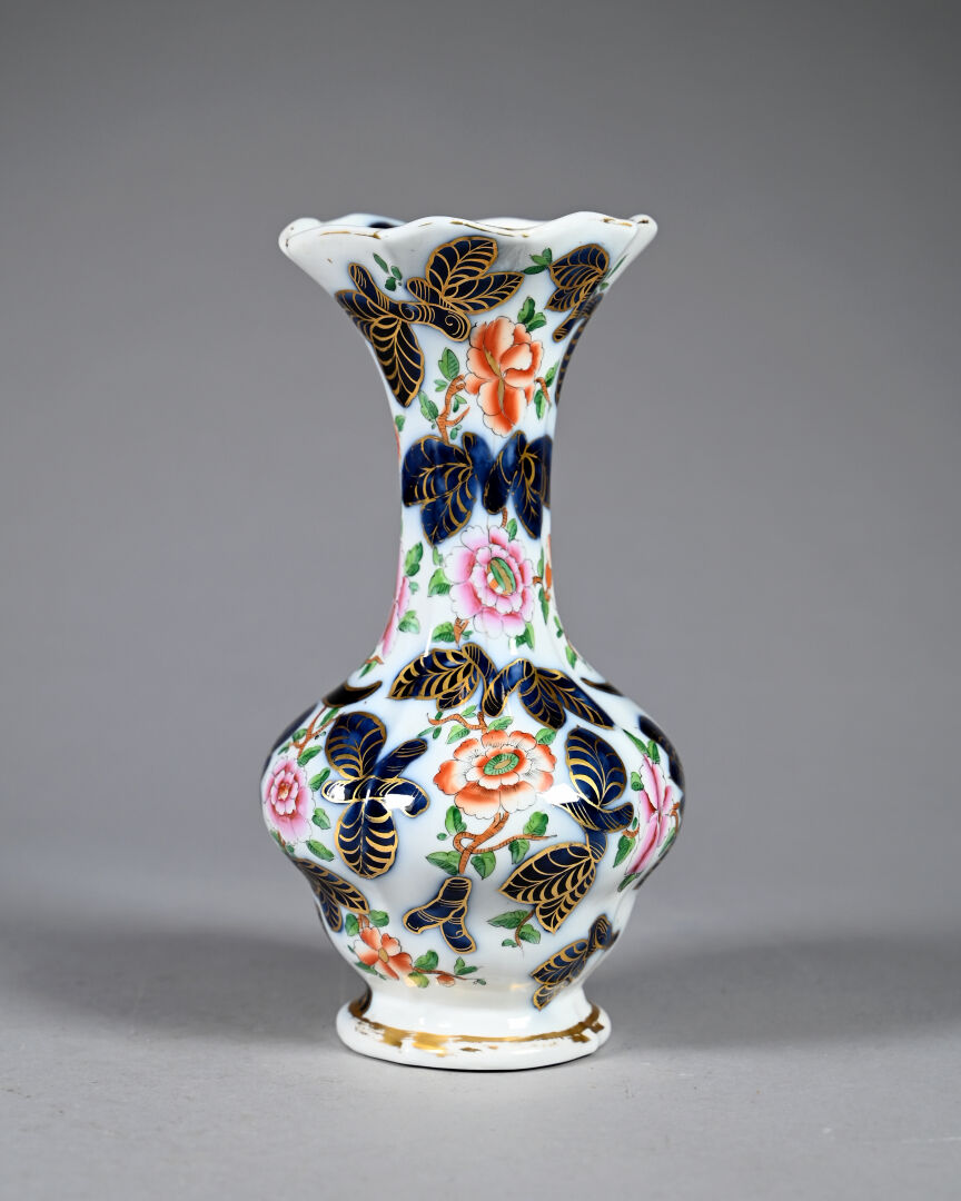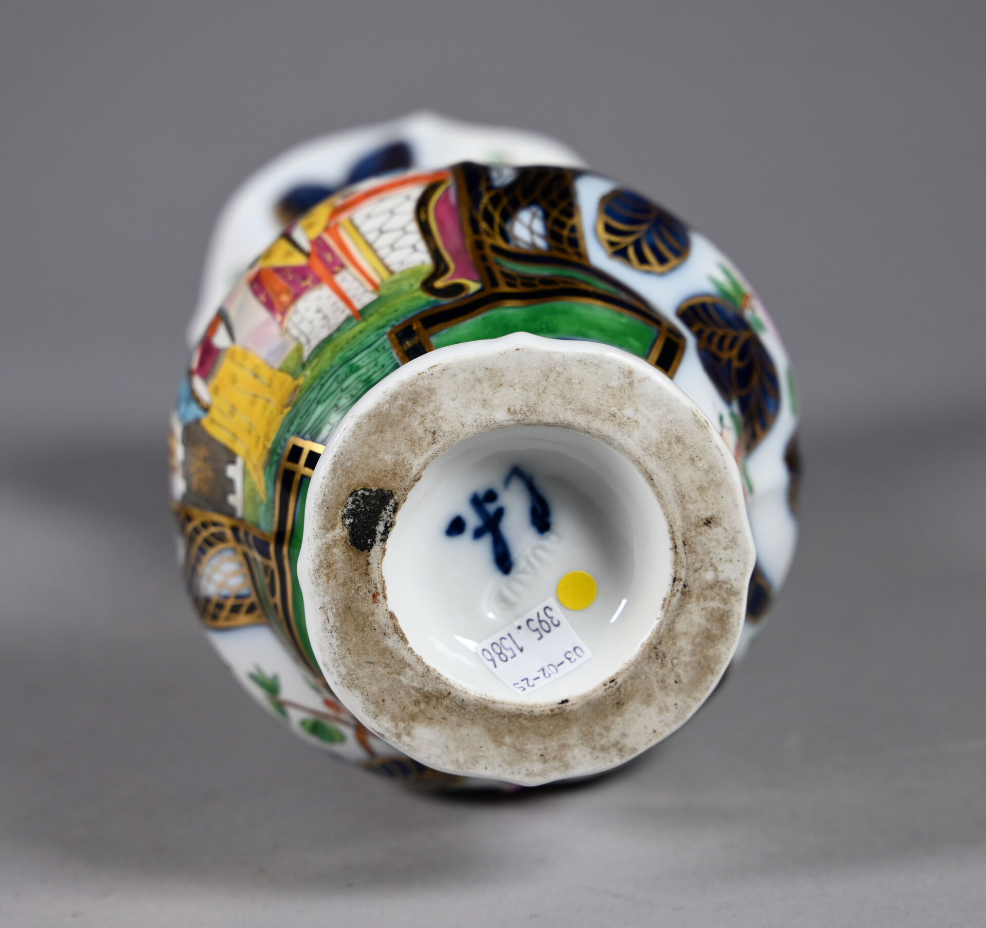 BAYEUX, manufacture RUAUD. Vase à haut col cornet en porcelaine à décor en polychromie d’une scène dans le goût asiatique sur fond de fleurs (fèle de cuisson). Marqué en creux au dessous. Haut. : 29 cm.
