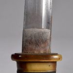 Beau wakizashi japonais au fourreau annelé en laque brune tsuka habillée de samé et d’un tressage de soir bleu nuit, lame sans défauts de forge ni « kitzu », traces de polissage léger de la lame. Fourreau avec son Kozuka, poignée bronze à décors d’affrontement de samouraïs. Longueur total : 400mm. Japon XVIIIeme siècle.