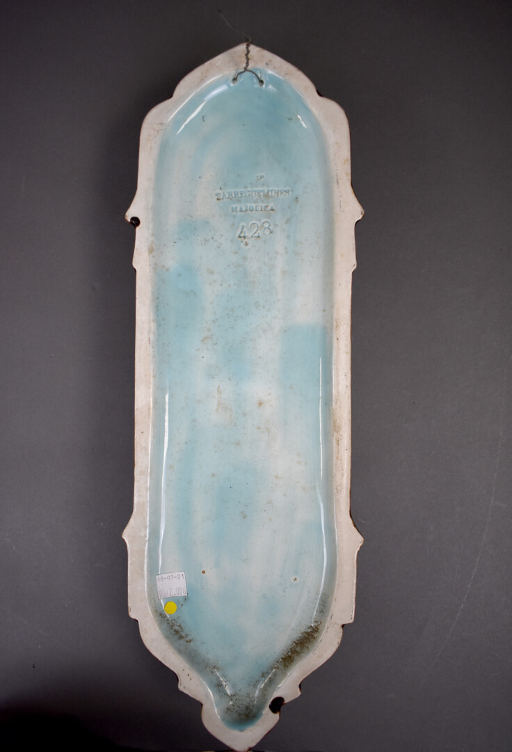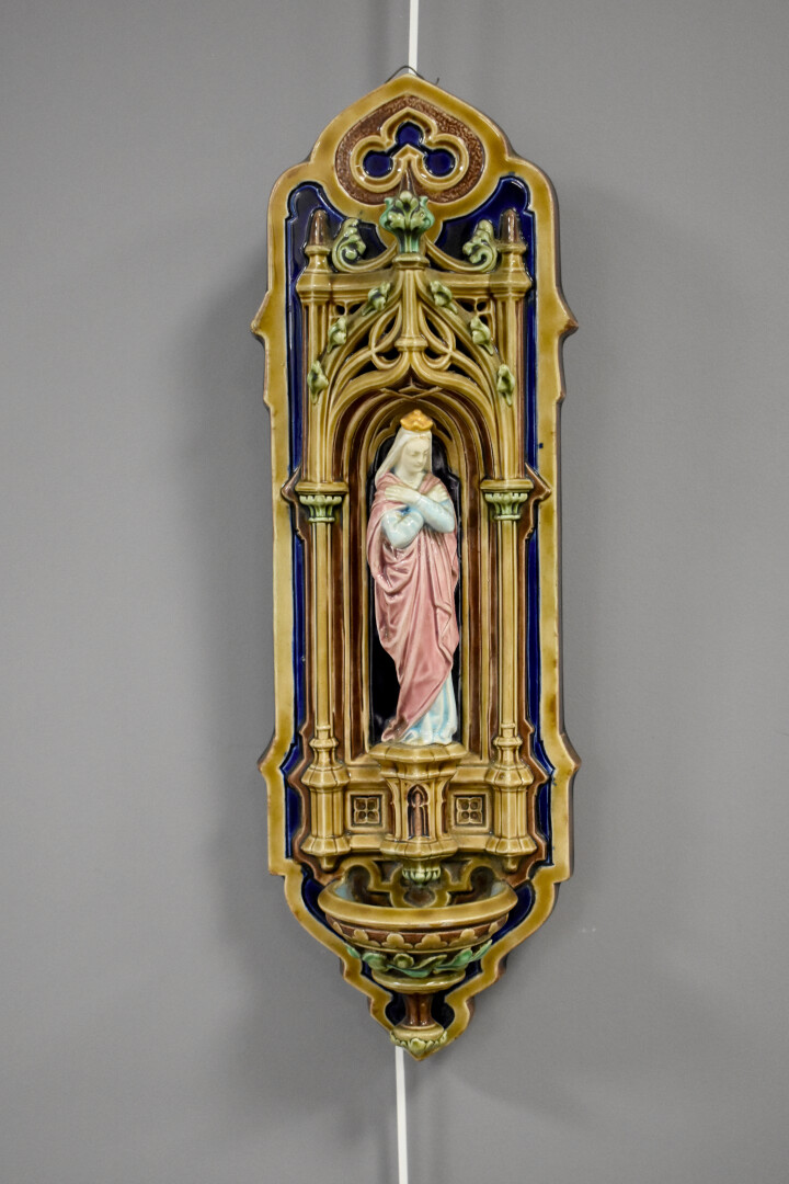 Bénitier en faïence de SARREGUEMINES (un cheveu en bas de la robe de la Vierge). Vers 1900. Marqué sous la base Majolica. Haut. : 48 cm.
