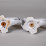 Benjamin RABIER (1864-1939). Deux salières publicitaires en porcelaine en forme de baleine. Signées. Haut. : 9 cm.