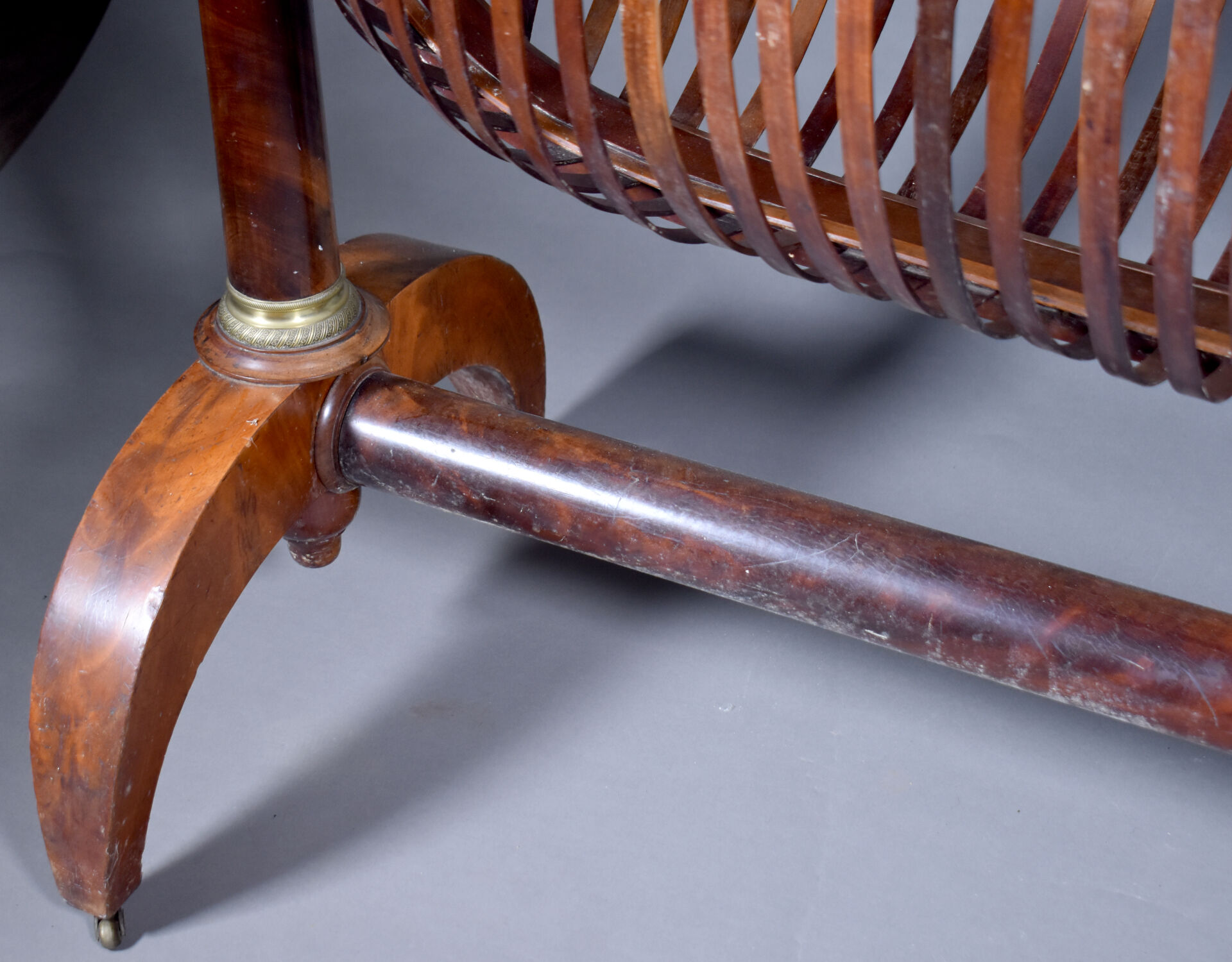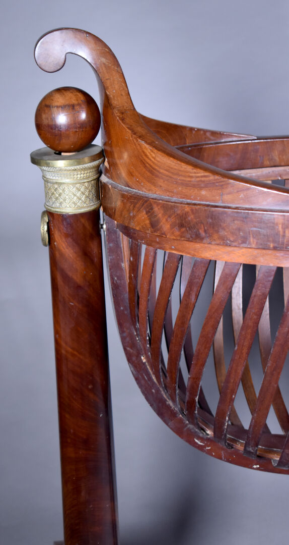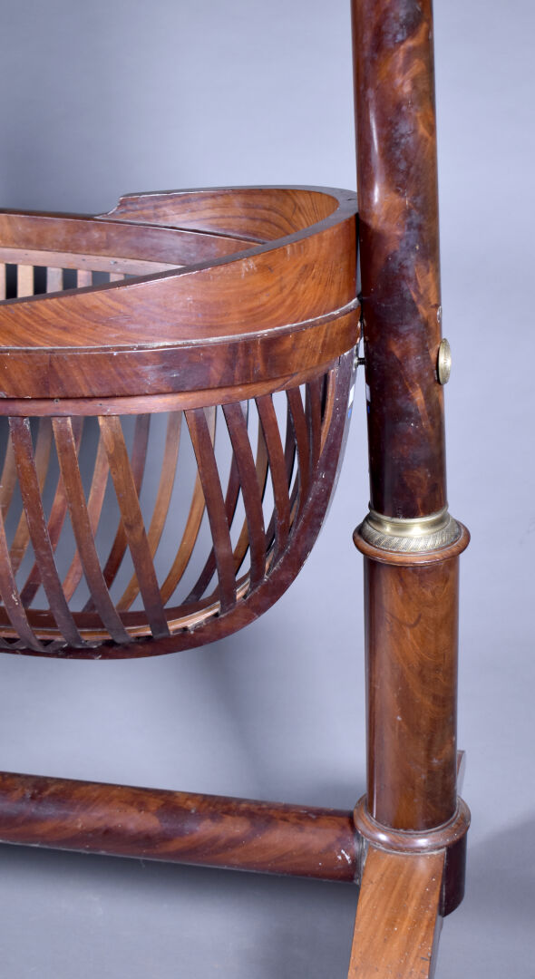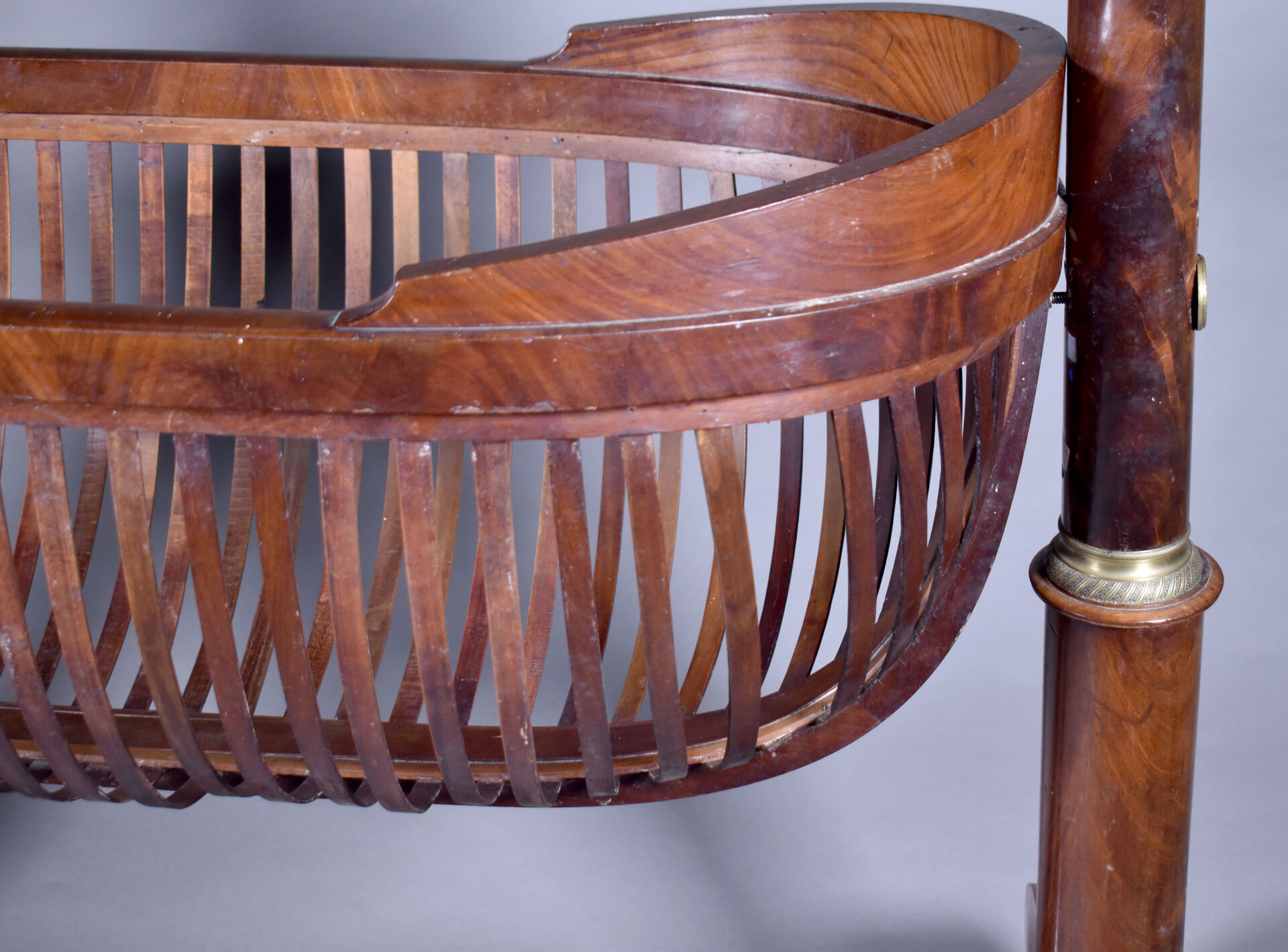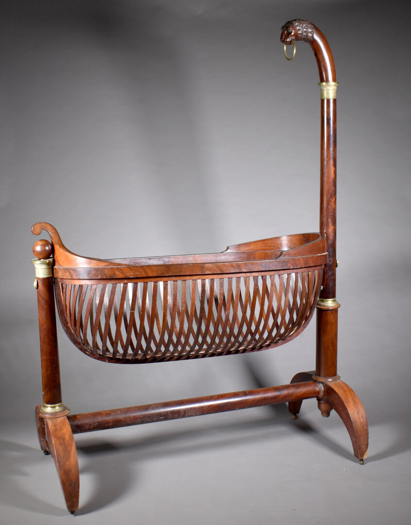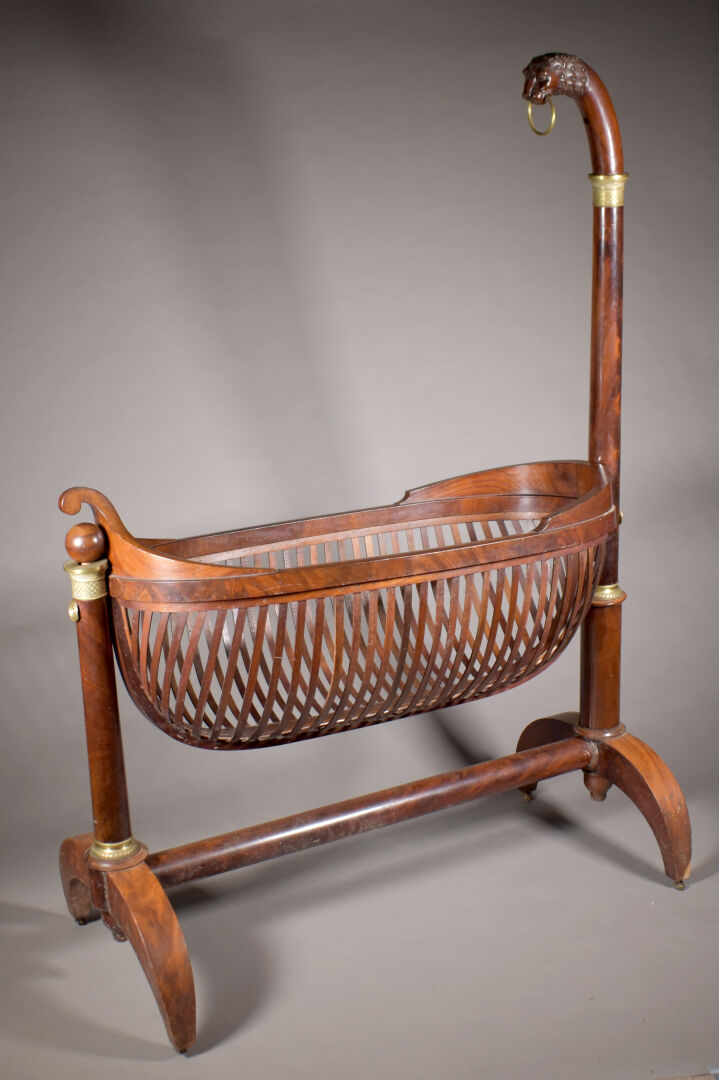 Berceau en acajou et placage d’acajou, sommé d’une tête de lion (usures et petits sauts de placage, manque une latte). Epoque Empire. Haut. : 173 cm – Larg. : 133 cm – Prof. : 54 cm.