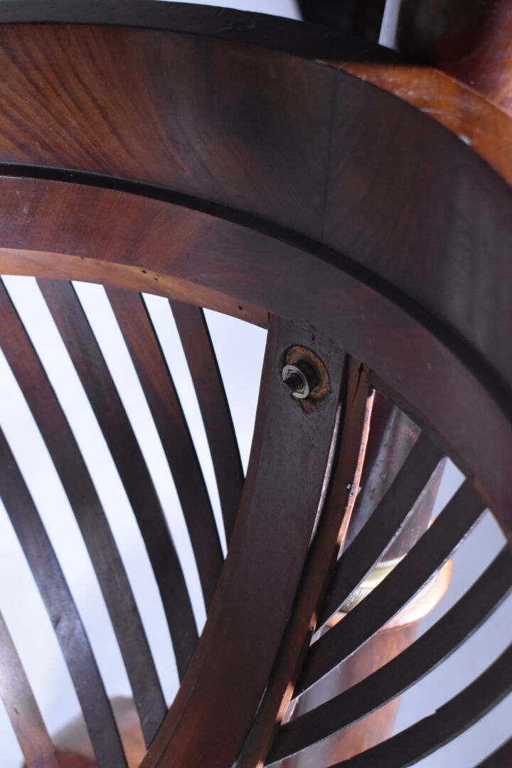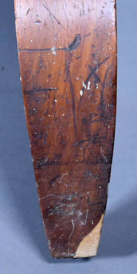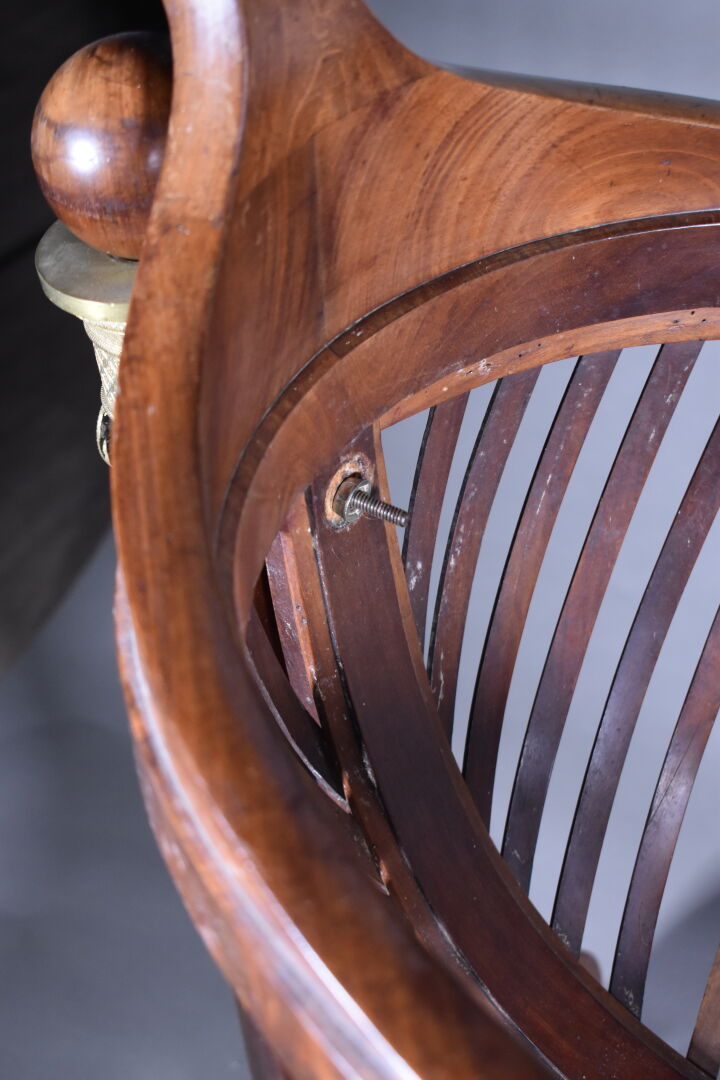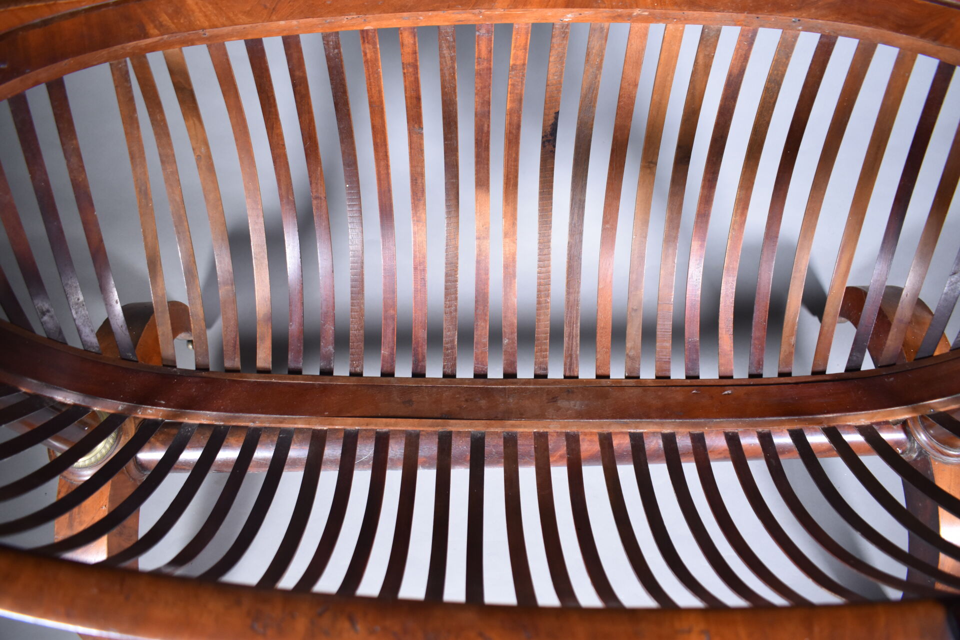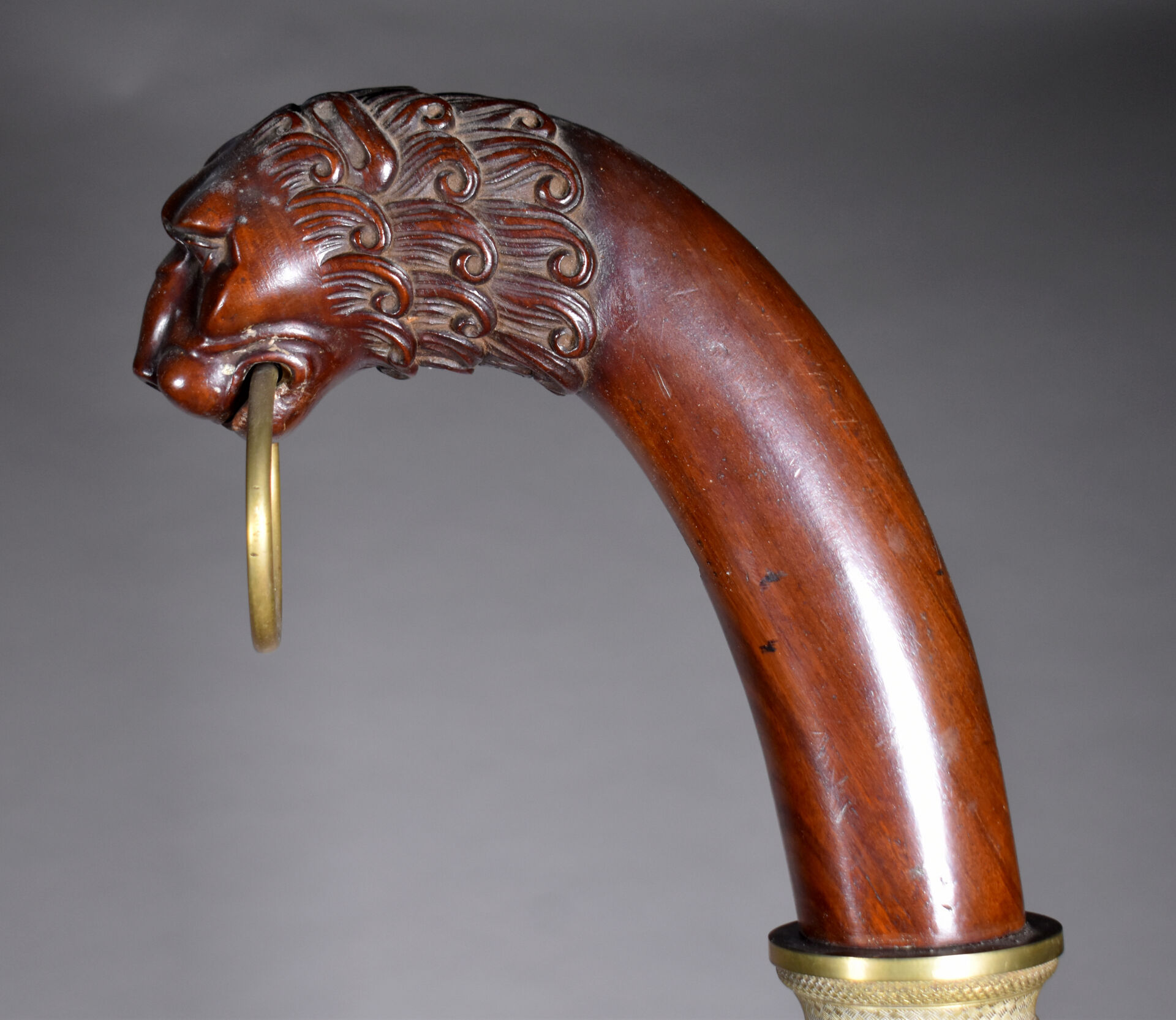 Berceau en acajou et placage d’acajou, sommé d’une tête de lion (usures et petits sauts de placage, manque une latte). Epoque Empire. Haut. : 173 cm – Larg. : 133 cm – Prof. : 54 cm.