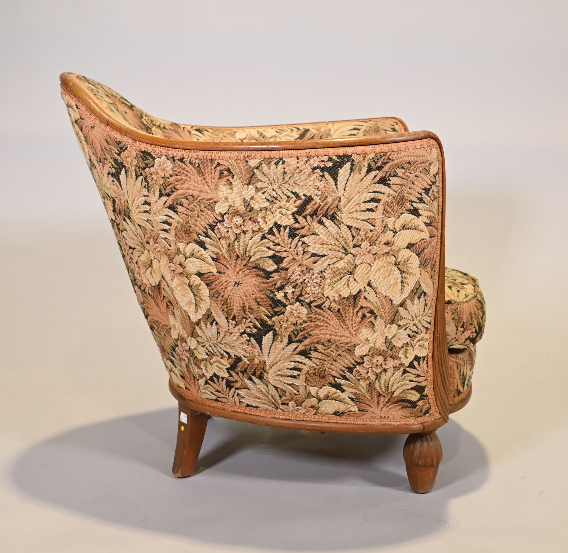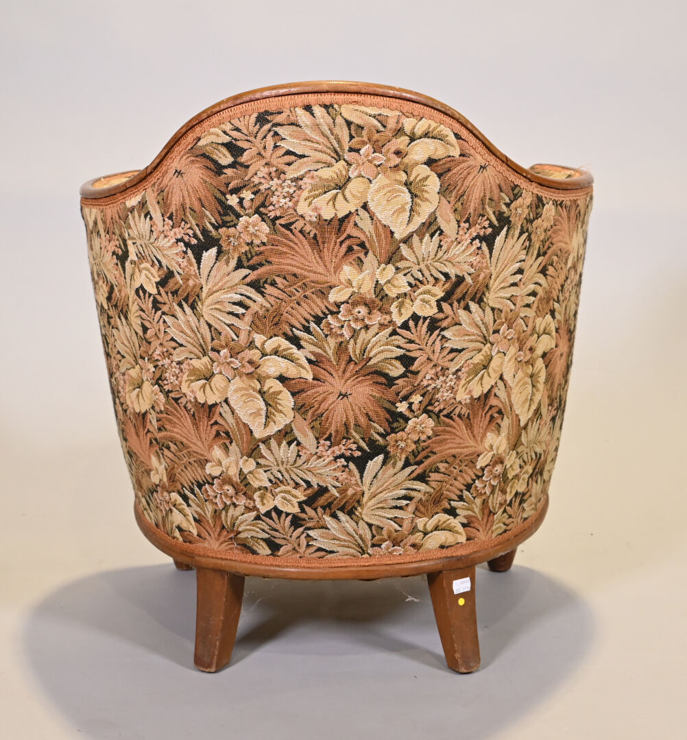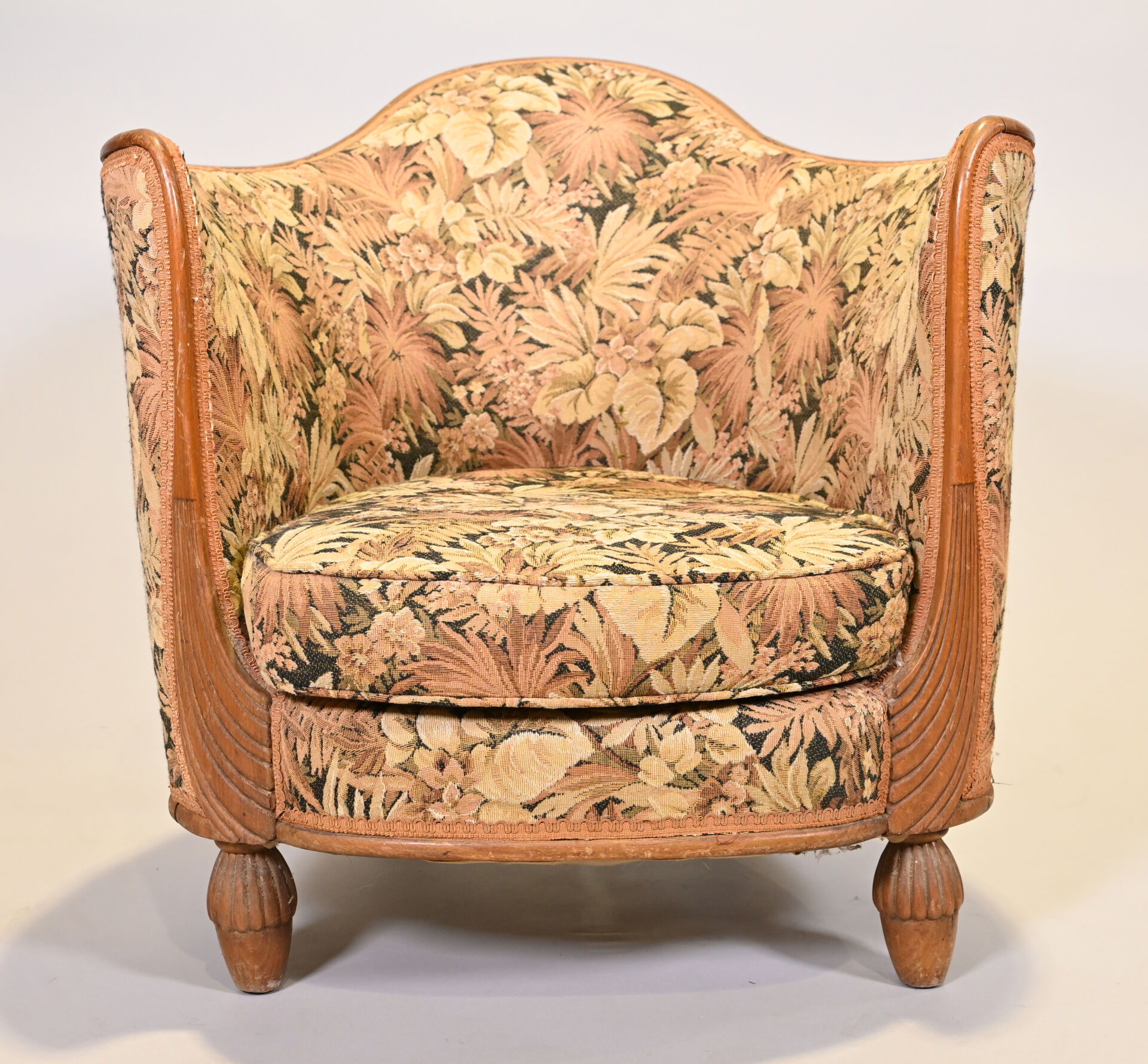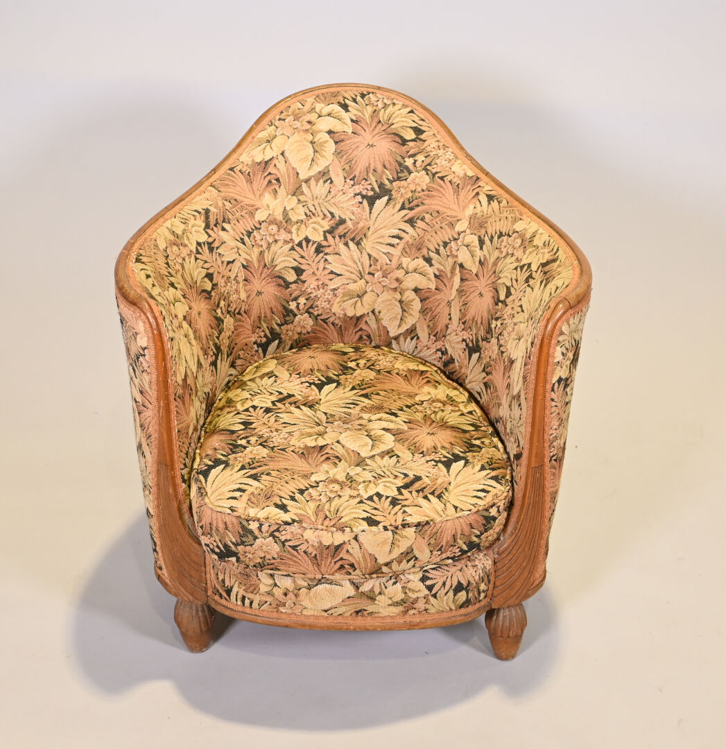 Bergère chauffeuse en bois sculpté; les pieds à godrons. Epoque Art déco. garniture de tissu fleuri dans les camaïeu d’ocre. Haut. : 70,5 cm.