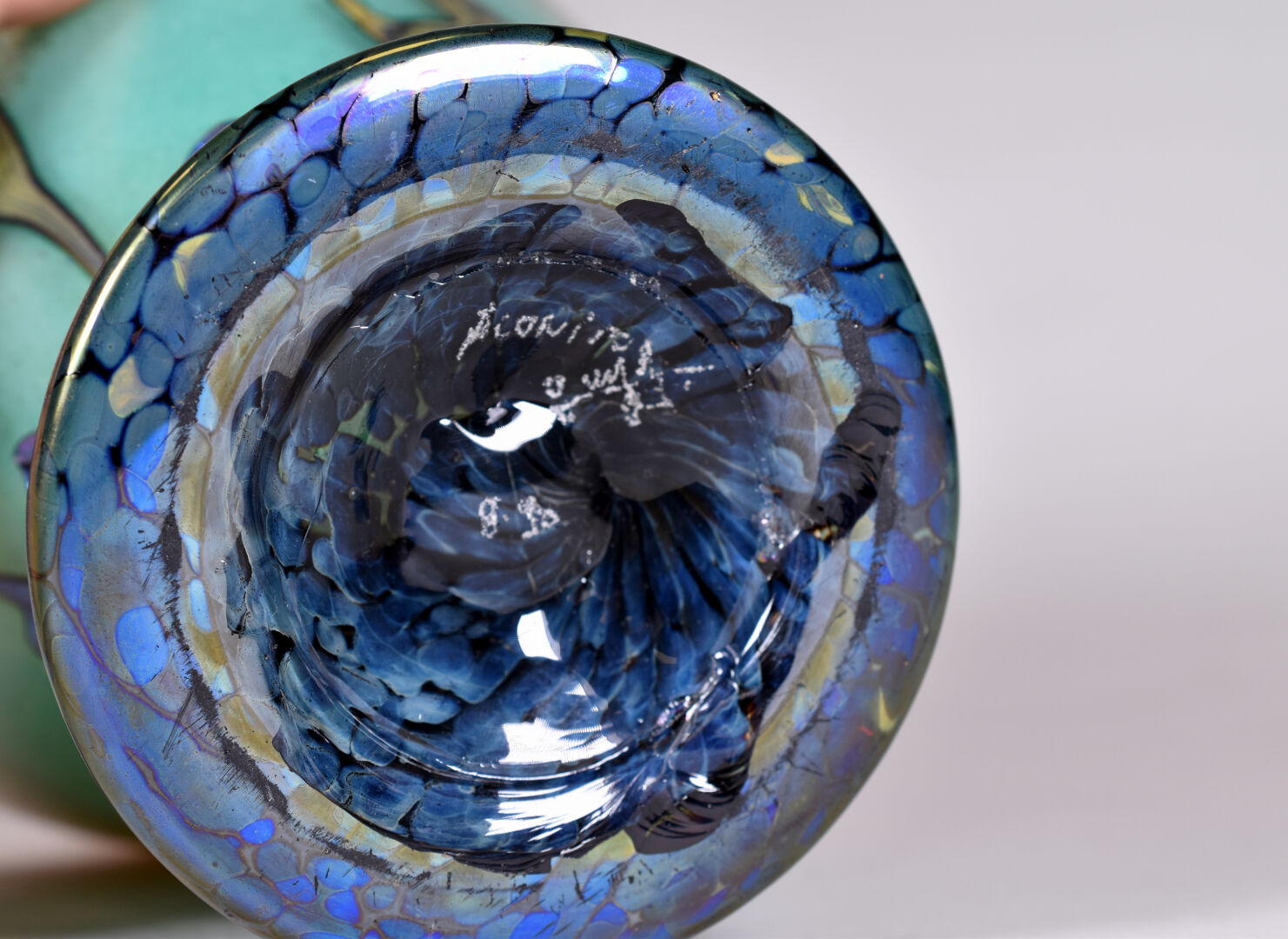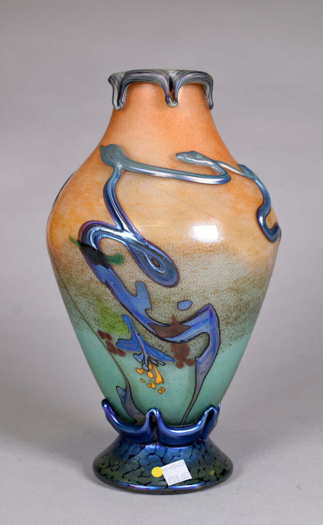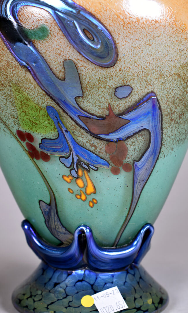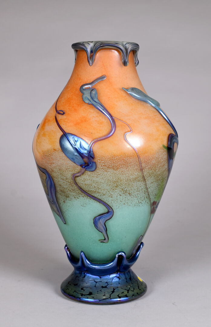 Bernard ACONITO (XXe siècle) à BIOT. Vase balustre à col rétréci émaillé en orange et bleu métallique. Signé à la pointe au dessous. Haut. : 32 cm.