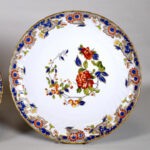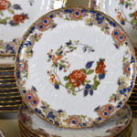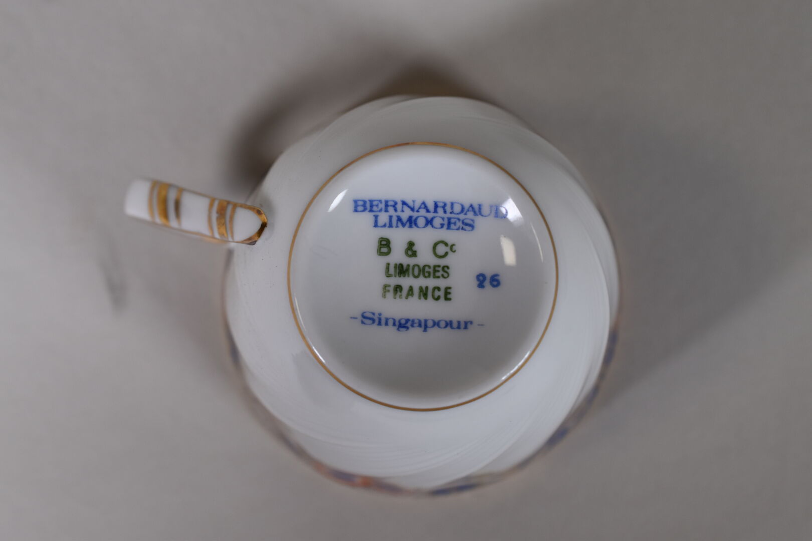 BERNARDAUD Limoges. Service de table modèle Singapour à décor de fleurs en polychromie et dorure comprenant 12 grandes assiettes, 12 assiettes creuses, 12 assiettes à entremets, 12 bols à bouillon, et leur dessous, 12 tasses à thé et leur sous tasse, 12 tasses à café et leur sous tasse, 2 raviers 1 saucière à fonds solidaire, 4 plats soit 2 circulaires, un à fromage et un ovale, une jatte et un saladier. Soit 117 pièces. Marqué au dessous.