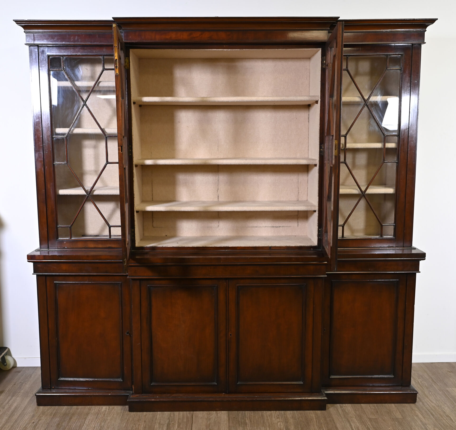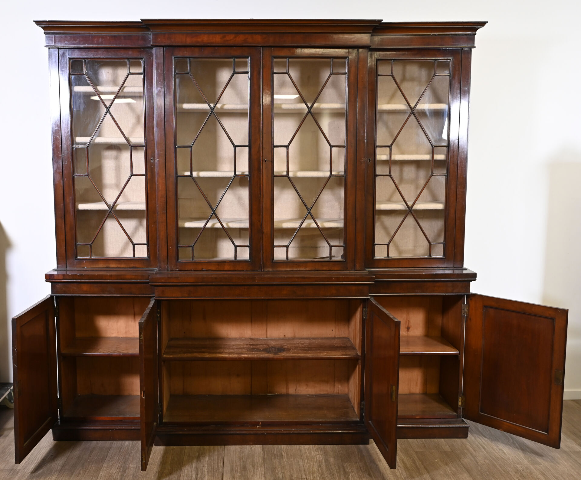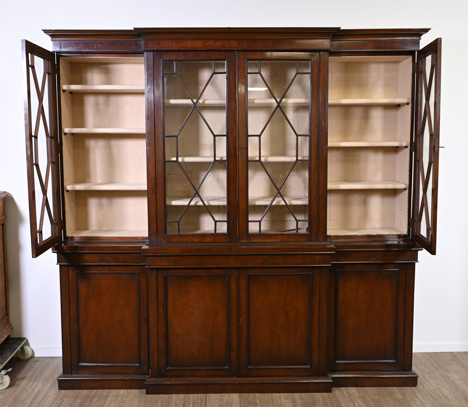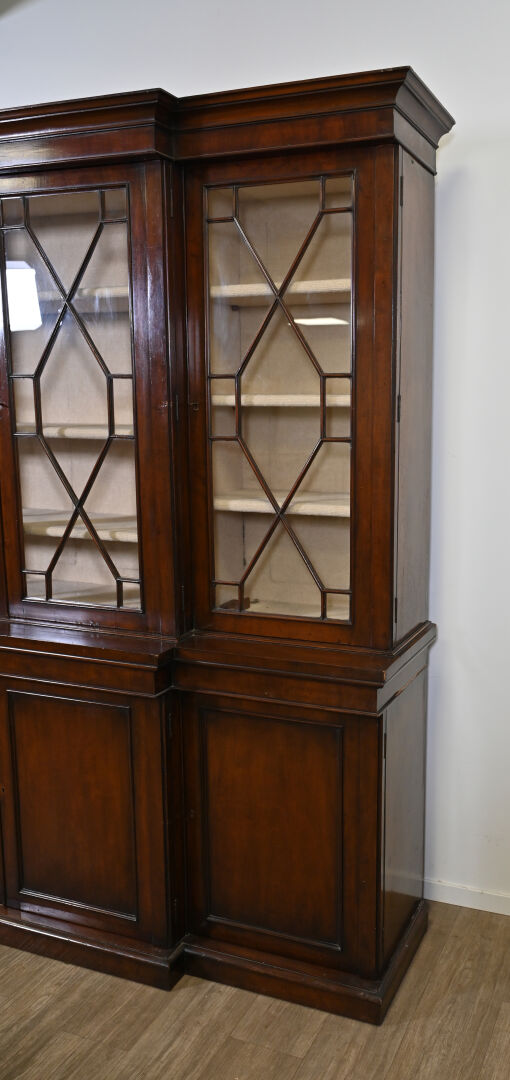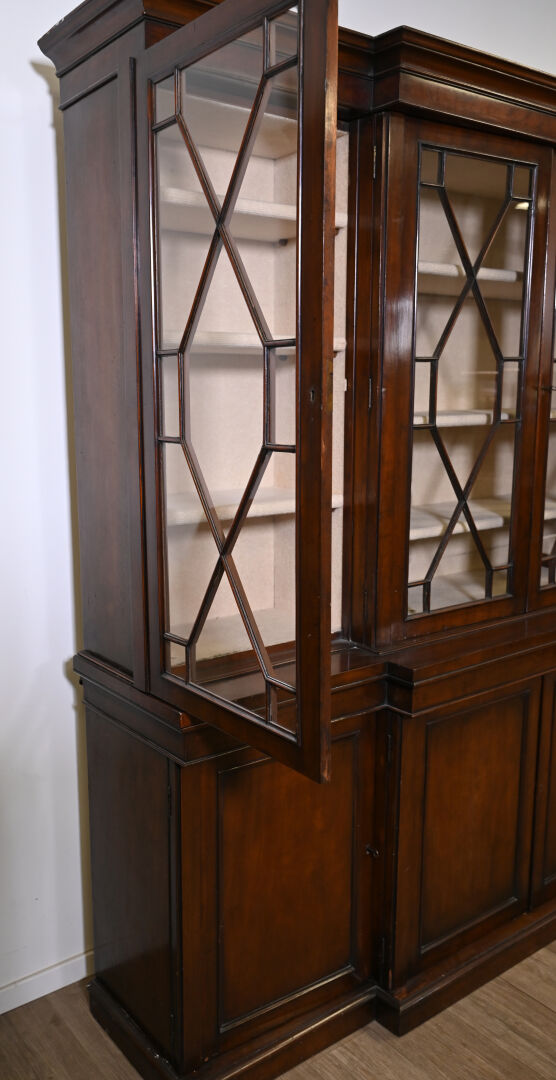 Bibliothèque/ vitrine en acajou et placage d’acajou, la façade à léger ressaut central, ouvrant à 4 vantaux vitrés à croisillons en partie haute, et quatre vantaux panneautés en partie basse (usures et petits éclats). La base en plinthe. Travail anglais du début du XXe siècle. Haut. : 223,5 cm – Larg. : 231 cm – Prof. : 55 cm.
