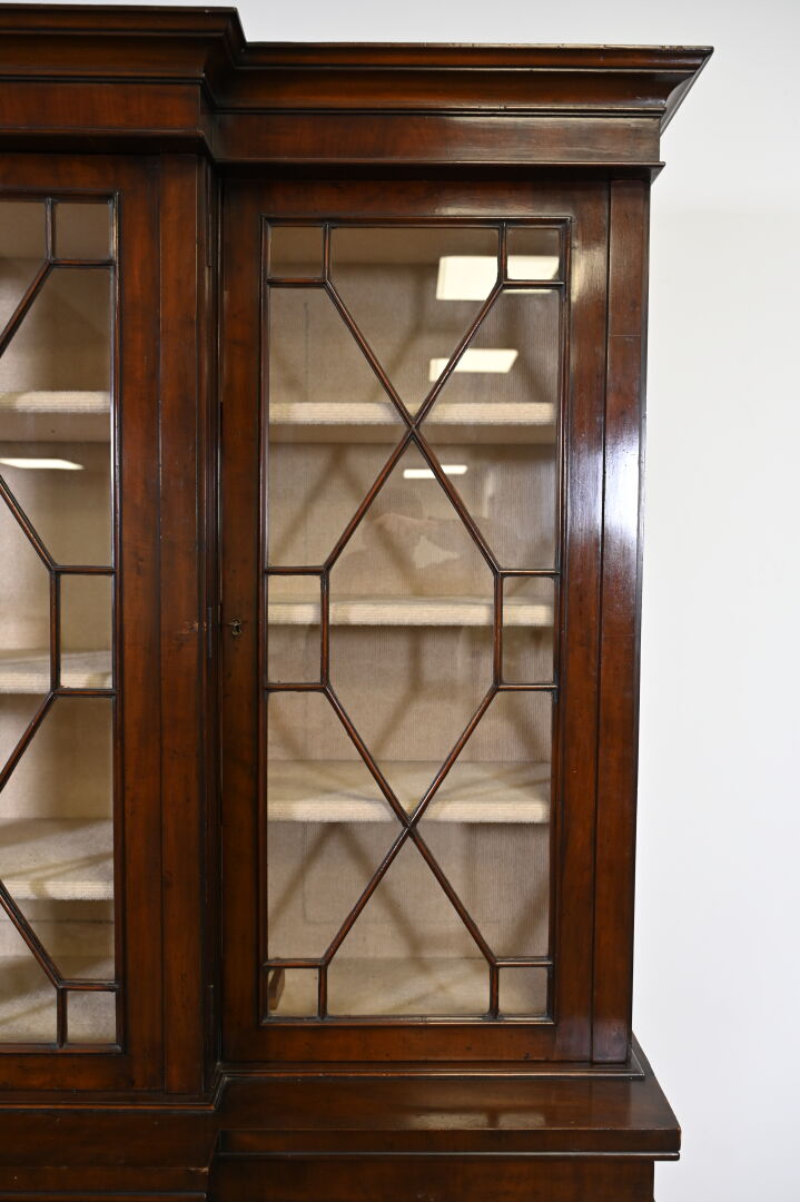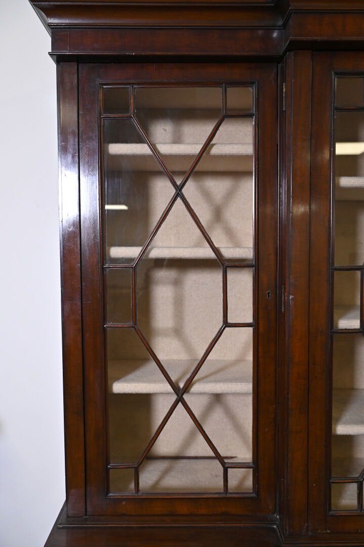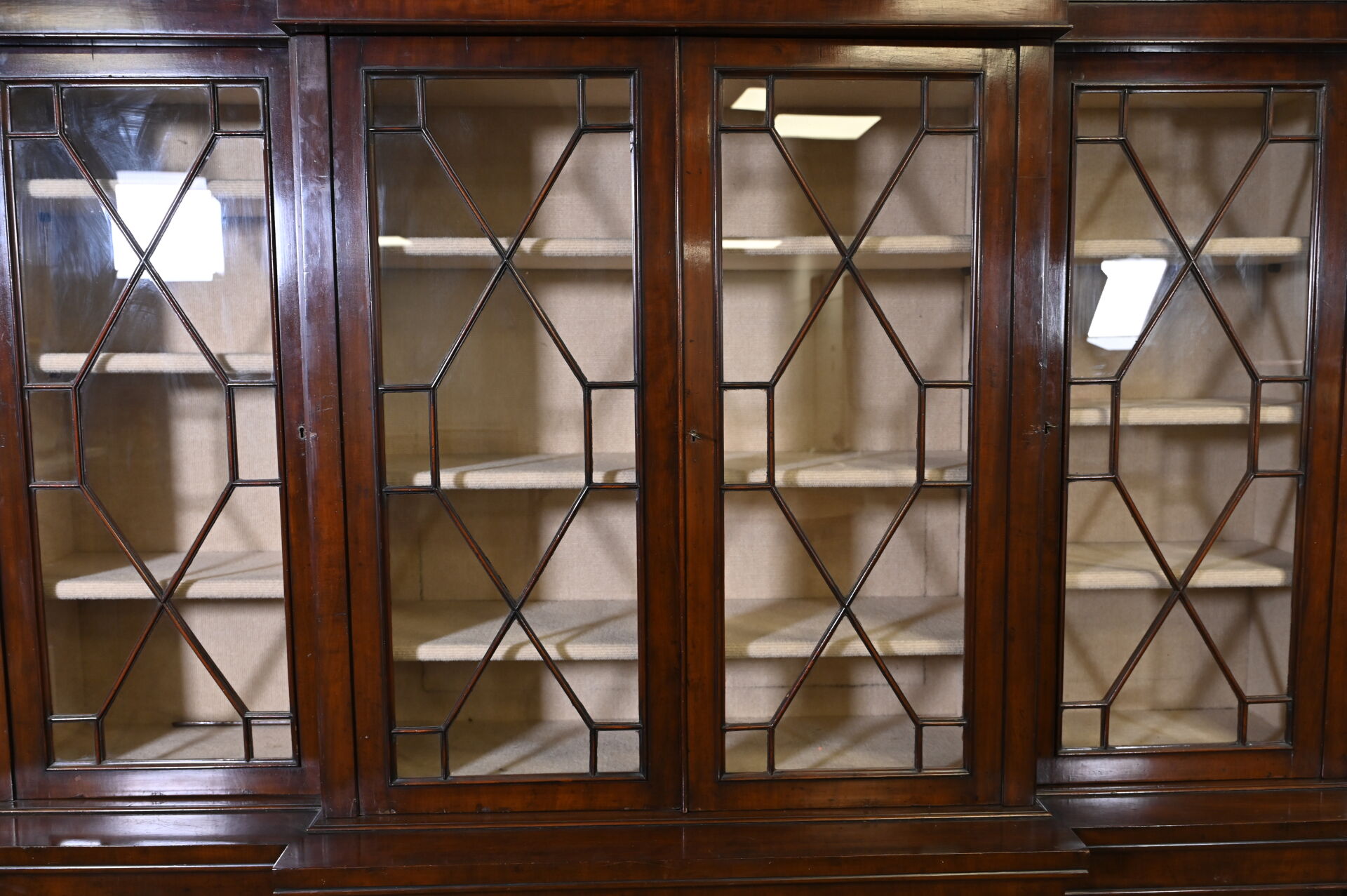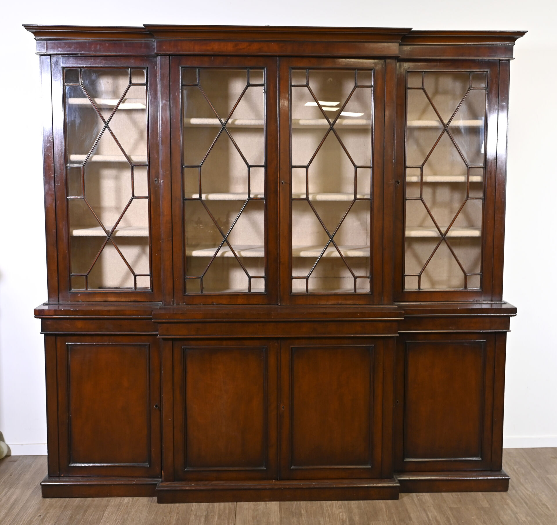 Bibliothèque/ vitrine en acajou et placage d’acajou, la façade à léger ressaut central, ouvrant à 4 vantaux vitrés à croisillons en partie haute, et quatre vantaux panneautés en partie basse (usures et petits éclats). La base en plinthe. Travail anglais du début du XXe siècle. Haut. : 223,5 cm – Larg. : 231 cm – Prof. : 55 cm.