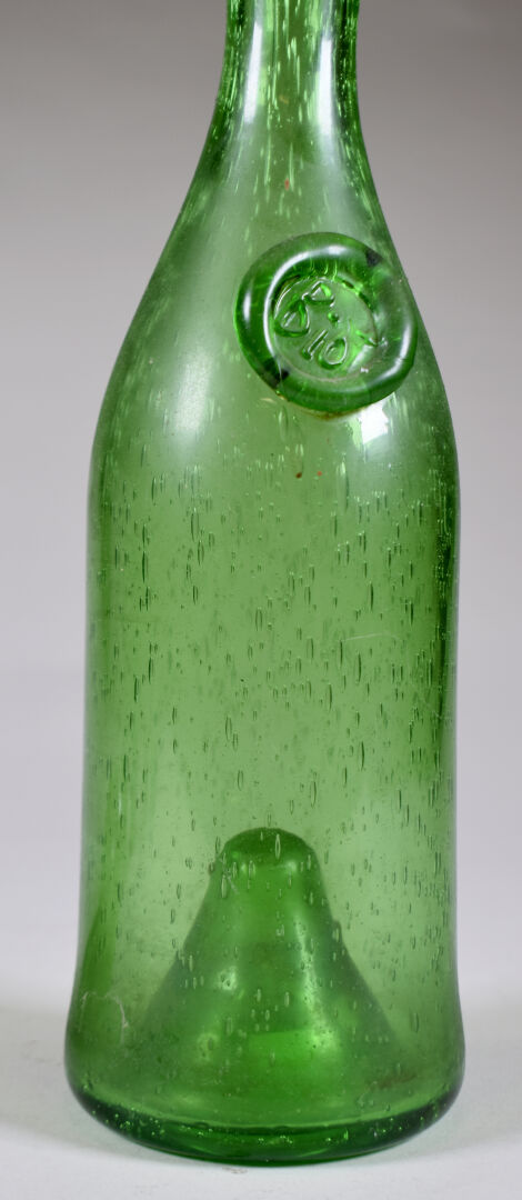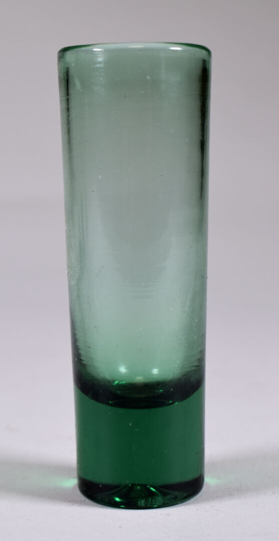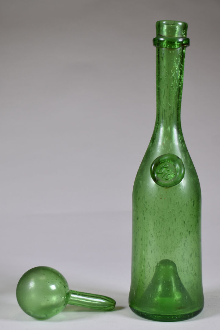 BIOT. Bouteille et son bouchon en verre vert bullé. Marquée. Haut. : 42,5 cm. On joint une suite de 4 verres à shot en verre vert.