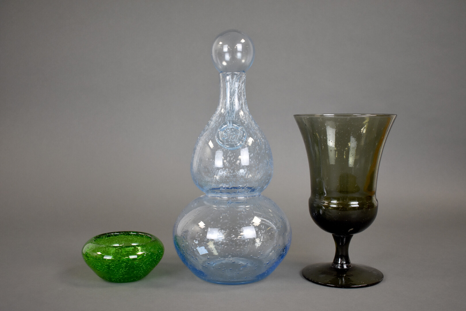 BIOT. Flacon à double bulbe en verre bullé bleu. Avec son bouchon. On joint un vase cornet sur piédouche en verre bullé fumé et un cendrier en verre bullé vert. Haut. : 37,5 cm – Haut. : 24,5 cm.