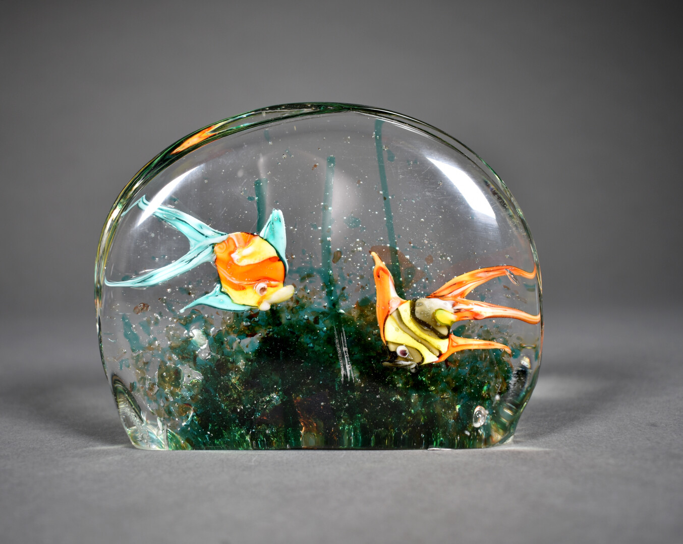 Bloc « aquarium » en verre polychrome à décor de deux poissons. Murano ? XXe siècle. Haut. : 10 cm.