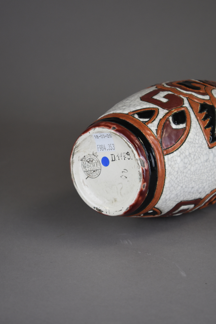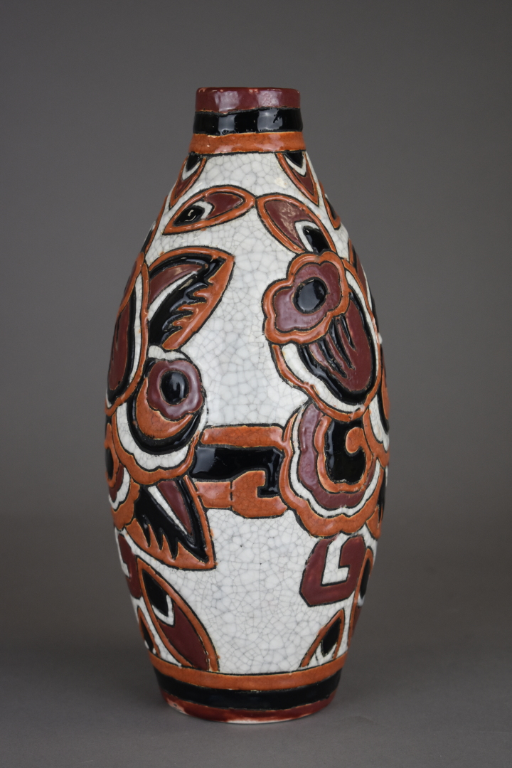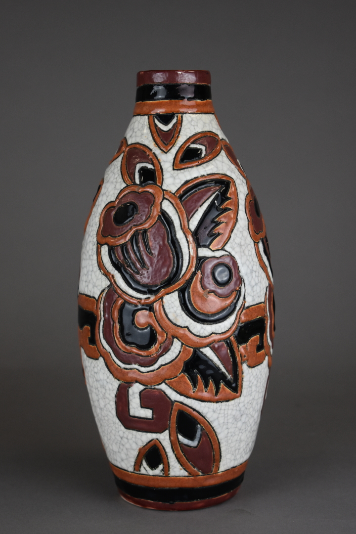 BOCH FRÈRES LA LOUVIÈRE. Vase fuselé en céramique émaillée à décor de fleurs stylisées dans les camaïeux de chocolat sur fond craquelé (petits éclats à l’émail et très léger fêle au col). Marqué, modèle D1179. Vers 1930 Haut. : 27 cm.