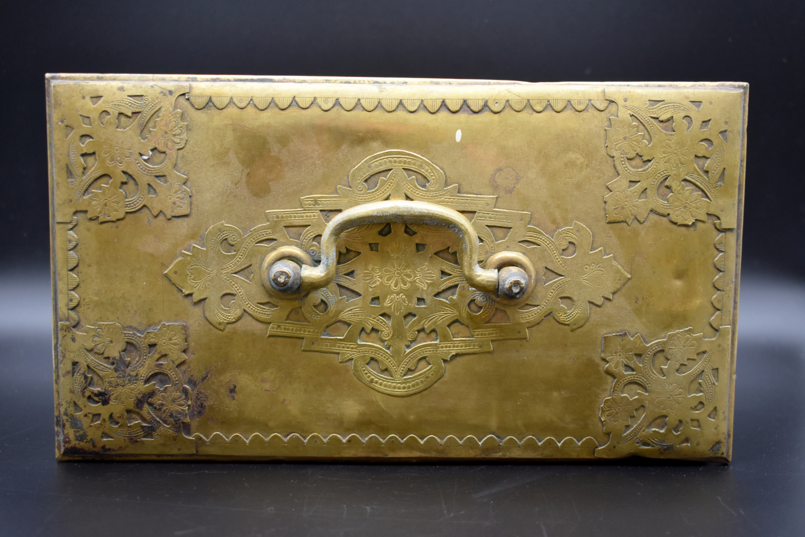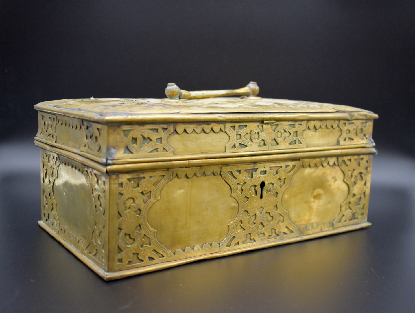 Boîte à bétel en cuivre ou laiton à déco gravé de fleurs (petits chocs). Inde. Haut. : 12 cm – Larg. : 29 cm – Prof. : 16 cm.