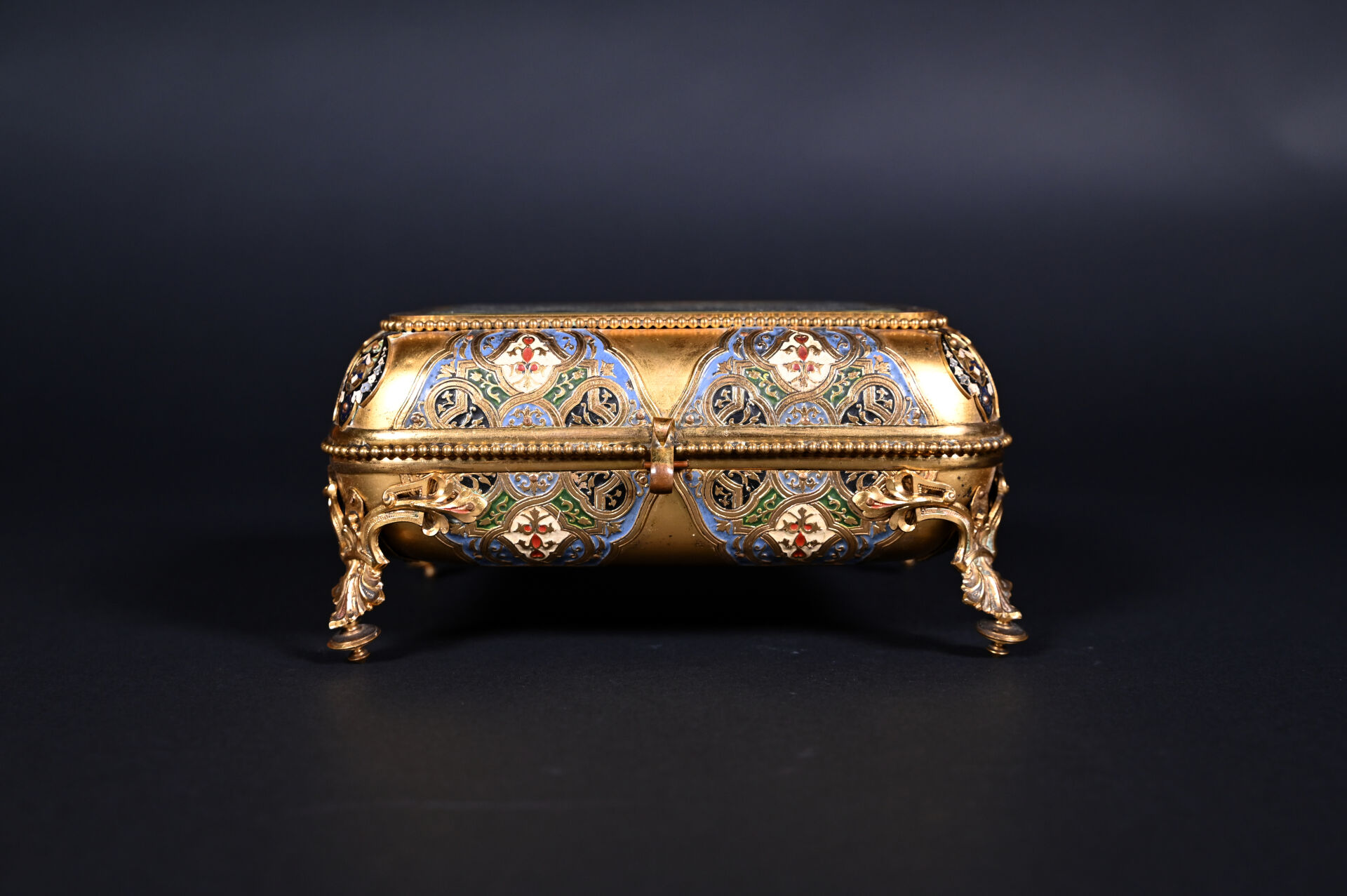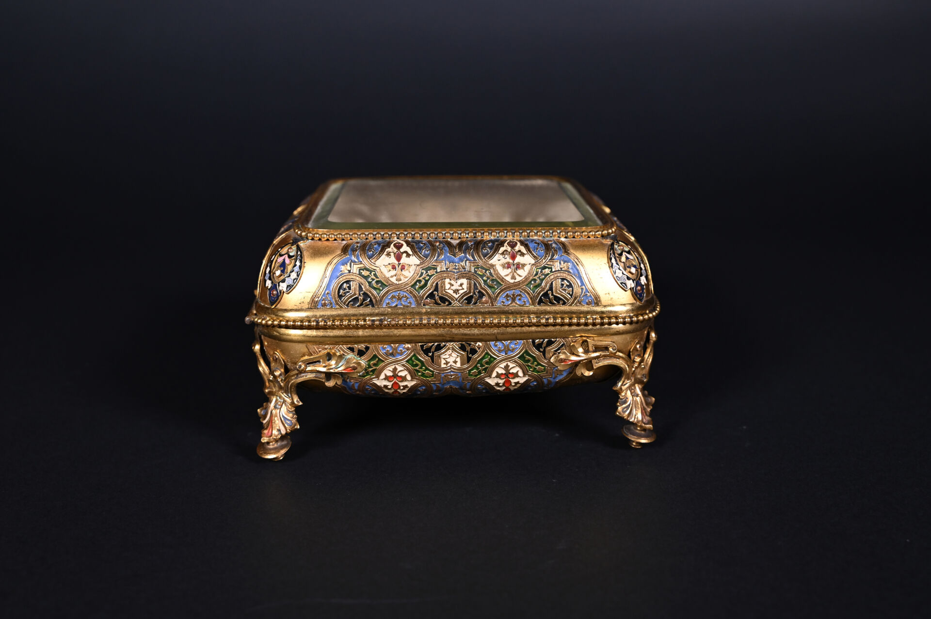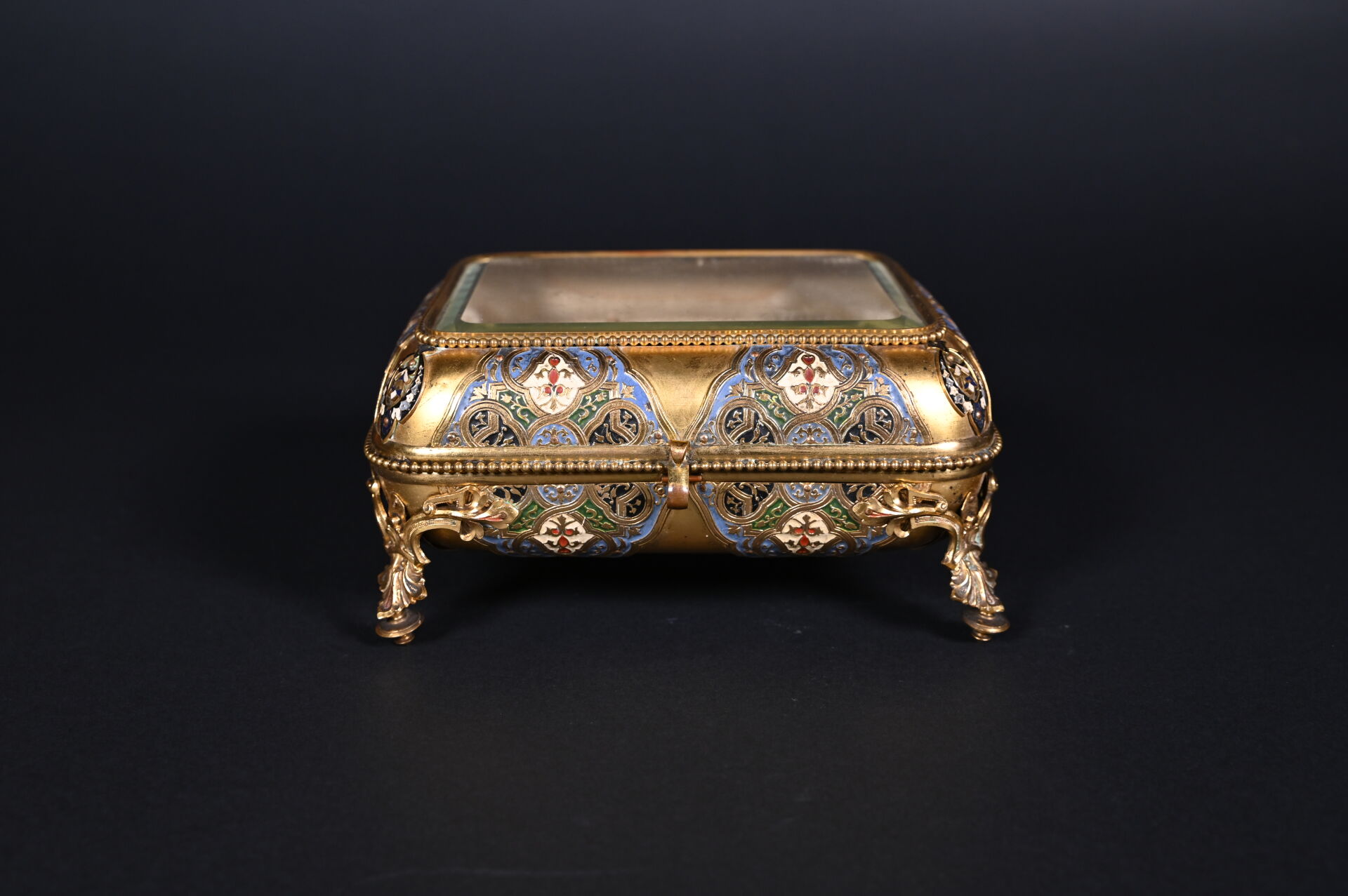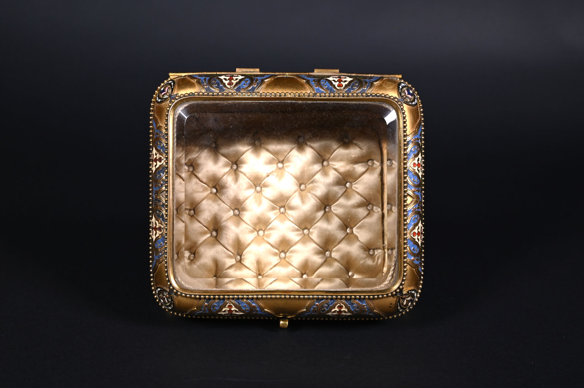 Boîte à bijoux en métal doré à décor émaillé en polychromie dans le goût perse. Le couvercle à charnières, vitré, l’intérieur en satin beige capitonné (usures, petits enfoncements et manques principalement à l’émail). Epoque Napoléon III. Haut. : 10,5 cm – Larg. : 21 cm – Prof. : 19 cm.