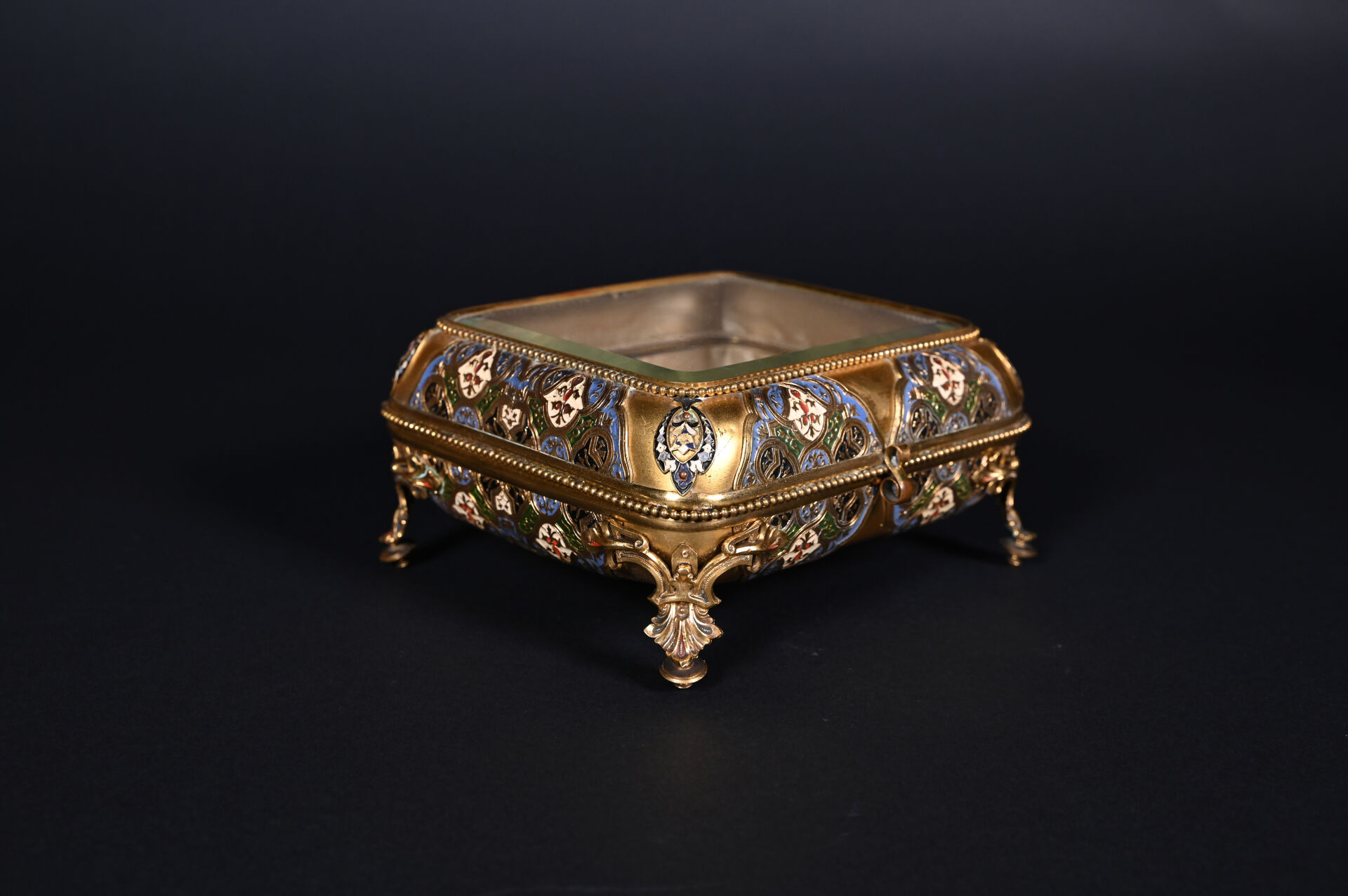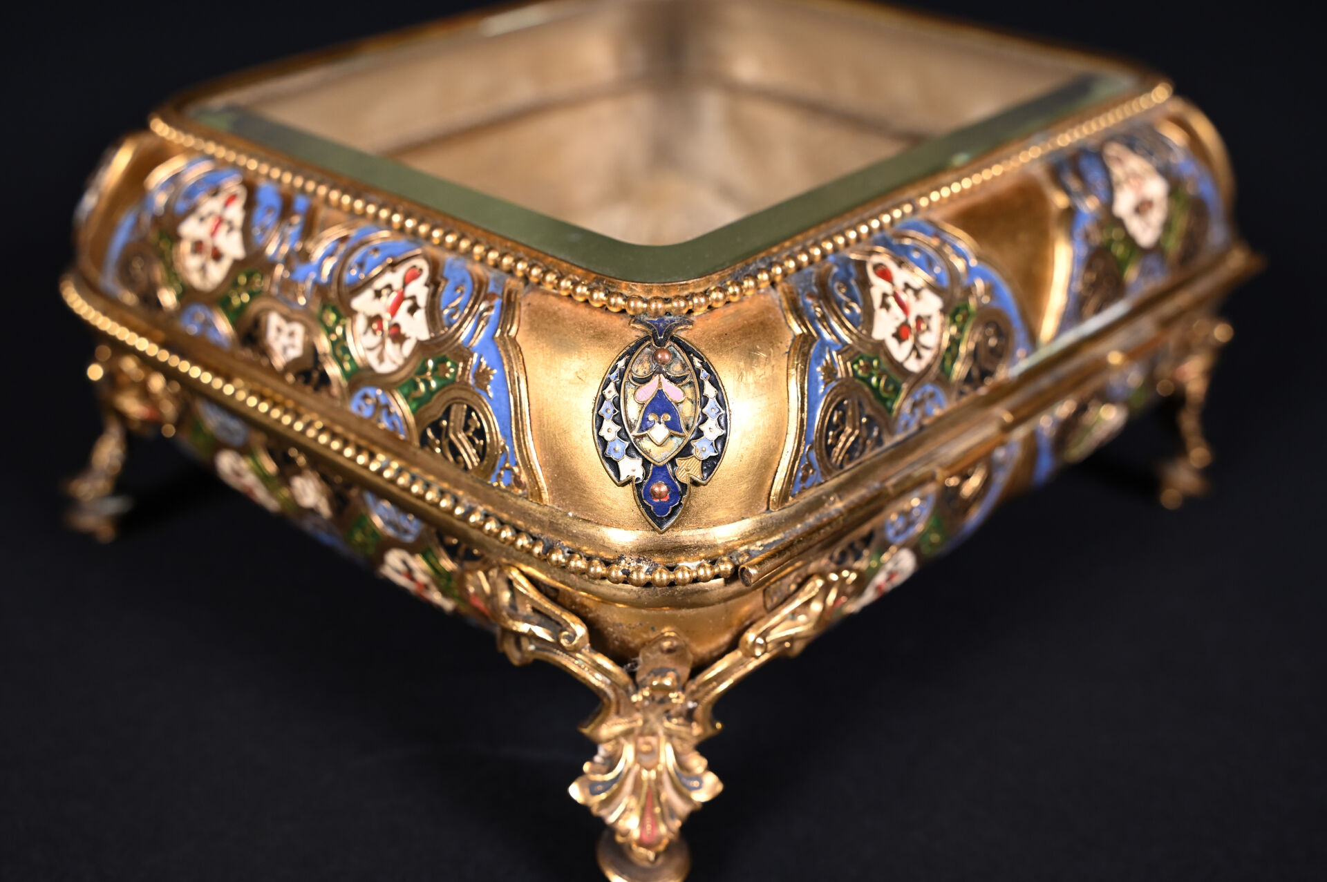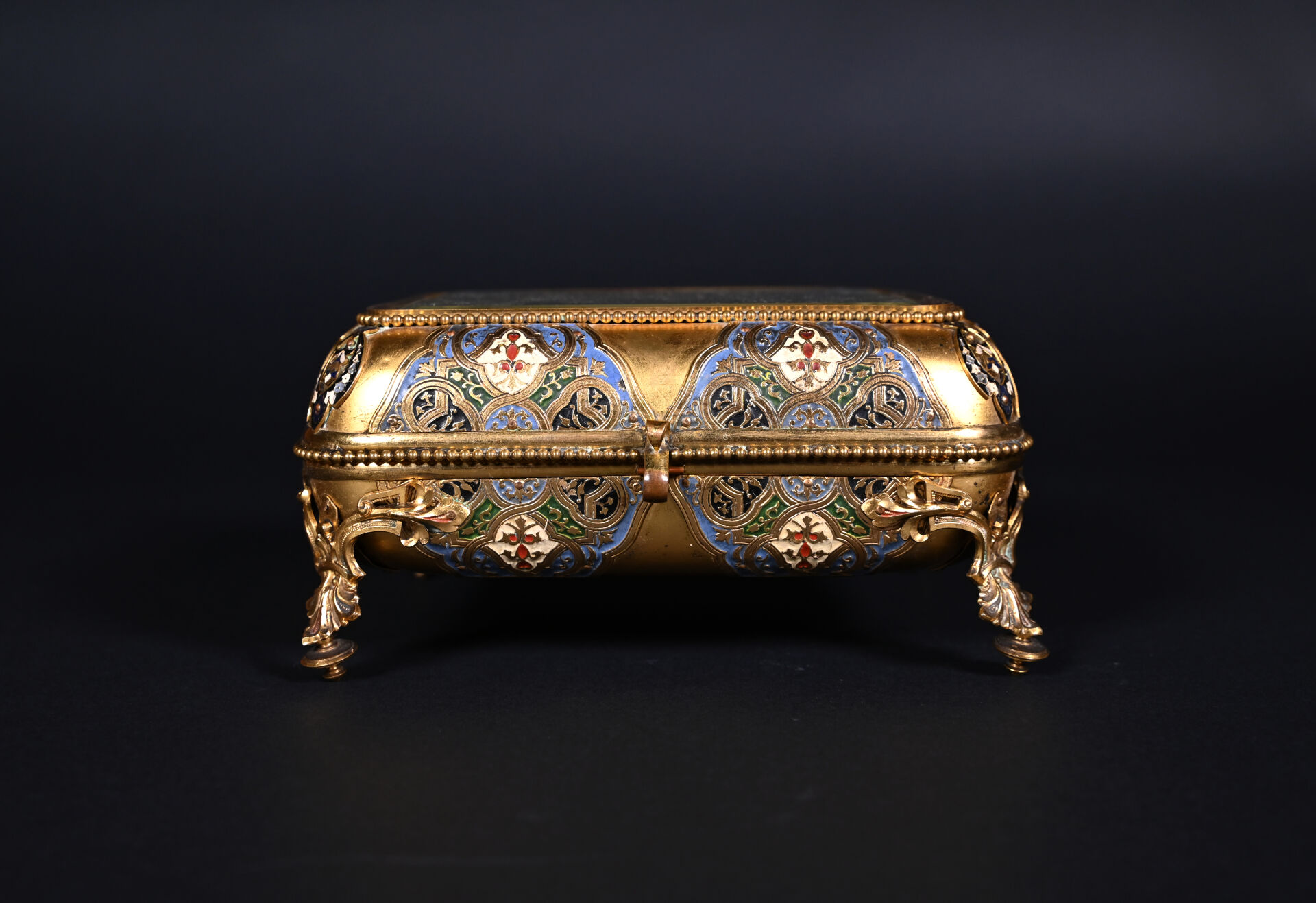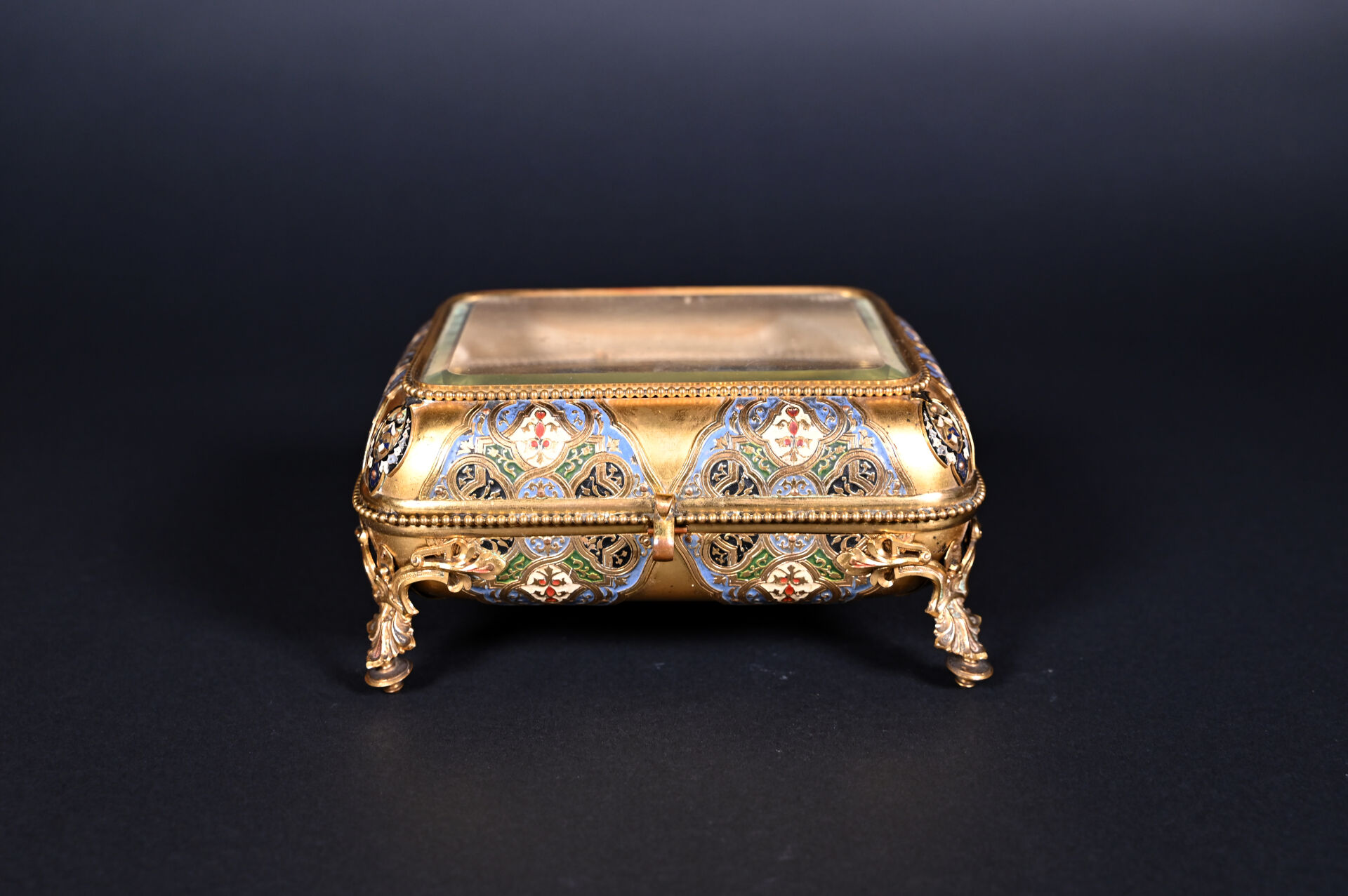 Boîte à bijoux en métal doré à décor émaillé en polychromie dans le goût perse. Le couvercle à charnières, vitré, l’intérieur en satin beige capitonné (usures, petits enfoncements et manques principalement à l’émail). Epoque Napoléon III. Haut. : 10,5 cm – Larg. : 21 cm – Prof. : 19 cm.
