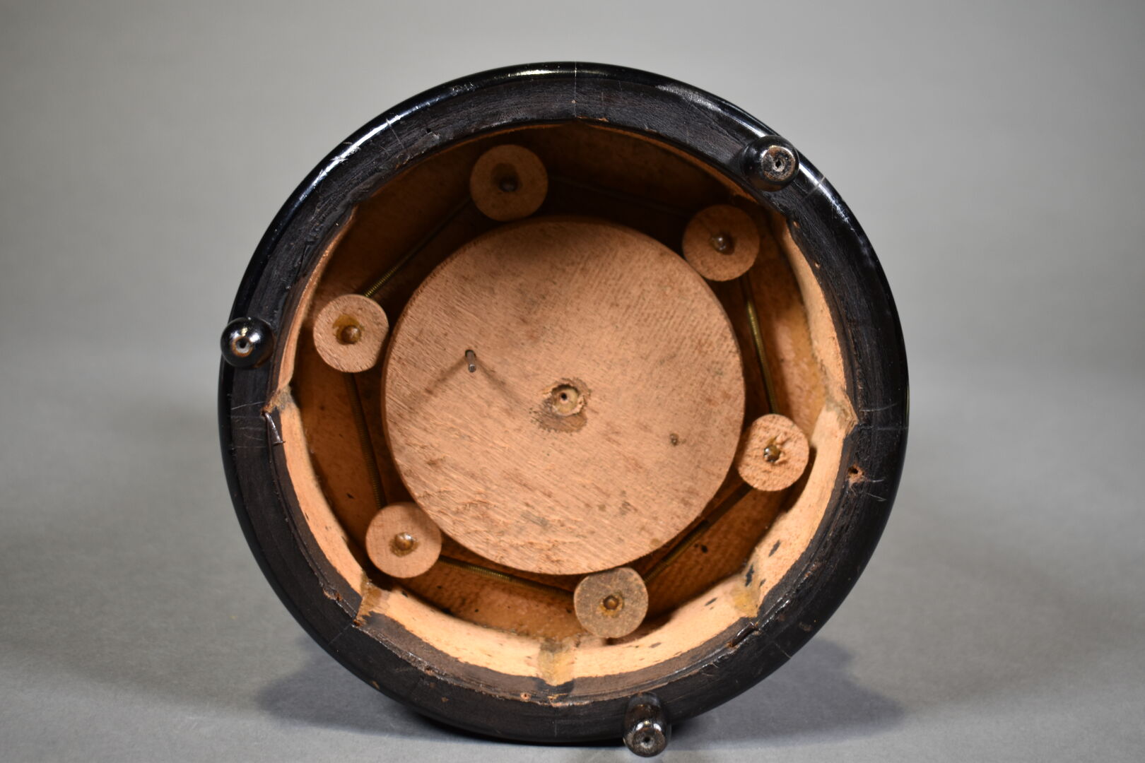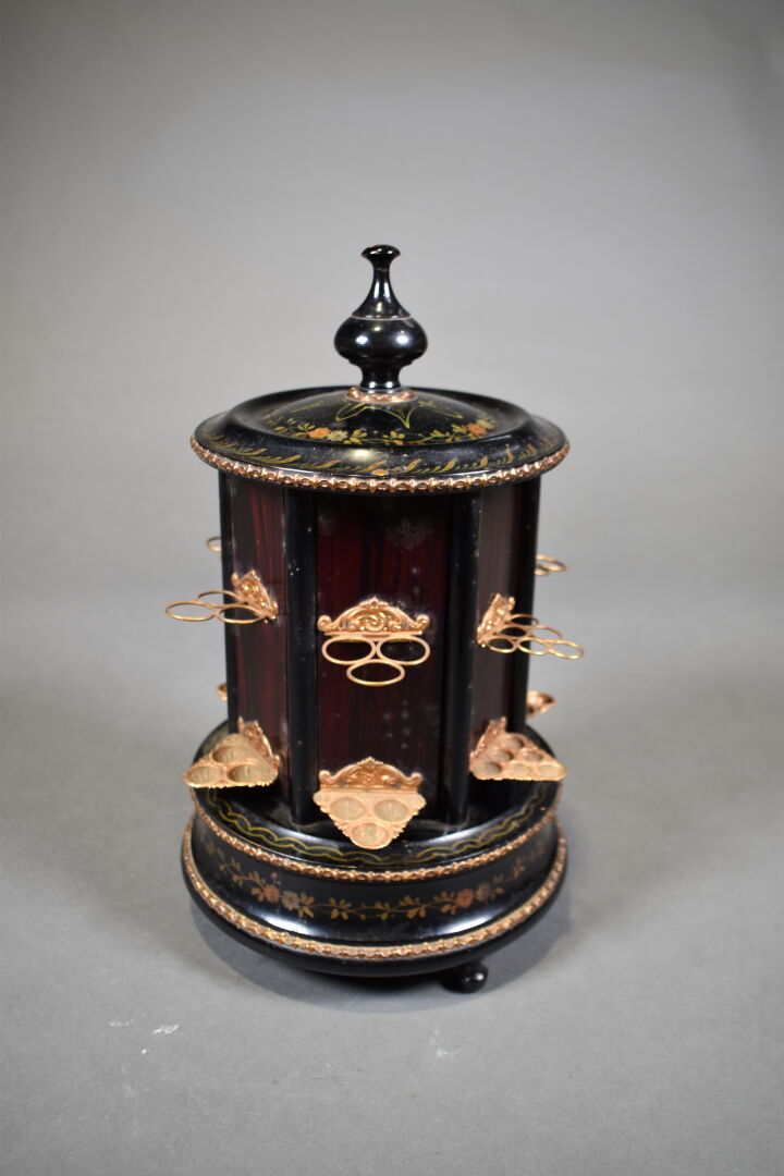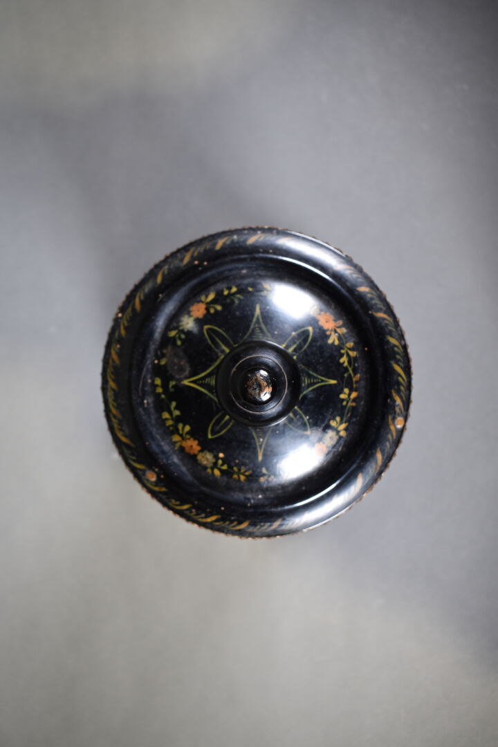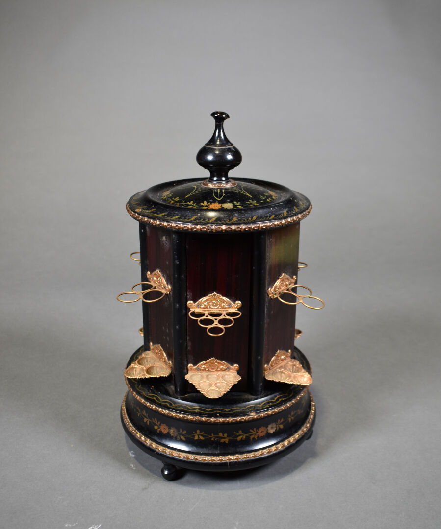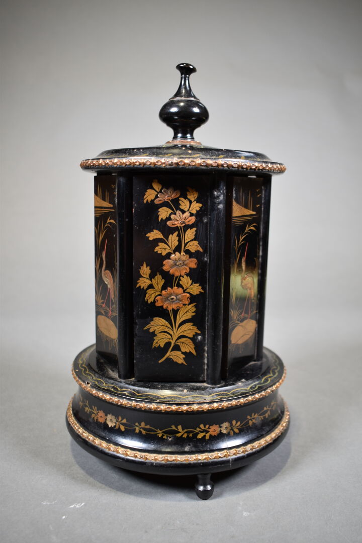 Boite à cigares en bois noirci à décor laqué or d’échassiers et branches de fleurs. Époque Napoléon III. Haut. : 32 cm.