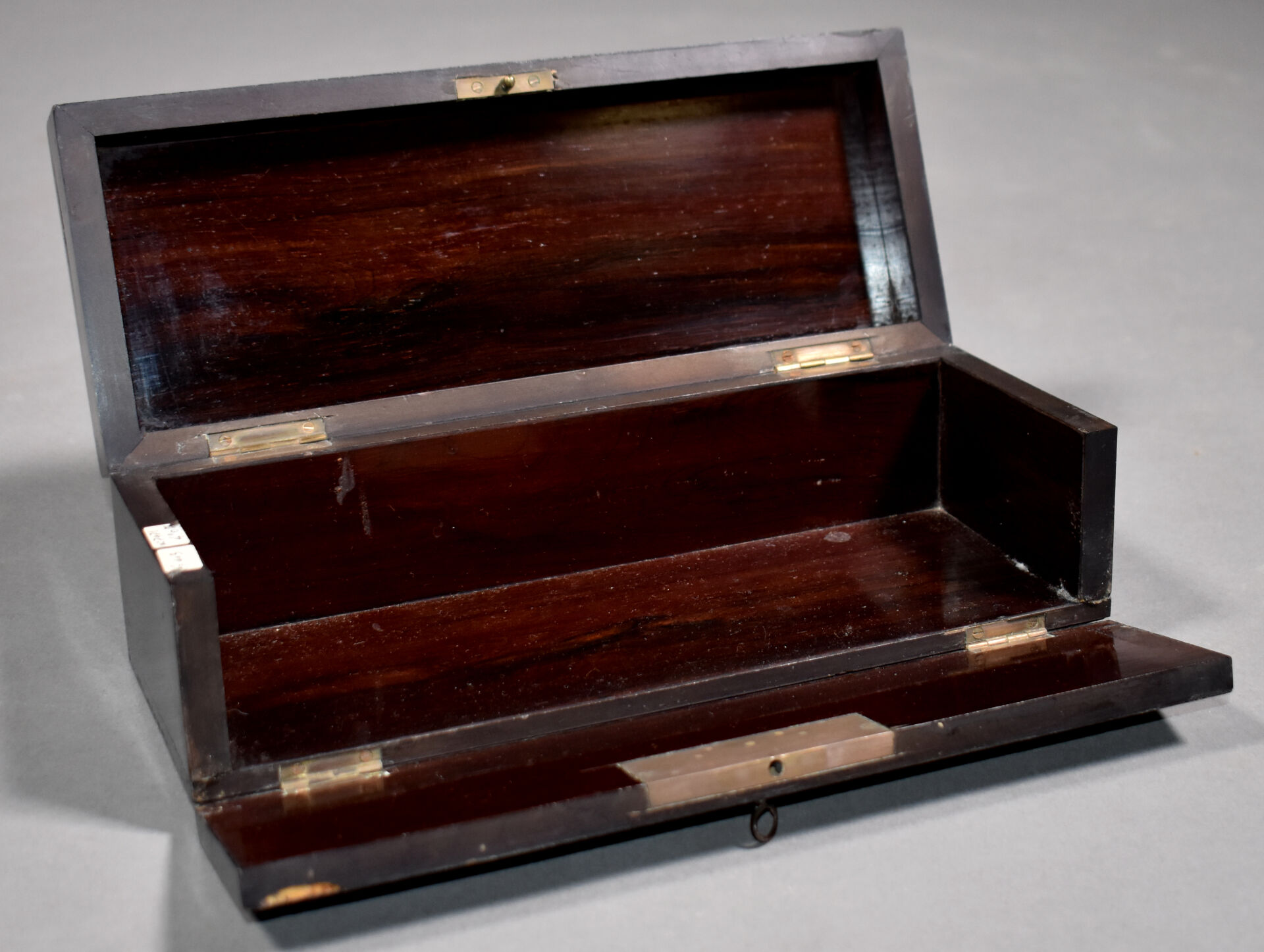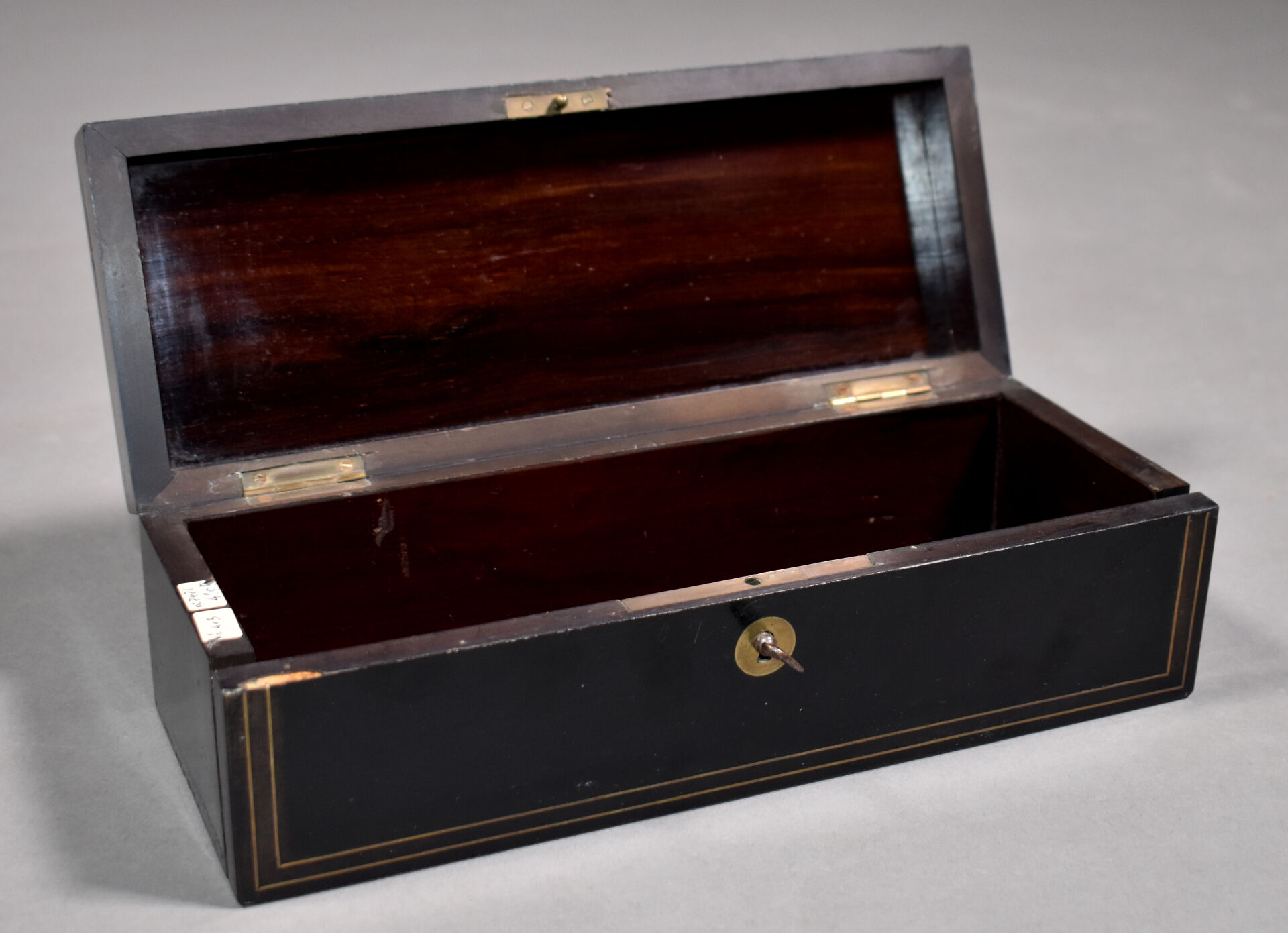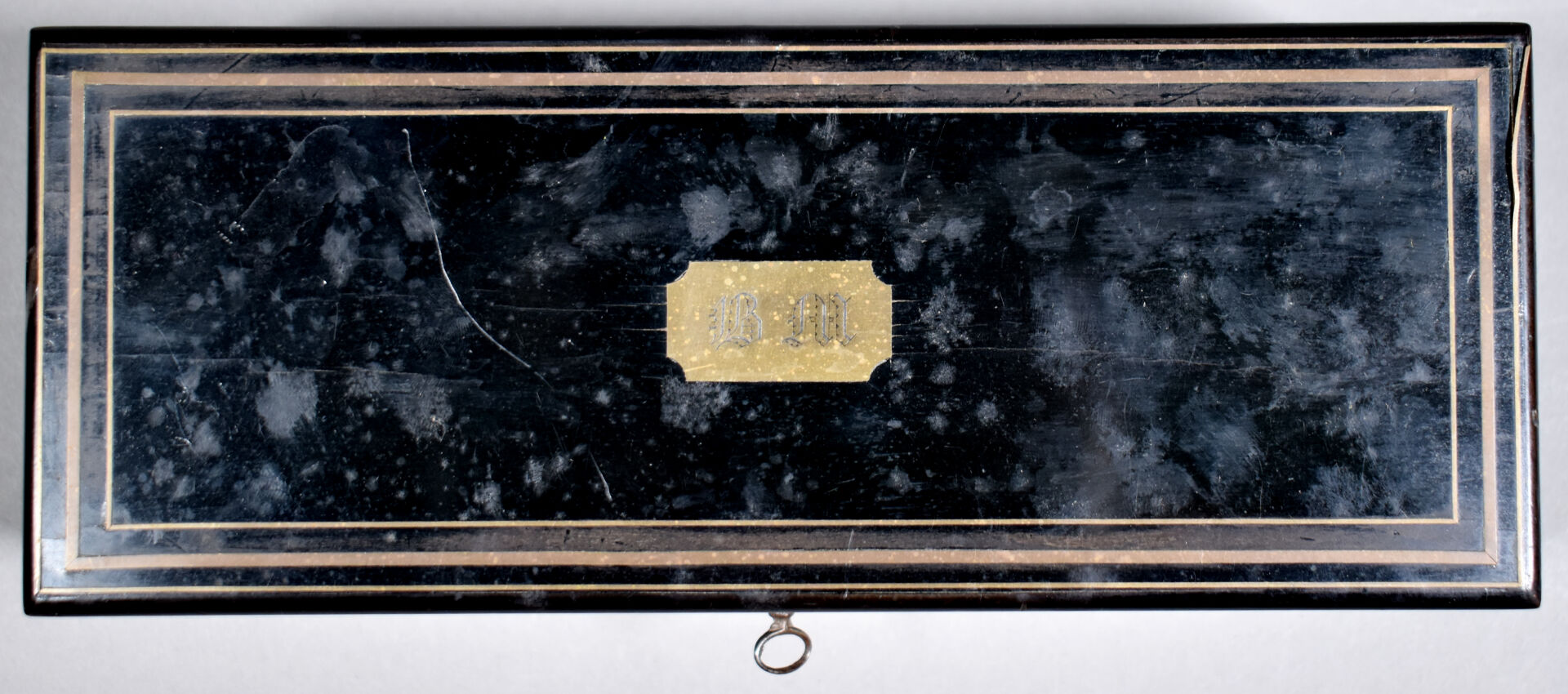 Boîte à gants en bois noirci à filets de laiton incrustés (soulèvements). Le couvercle chiffré BM. Intérieur en palissandre. Fin du XIXe siècle. Haut. : 8 cm – Larg. : 26,5 cm – Prof. : 10 cm.