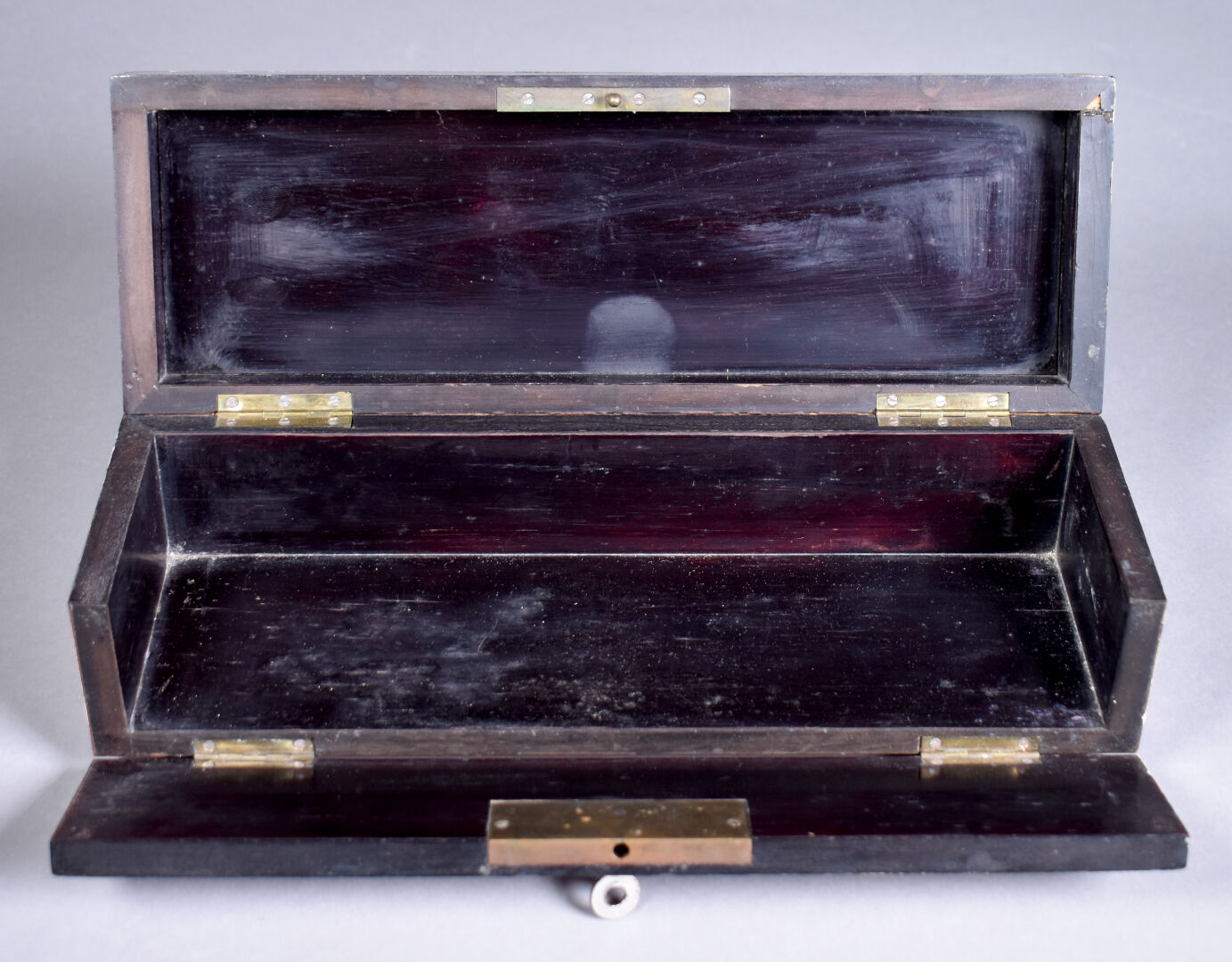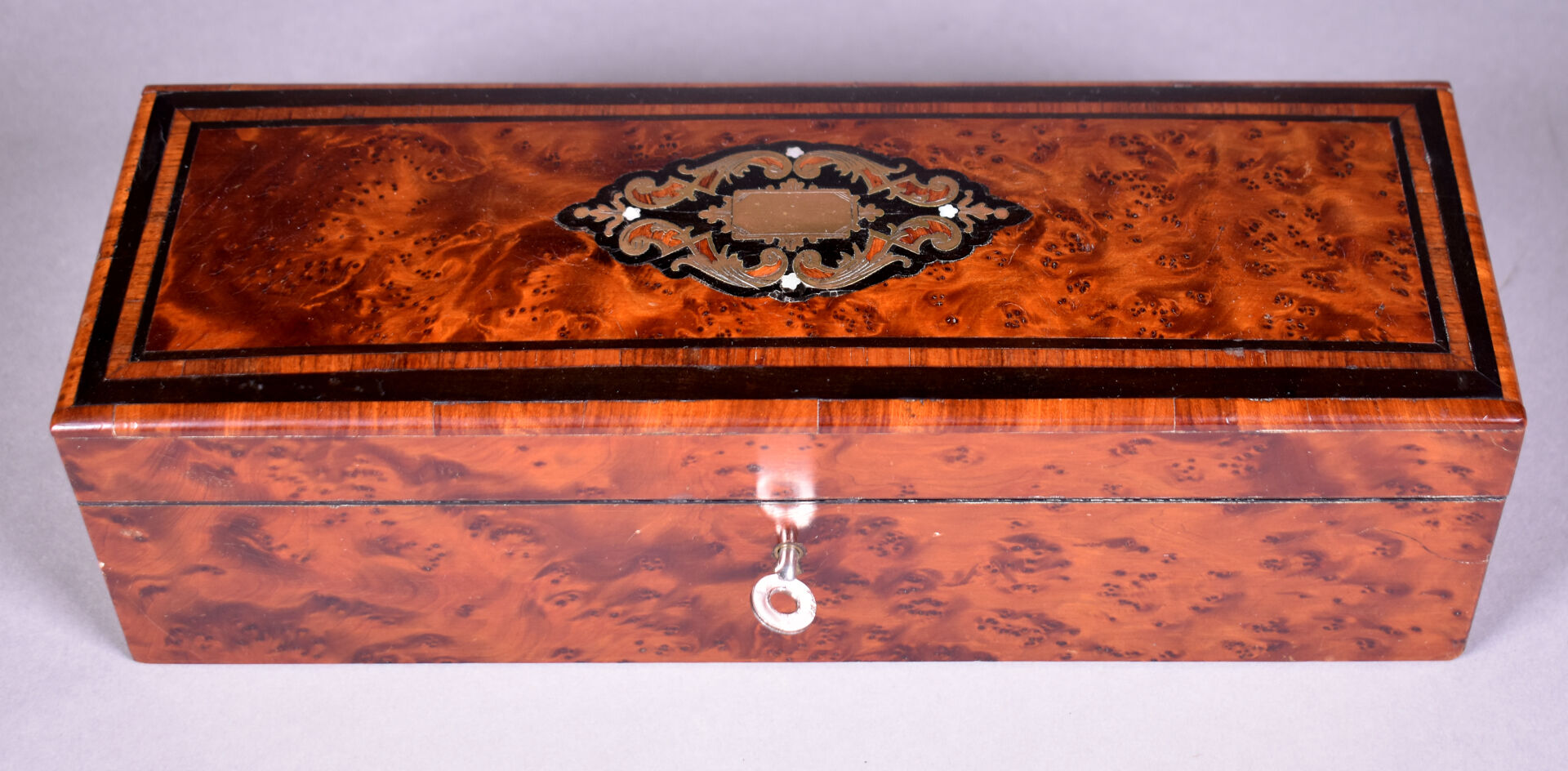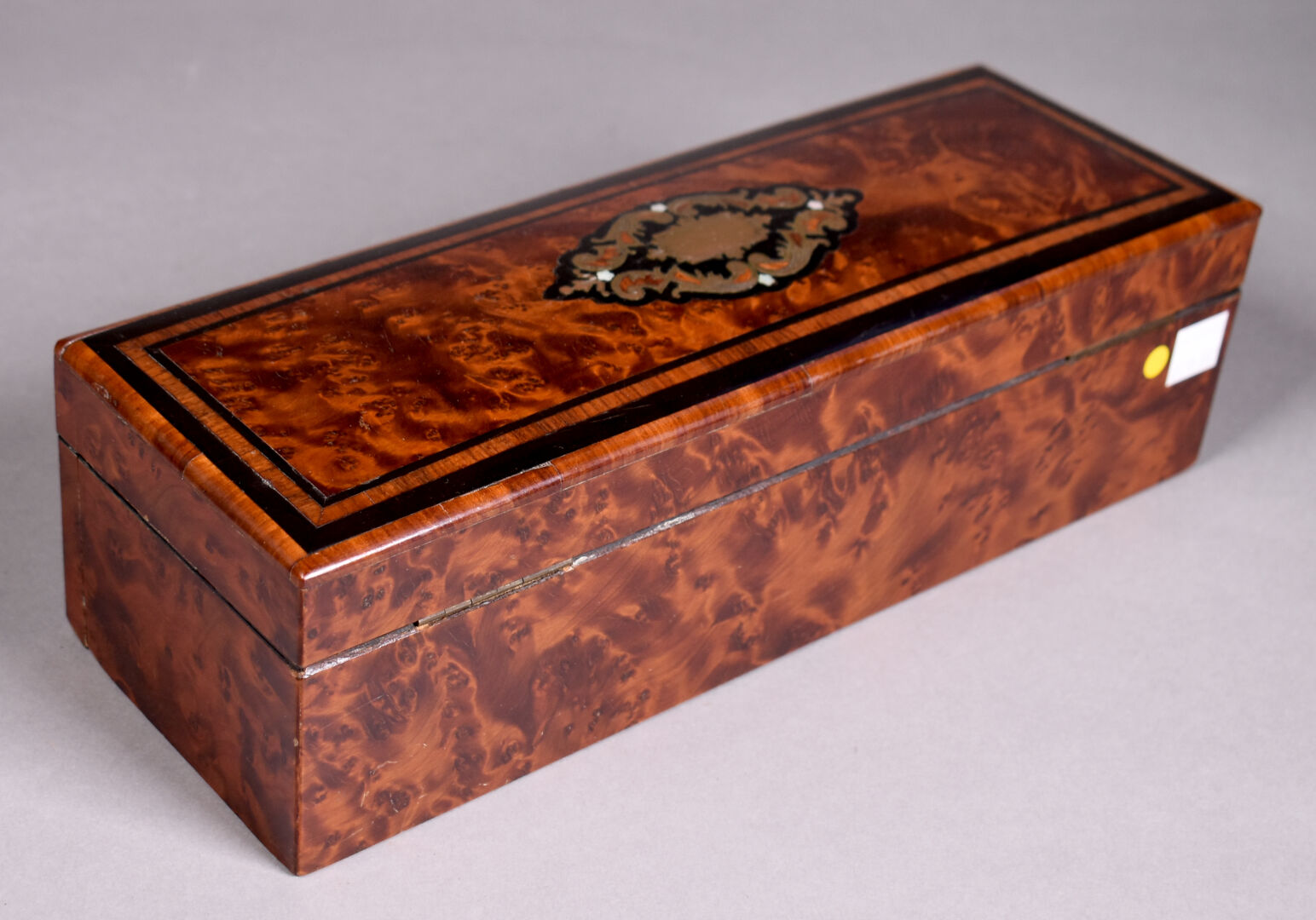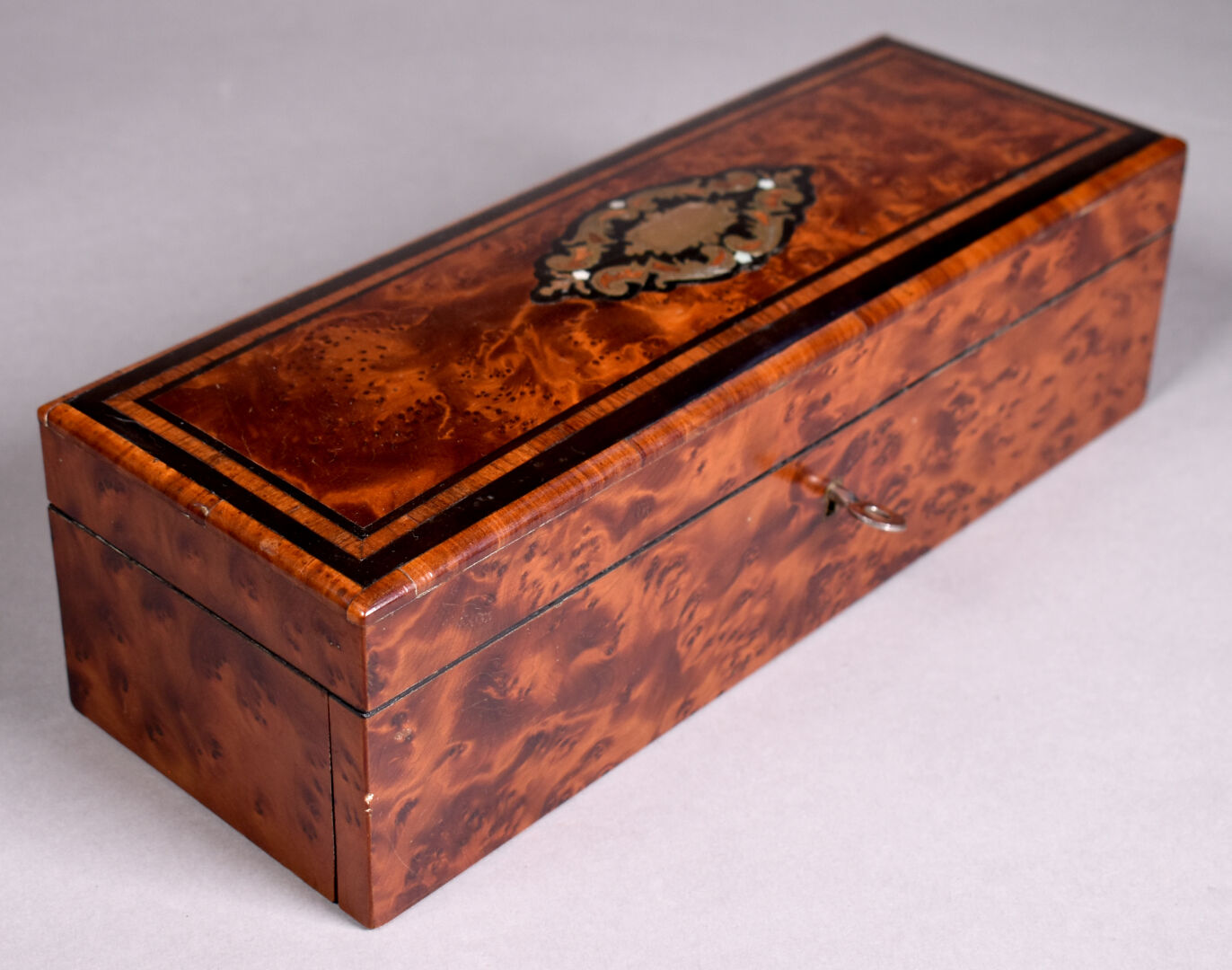 Boîte à gants en placage de loupe de noyer, bois de rose. Le couvercle marqueté de laiton (quelques usures et éclats). Epoque Napoléon III. Haut. : 8,5 cm – Larg. : 30 cm – Prof. : 10,5 cm.