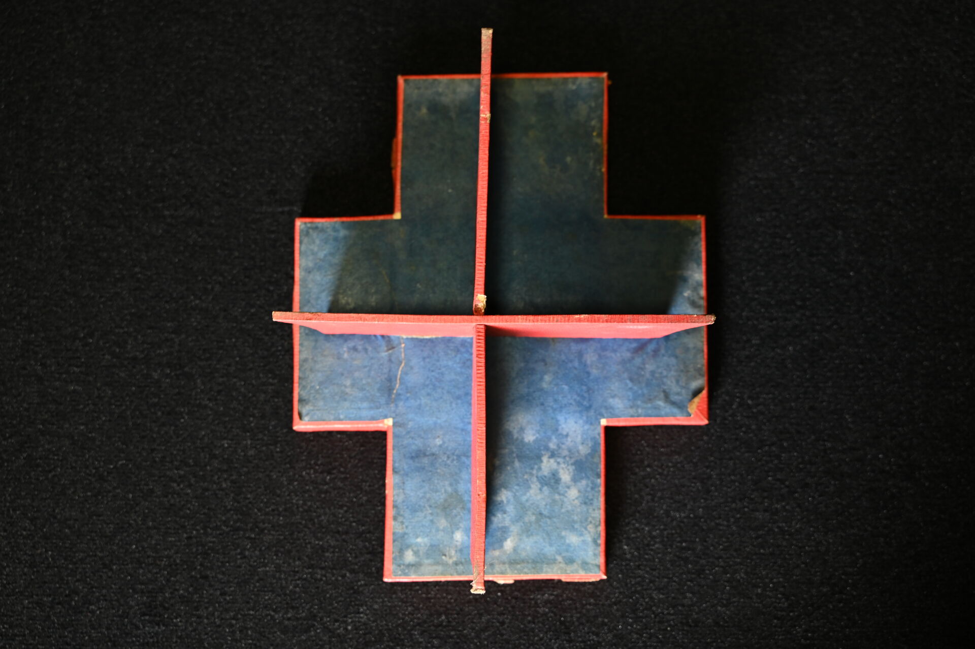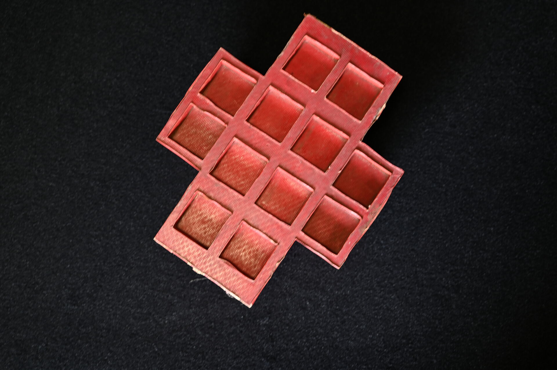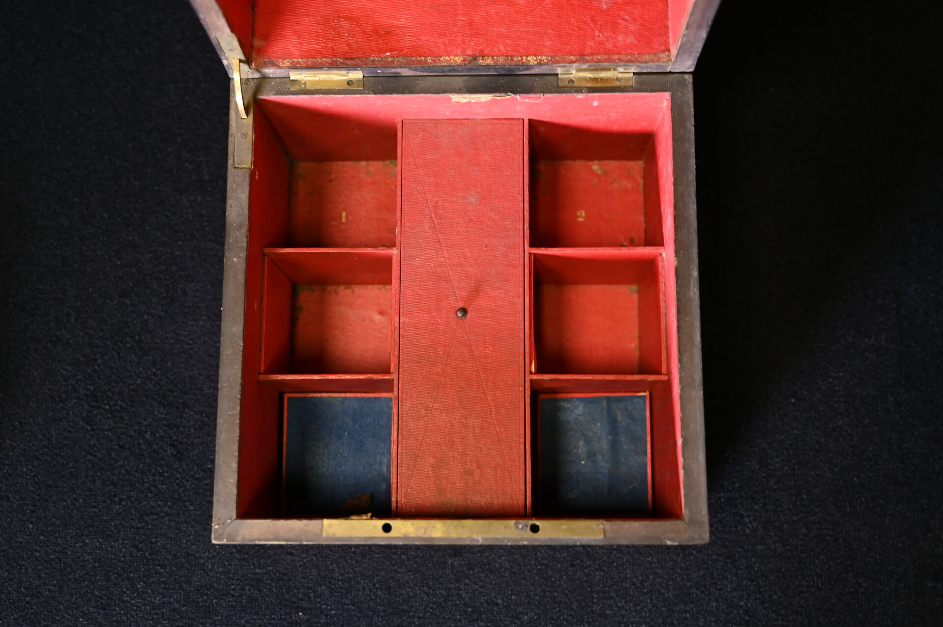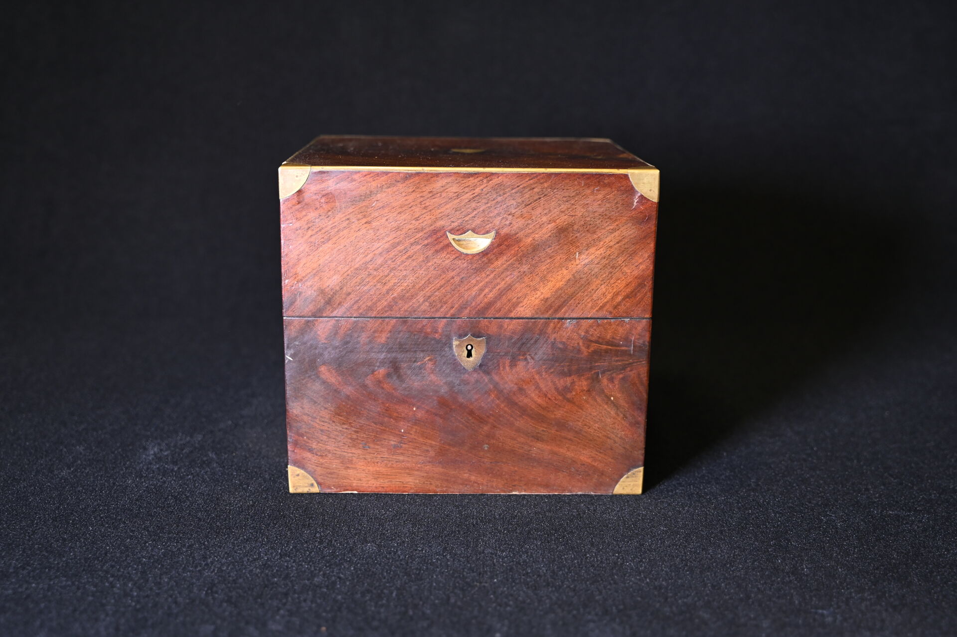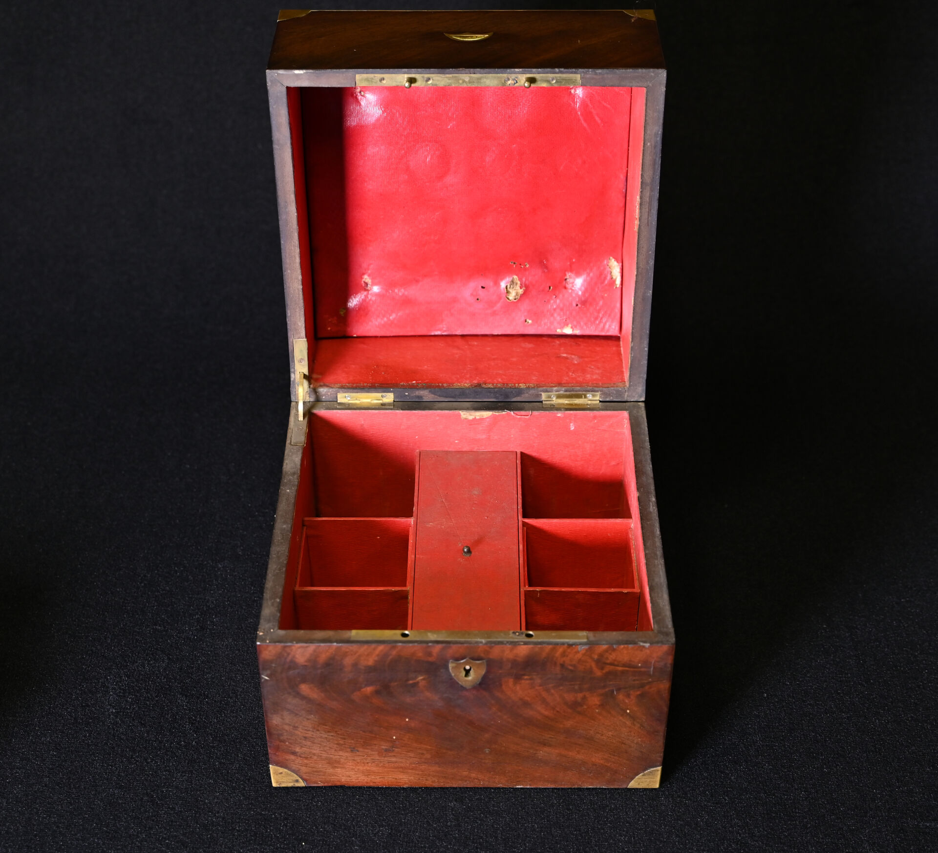 Boite à pharmacie de marine en placage d’acajou et laiton. l’intérieur garni de maroquin rouge. Fin du XIXe ou début du XXe siècle. Haut. : 24 cm – Larg. : 26 cm – Prof. : 25,5 cm.