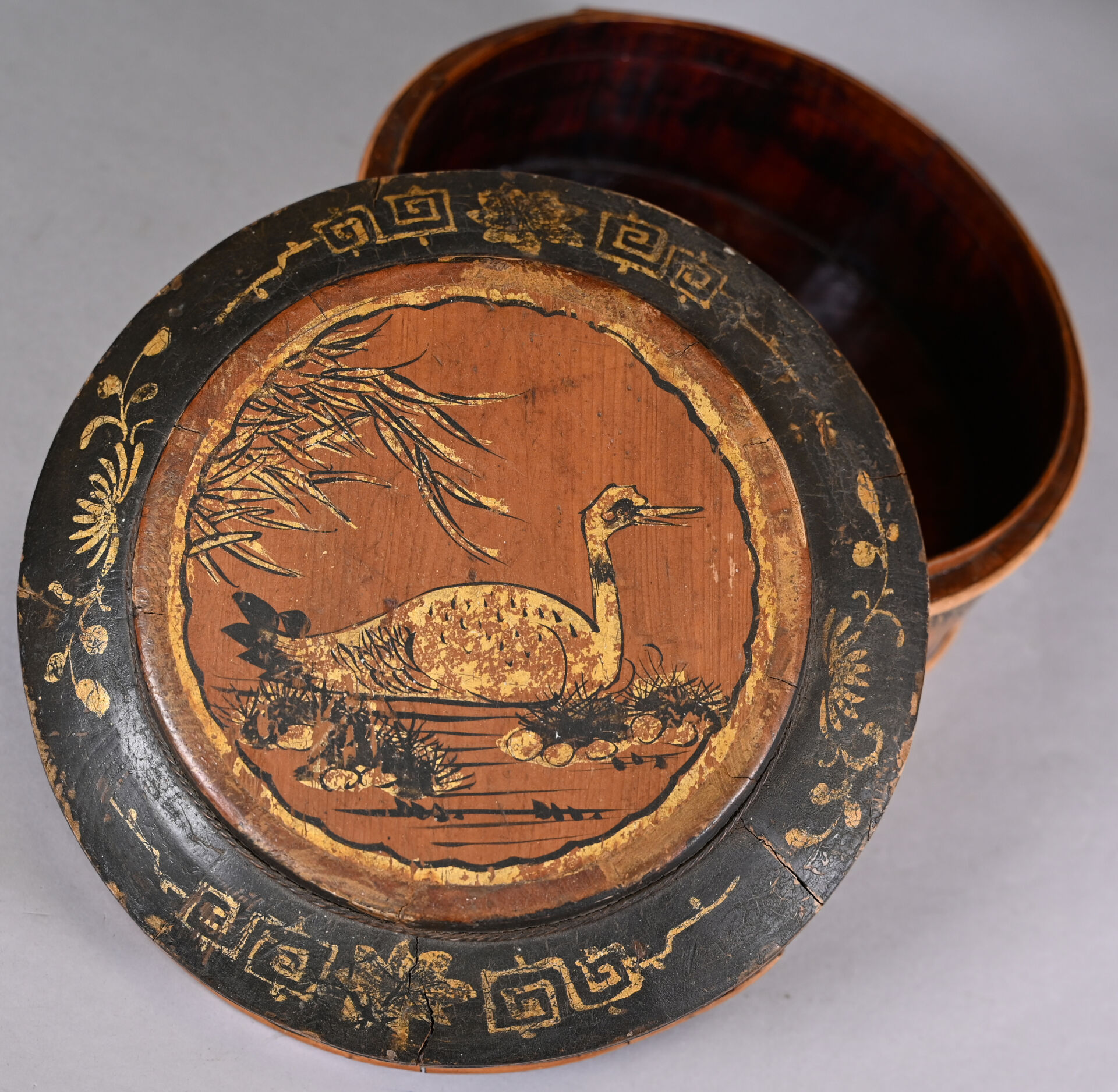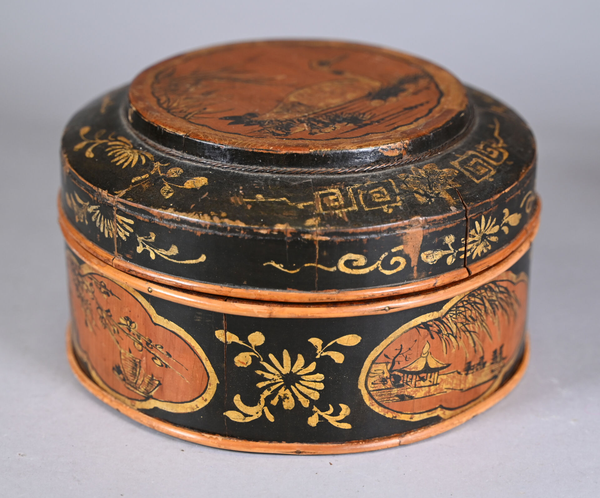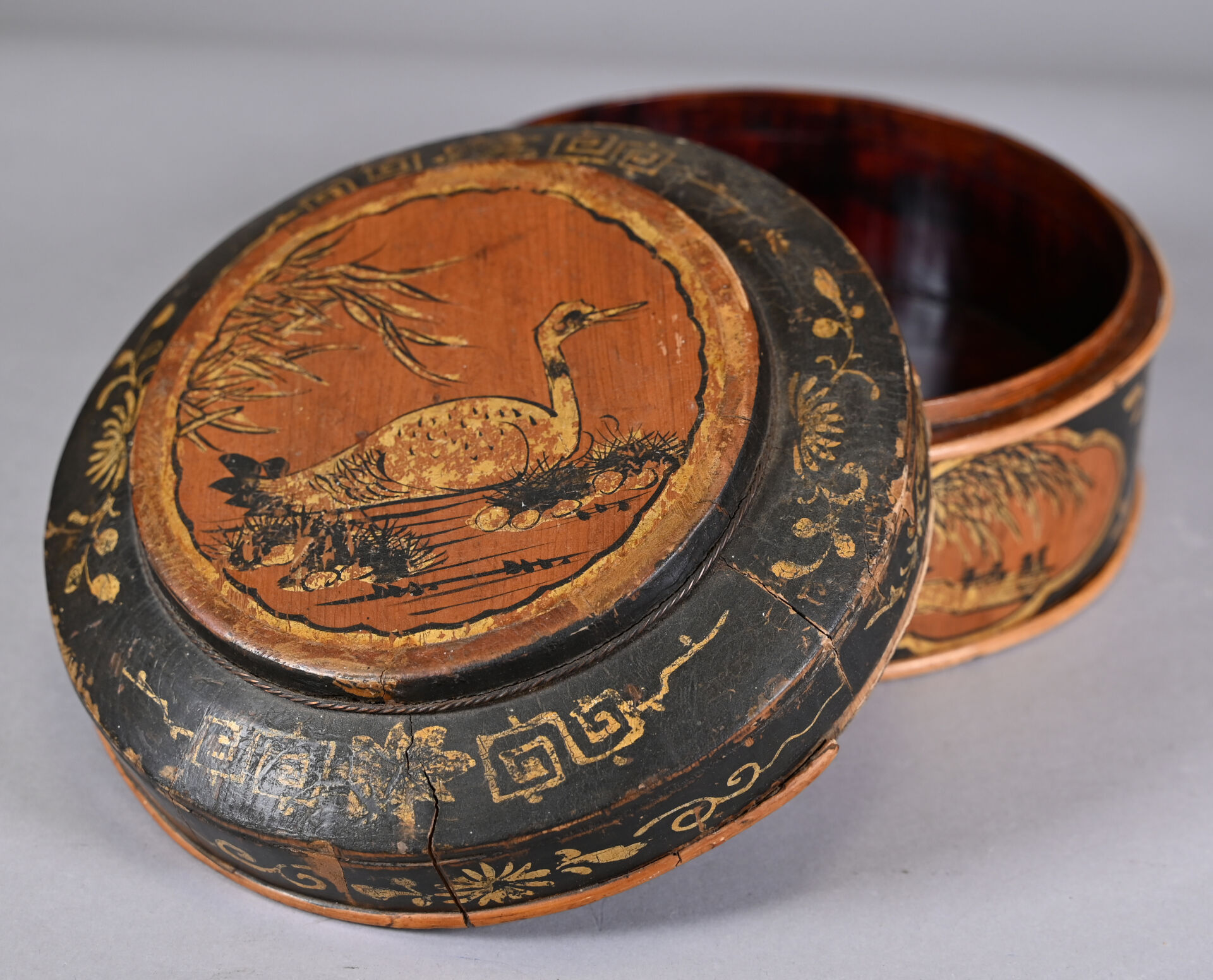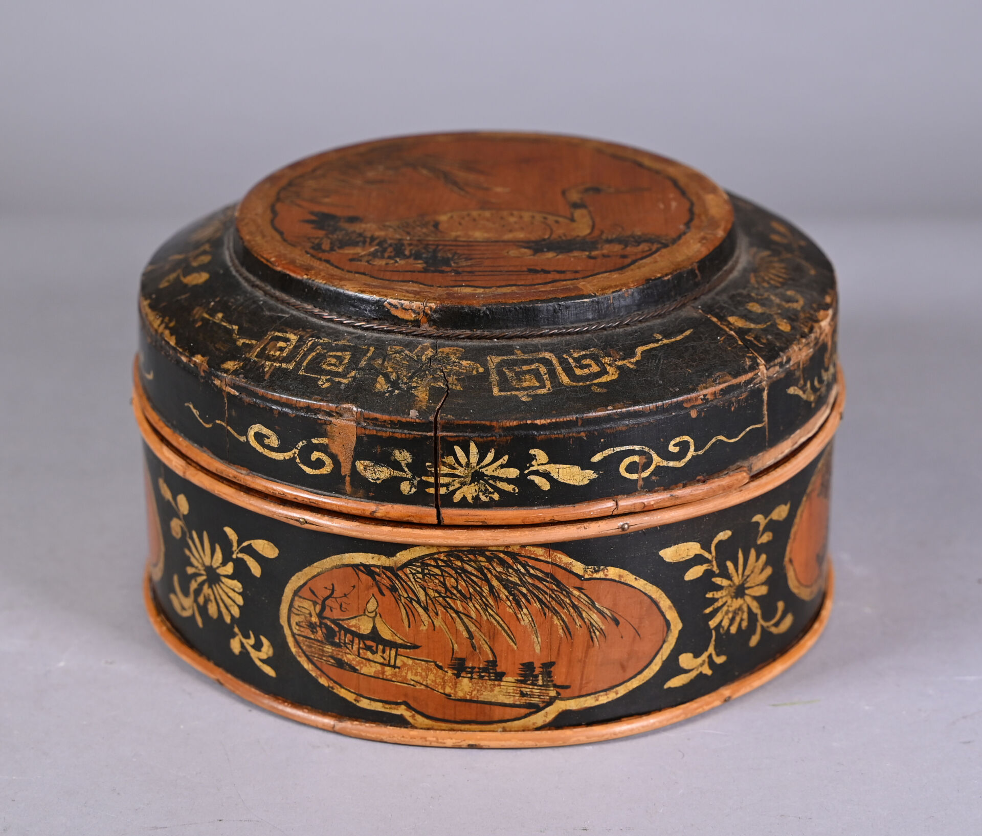 Boite en bois tourné et laqué noir et or à décor d’oiseaux, fleurs et végétaux (éclats, manques et fentes). Probablement Indochine. Diam. : 26 cm.