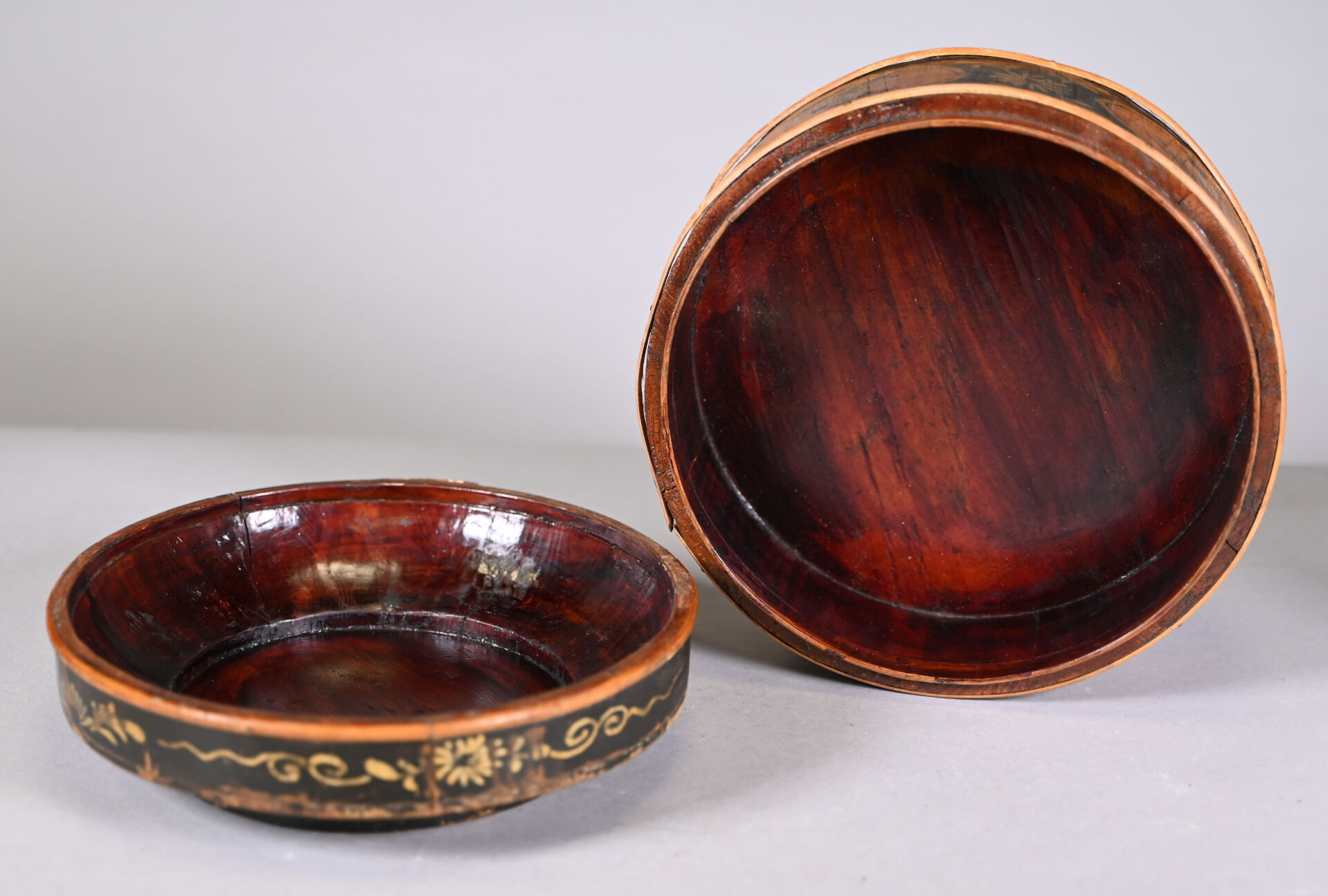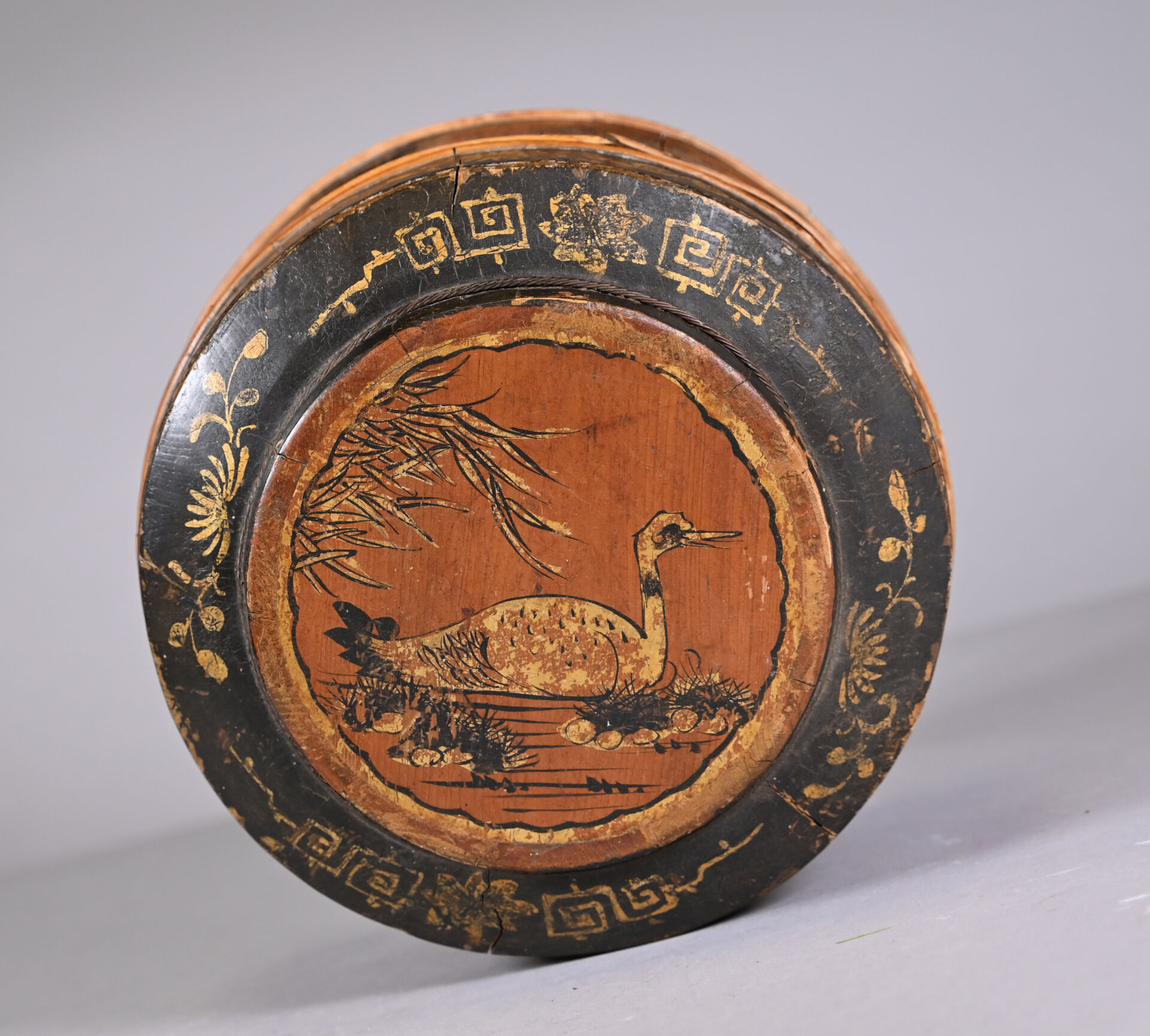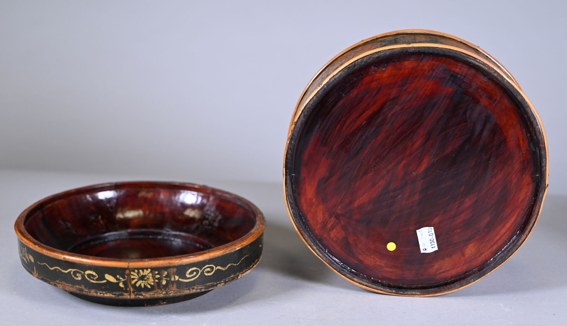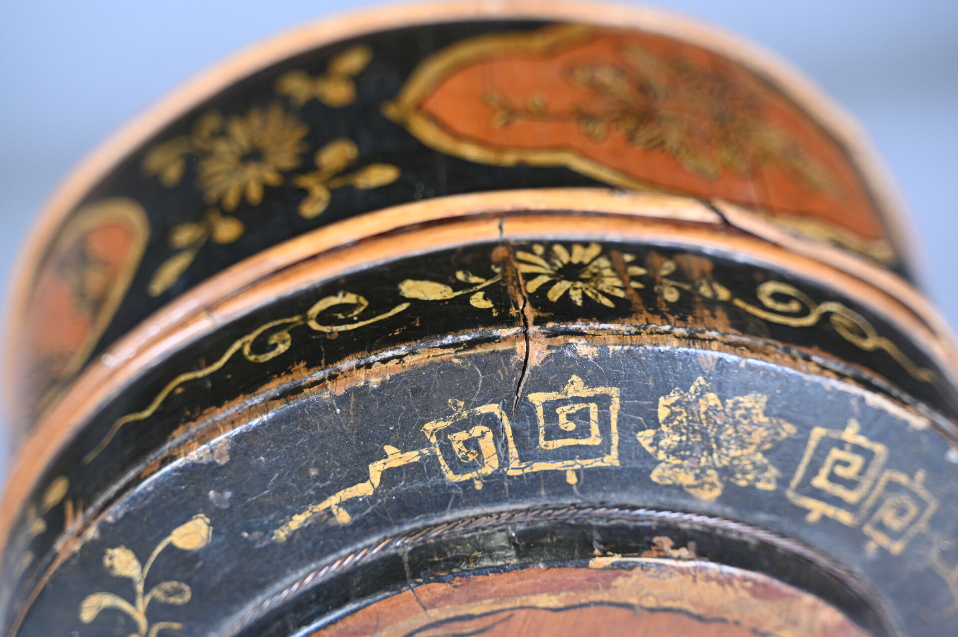 Boite en bois tourné et laqué noir et or à décor d’oiseaux, fleurs et végétaux (éclats, manques et fentes). Probablement Indochine. Diam. : 26 cm.
