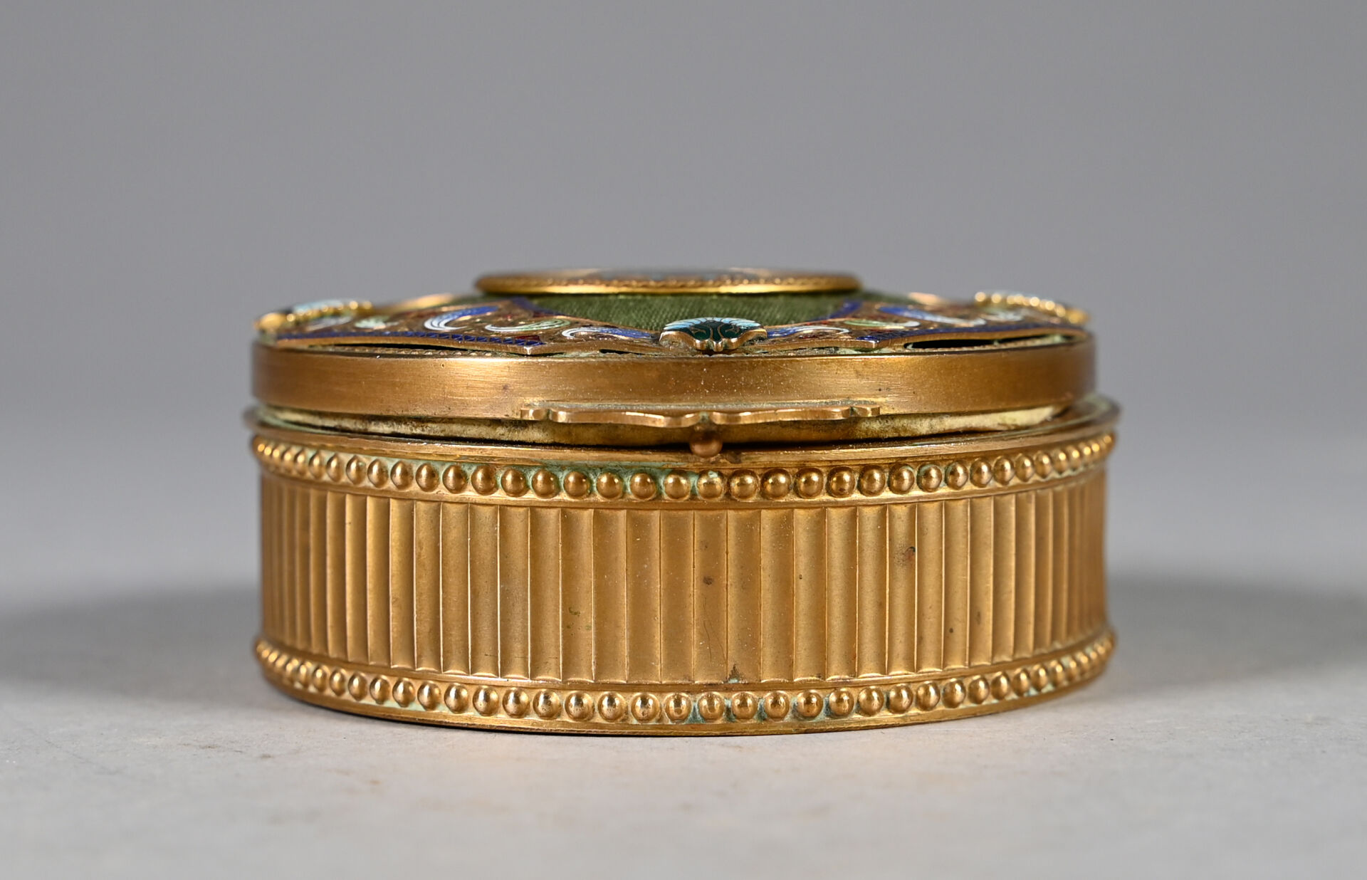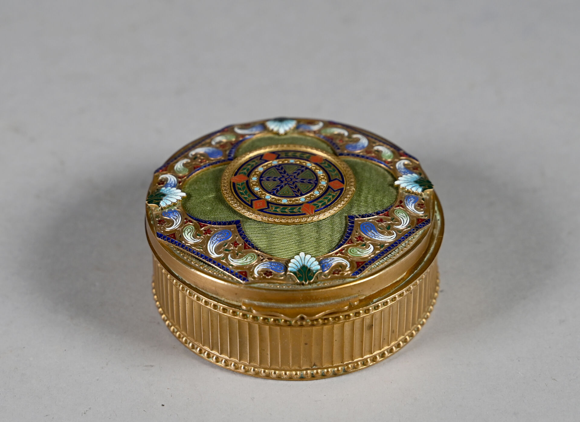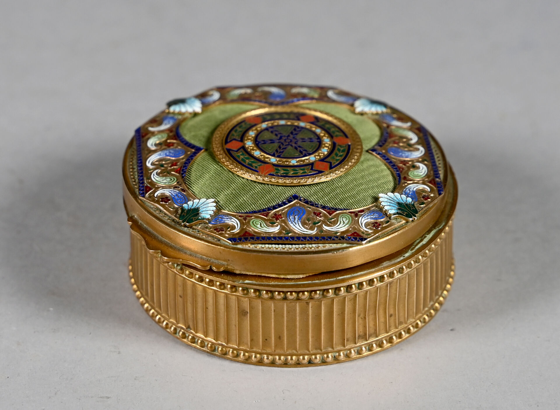 Bonbonnière cylindrique en métal, le couvercle centré d’un quartefeuille en satin vert à décor émaillé en cloisonné de palmettes, motifs géométriques. Fin du XIXe siècle. Haut. : 5 cm. Diam. : 10,5 cm.