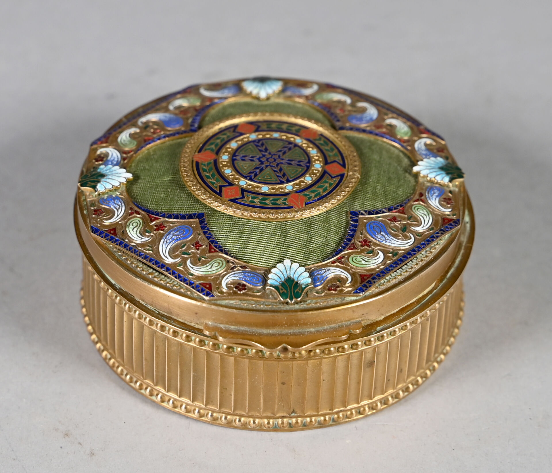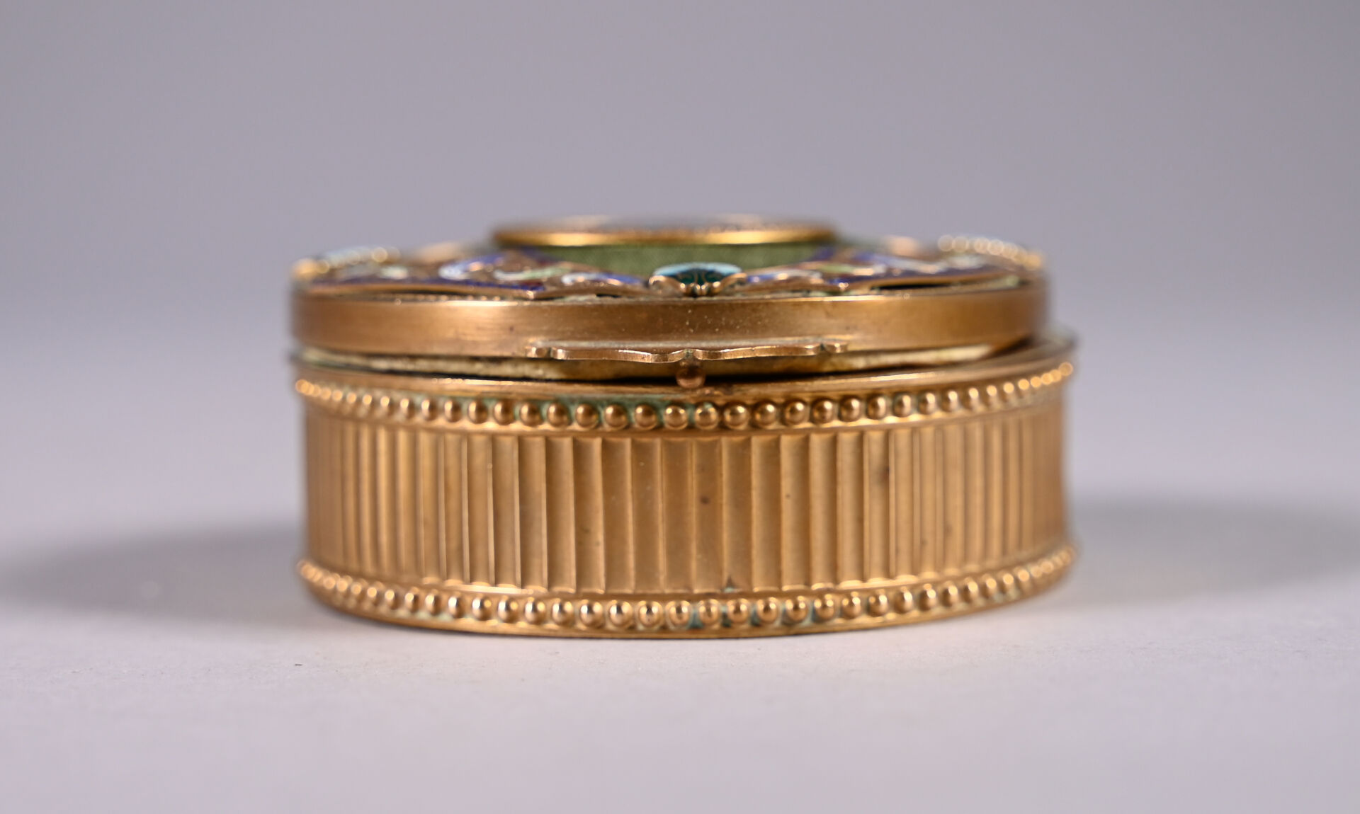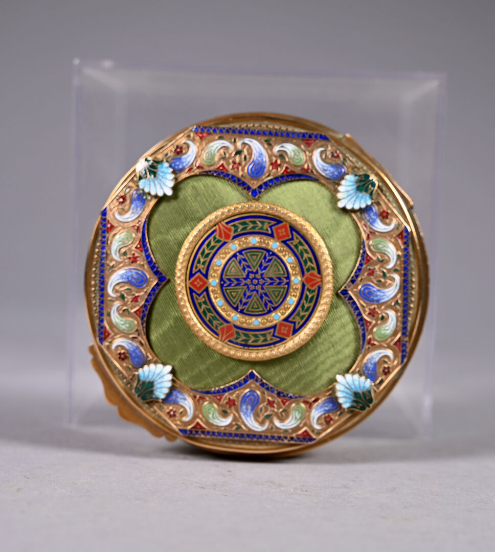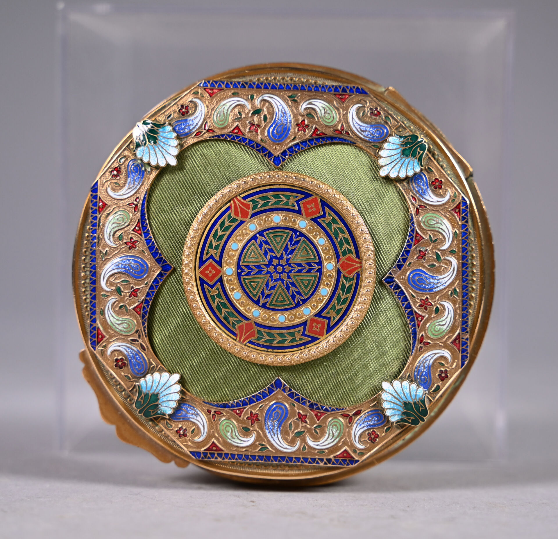 Bonbonnière cylindrique en métal, le couvercle centré d’un quartefeuille en satin vert à décor émaillé en cloisonné de palmettes, motifs géométriques. Fin du XIXe siècle. Haut. : 5 cm. Diam. : 10,5 cm.