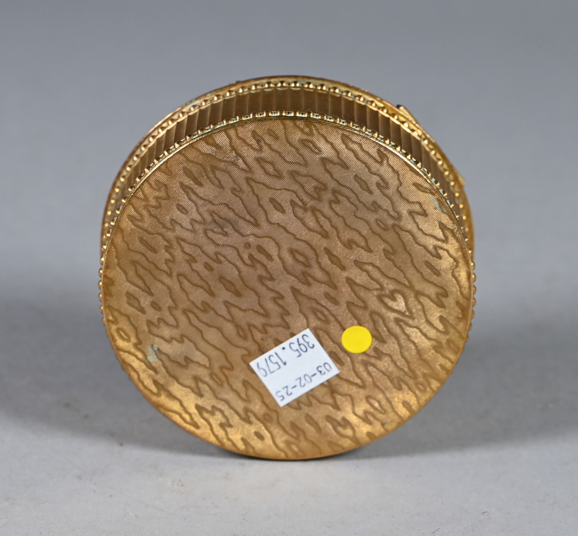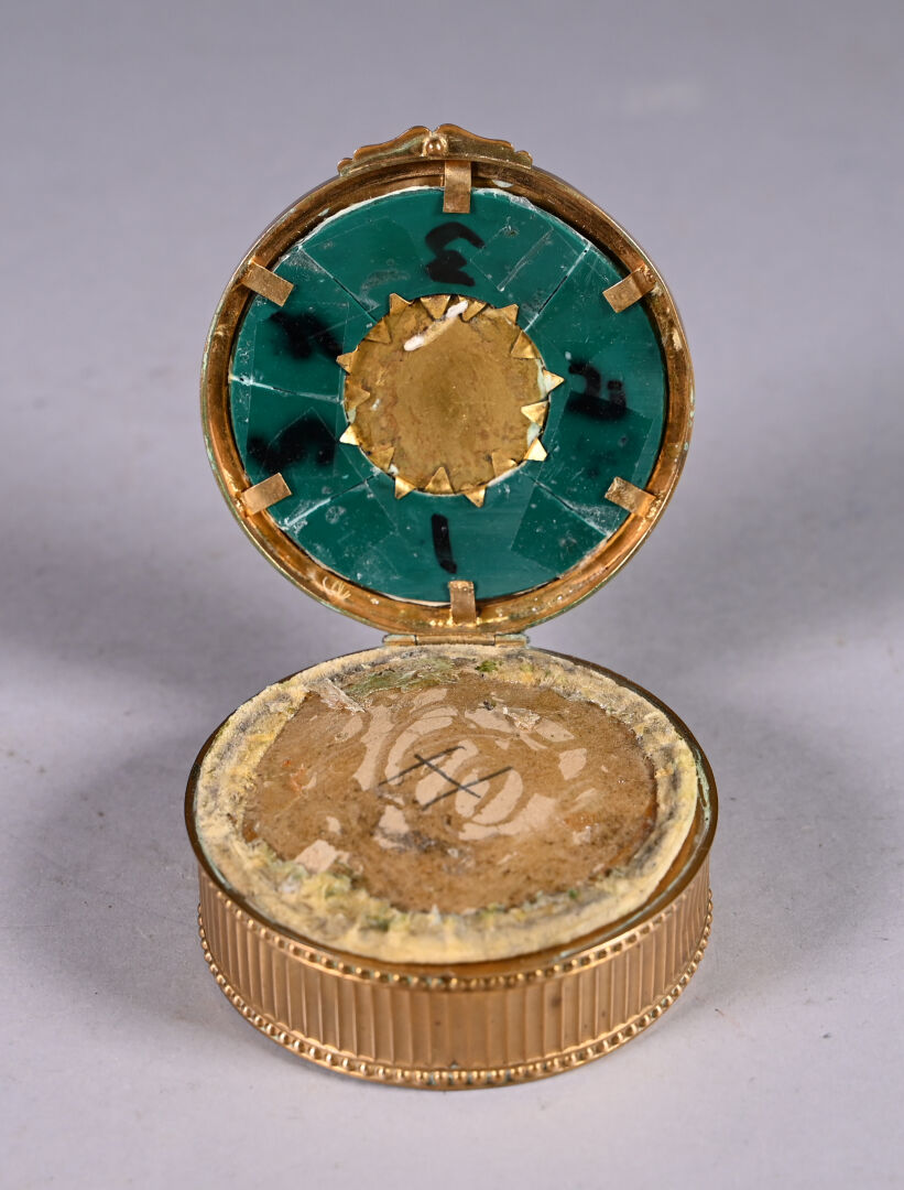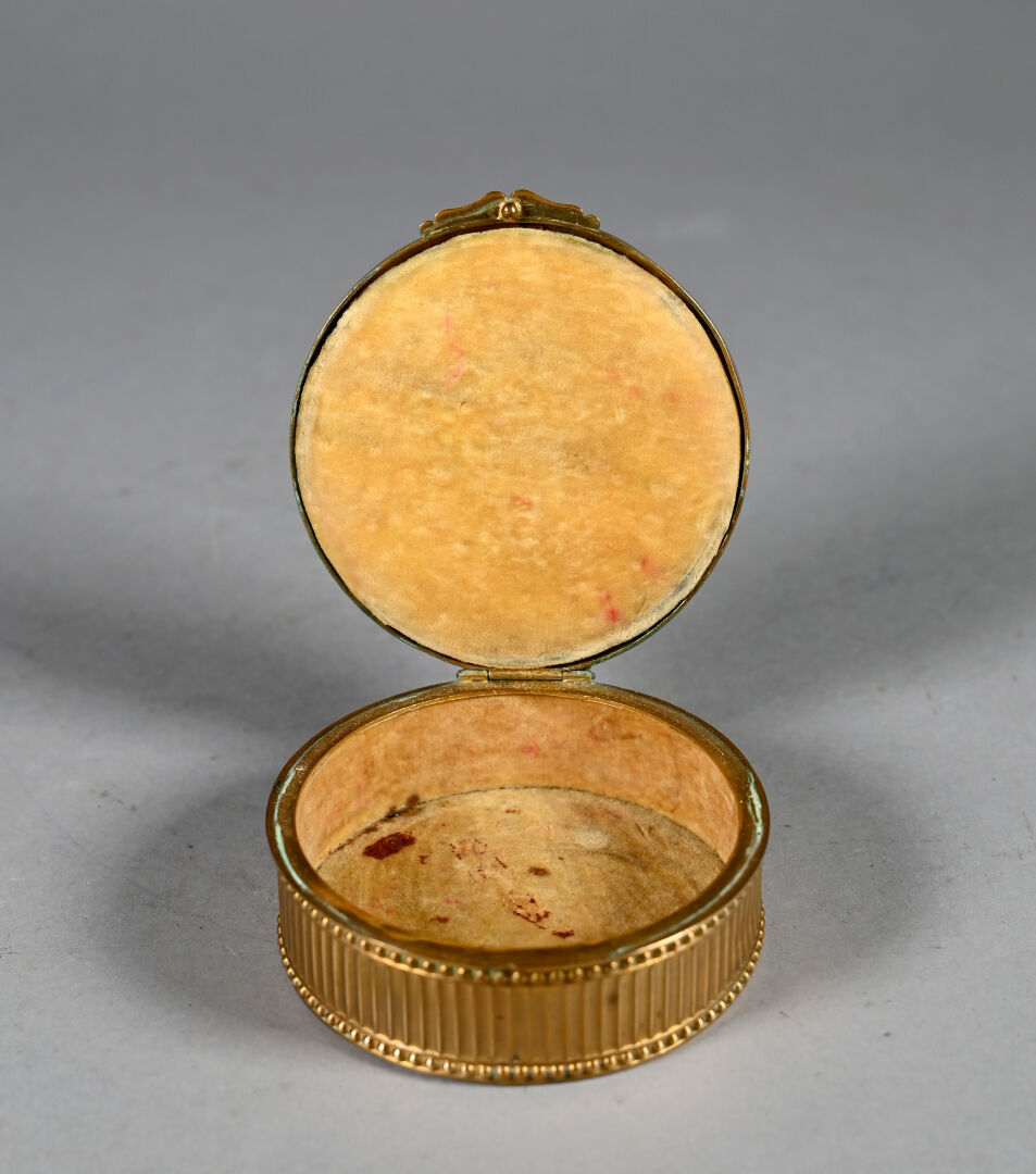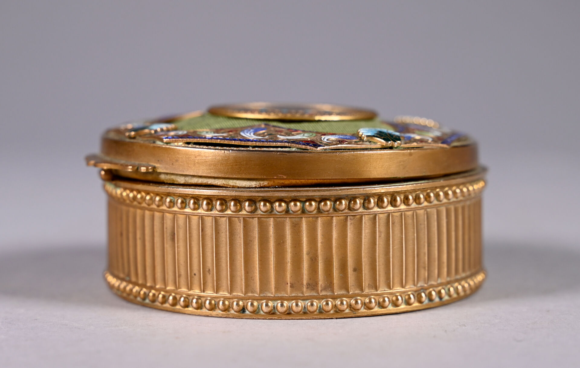 Bonbonnière cylindrique en métal, le couvercle centré d’un quartefeuille en satin vert à décor émaillé en cloisonné de palmettes, motifs géométriques. Fin du XIXe siècle. Haut. : 5 cm. Diam. : 10,5 cm.