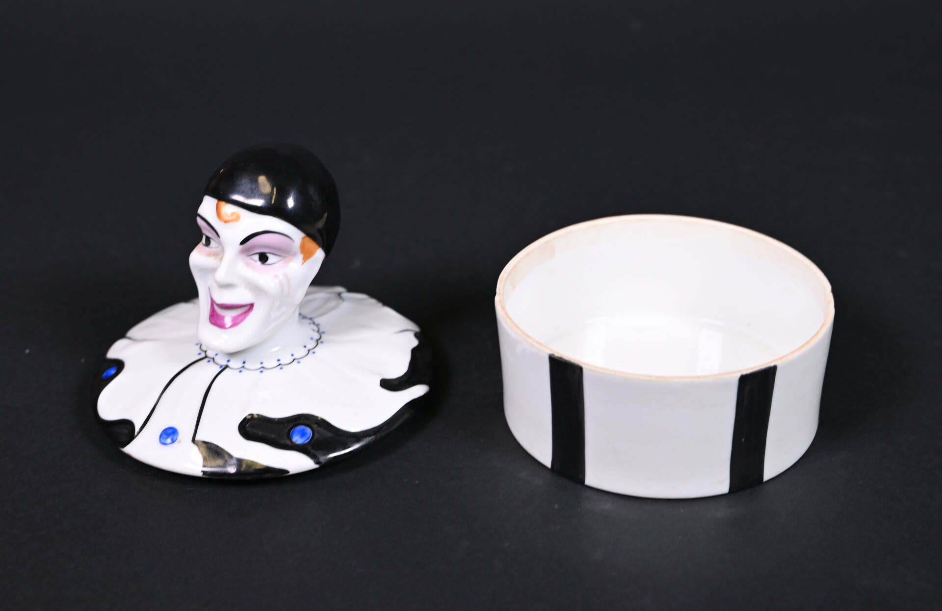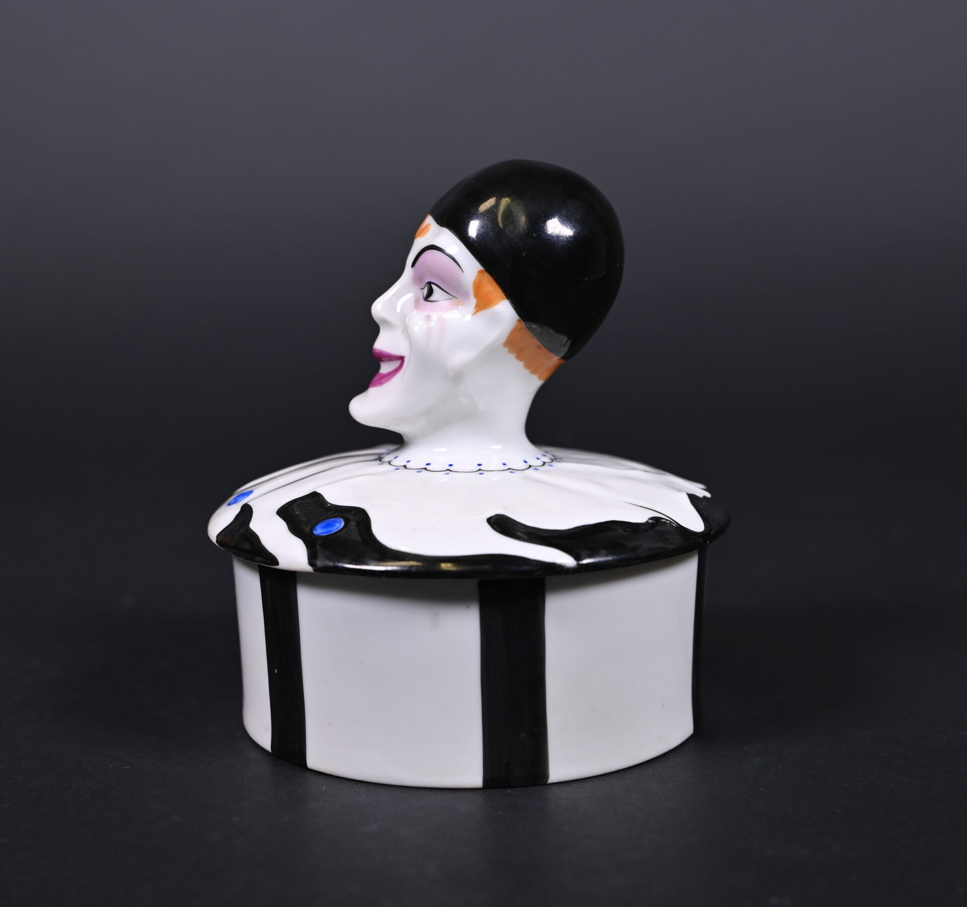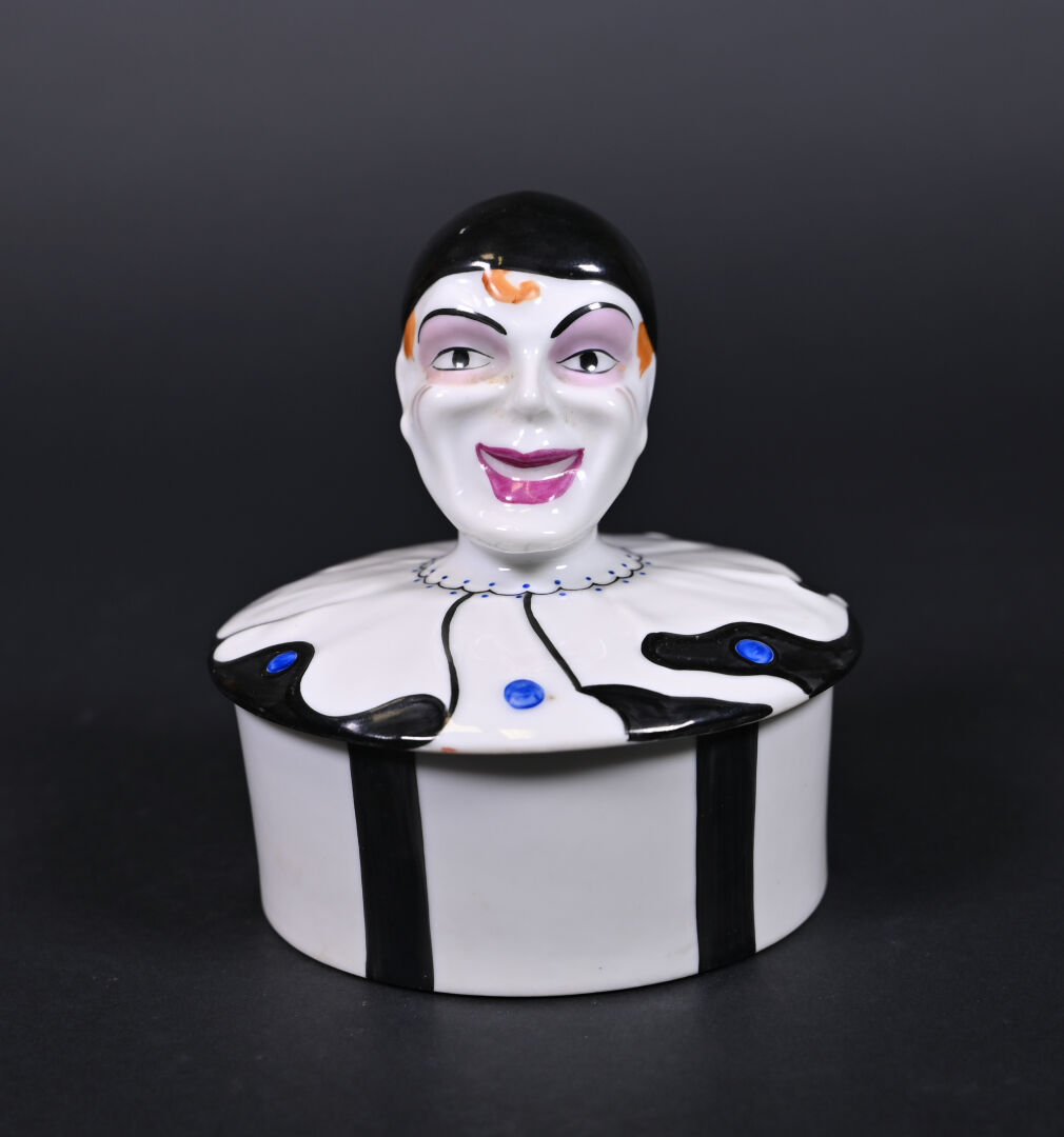Bonbonnière en céramique, le couvercle et sa prise figurant le clown Marceau. Marqué Limoges France au dessous. Haut. : 13 cm. Diam. : 11 cm.