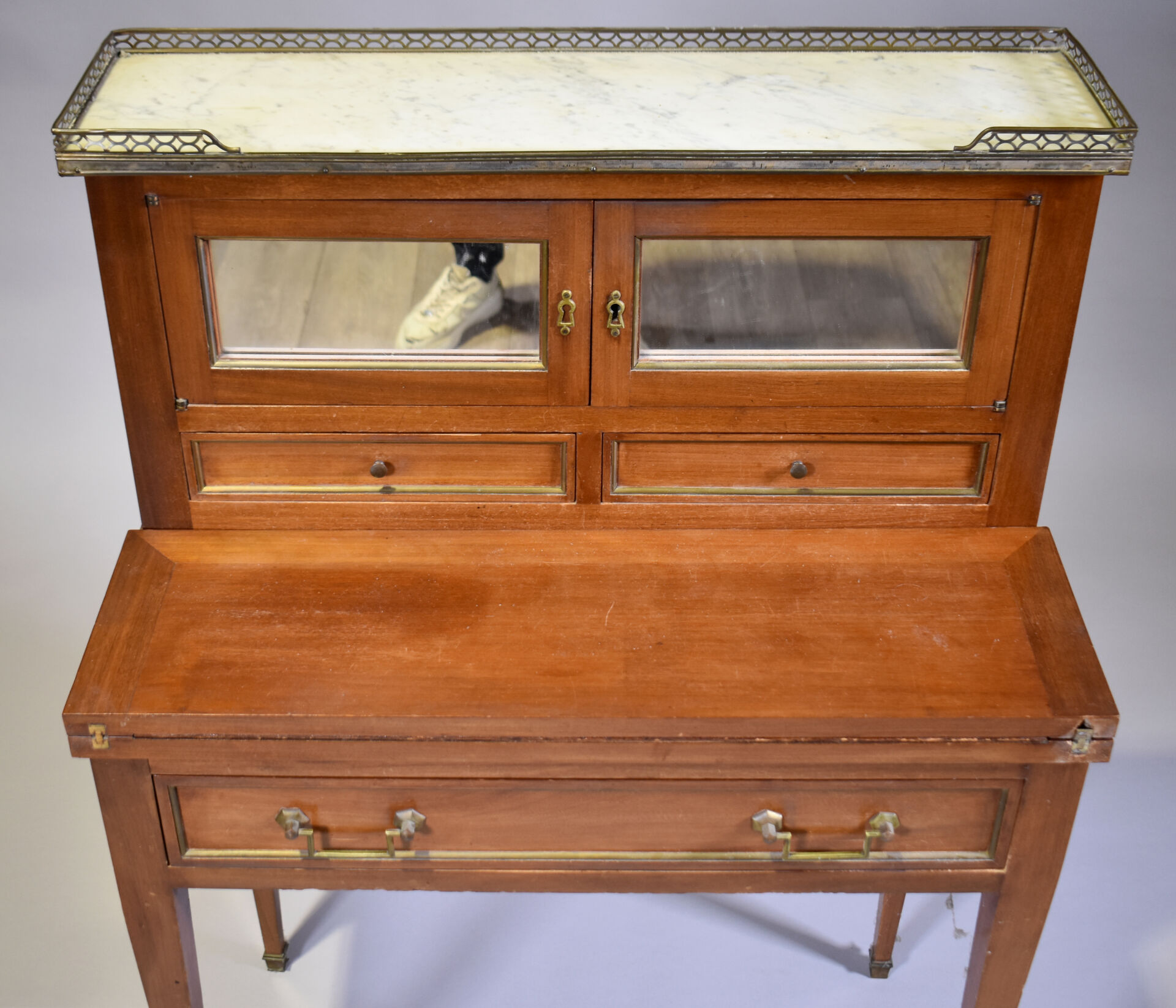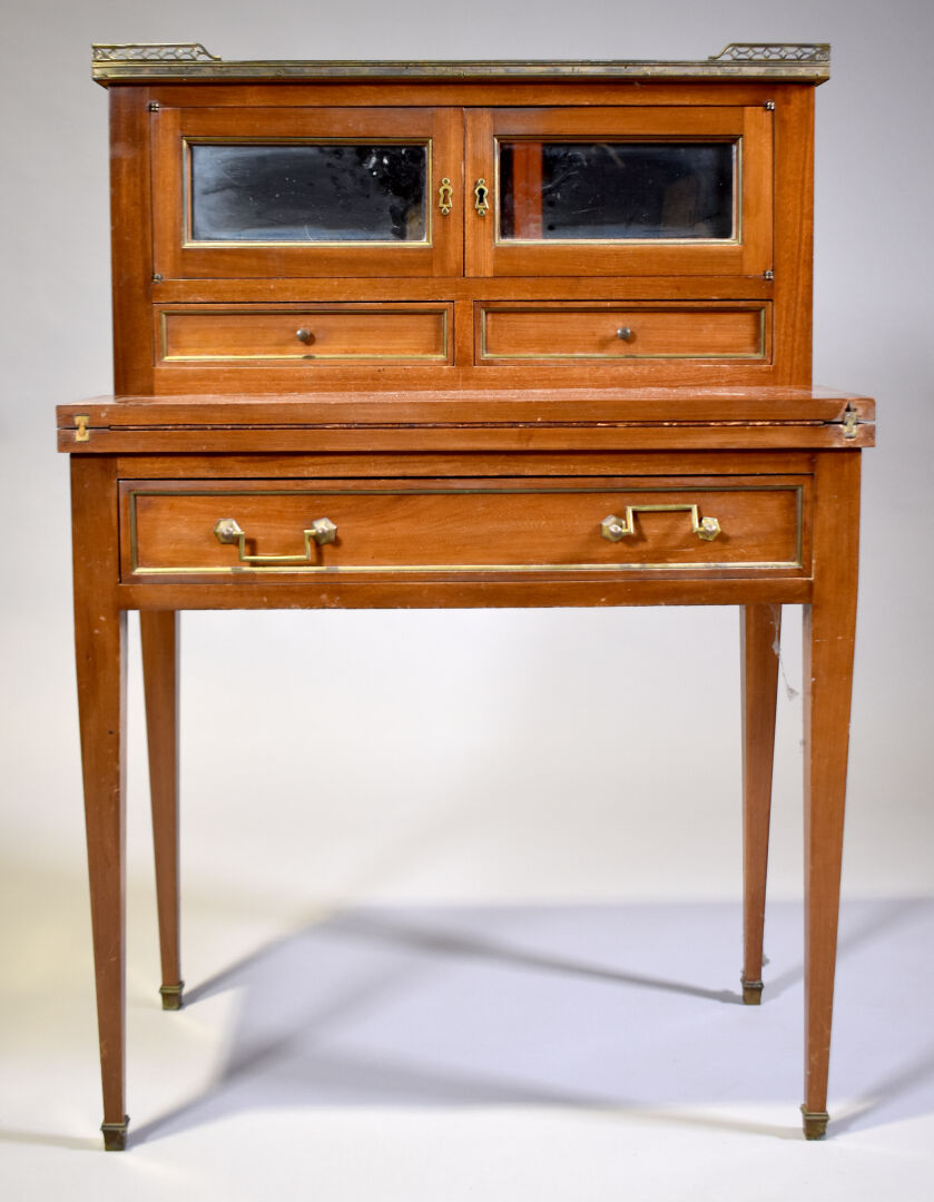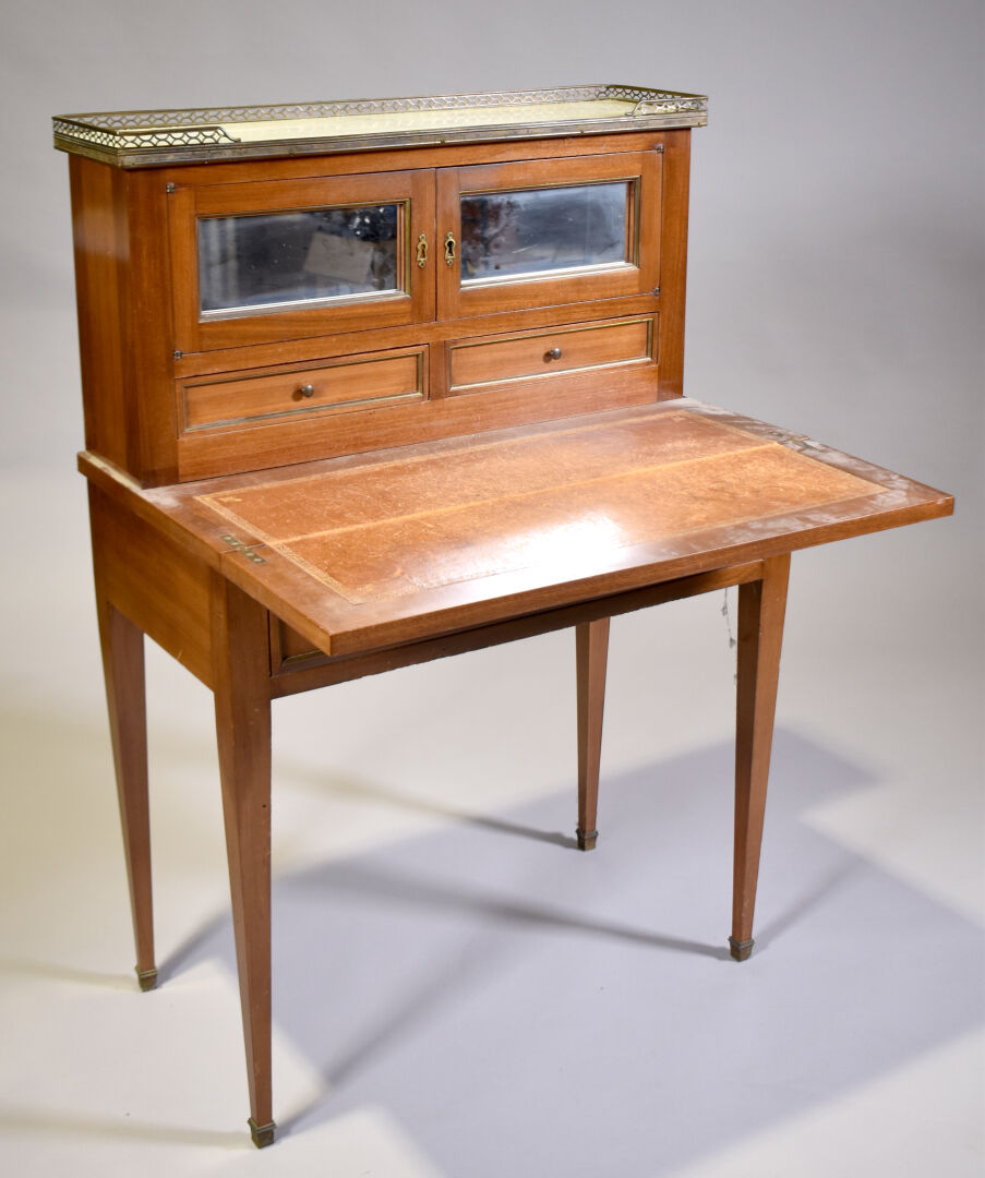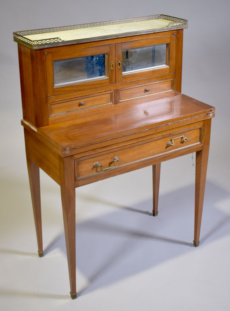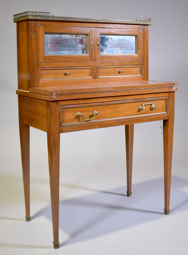 Bonheur du jour en acajou et placage d’acajou, il ouvre en partie haute par deux vantaux garnis de glace et deux tiroirs, un plateau ouvrant gainé de cuir tabac et un tiroir en ceinture. Pieds en gaine terminés par des sabots de laiton. La partie haute présente un plateau de marbre blanc veiné gris ceint d’une galerie de laiton ajourée (usures, petites déformations, griffures sur le cuir). Style Directoire. Haut. : 111,5 cm – Larg. : 80 cm – Prof. : 42 cm.