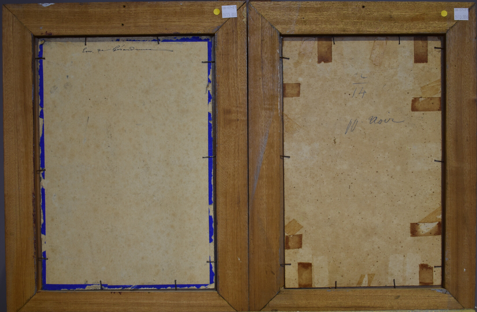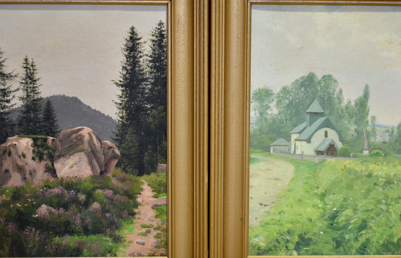 BONIFACE (XXe siècle). Paysage de montagne aux rochers et Chapelle. Deux huiles sur carton signées. 34,5 x 23 cm.