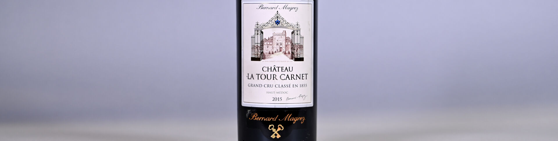 BORDEAUX – 1 bouteille, Haut-Médoc, Château La Tour Carnet, 4ème Grand Cru Classé, 2015. Etiquette avec des traces et un petit accroc. Bandeau légèrement abimé avec quelques traces.