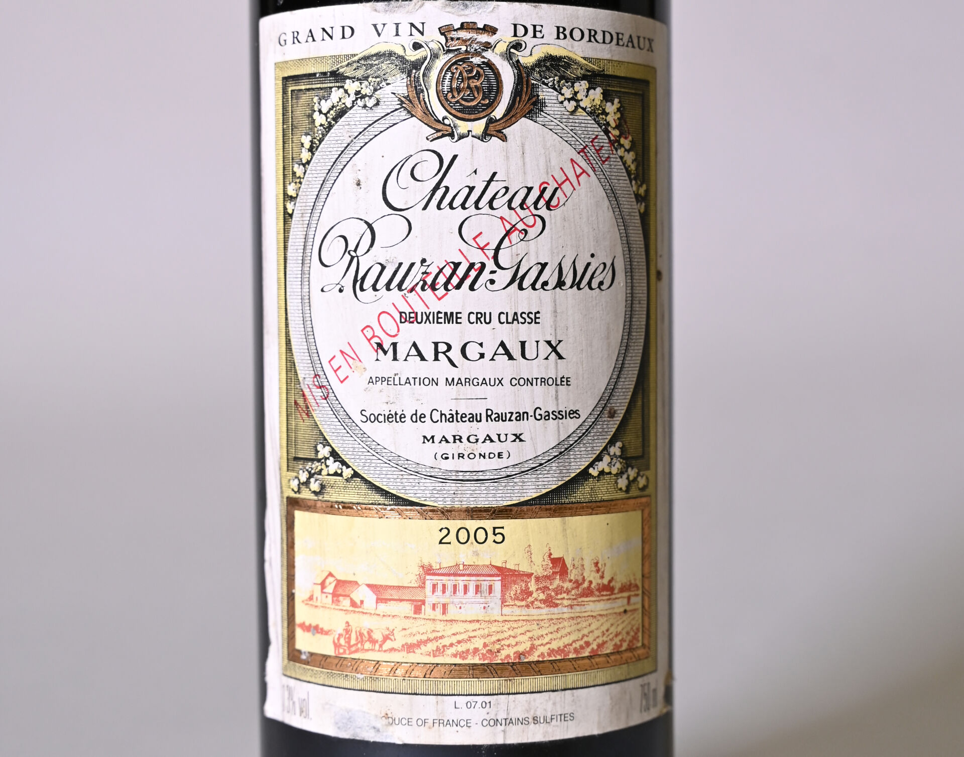 BORDEAUX – 1 bouteille, Margaux, Château Rauzan-Gassies, 2ème Grand Cru Classé, 2005. Etiquette sale et légèrement abimée.