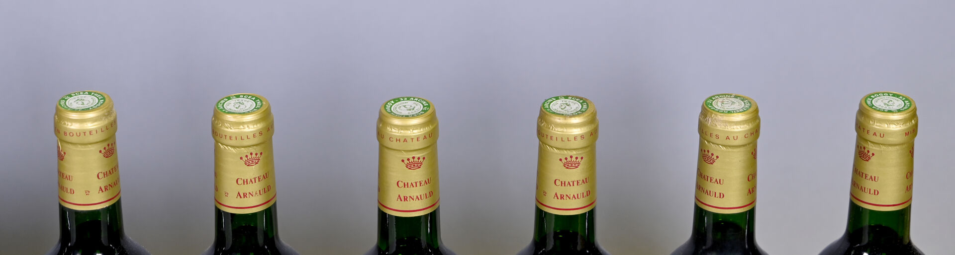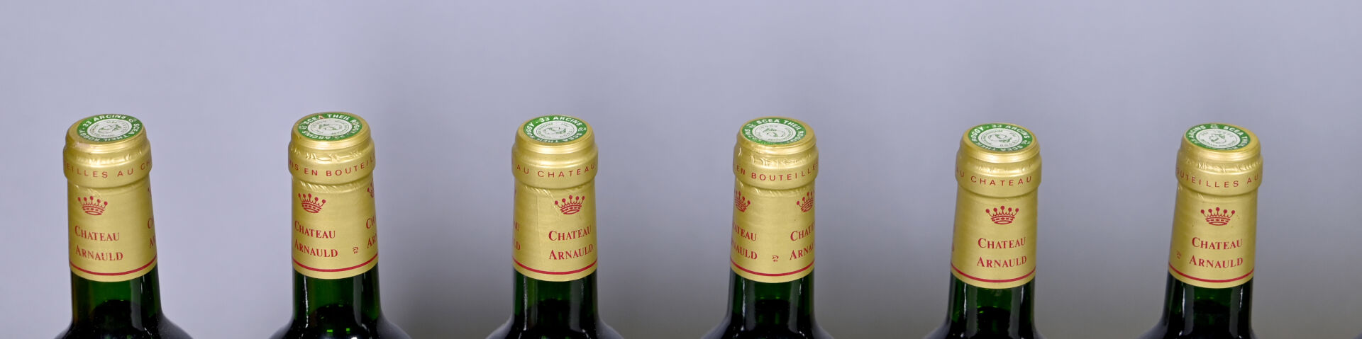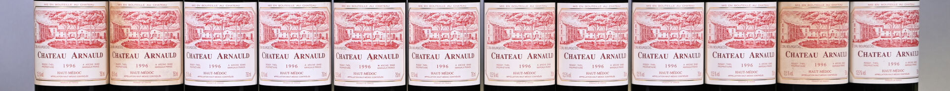 BORDEAUX – 1 CBO, 12 bouteilles, Haut-Médoc, Château Arnauld, Cru Bourgeois, 1996. 2 BG (+) et 1 BG. Deux étiquettes légèrement tachées.