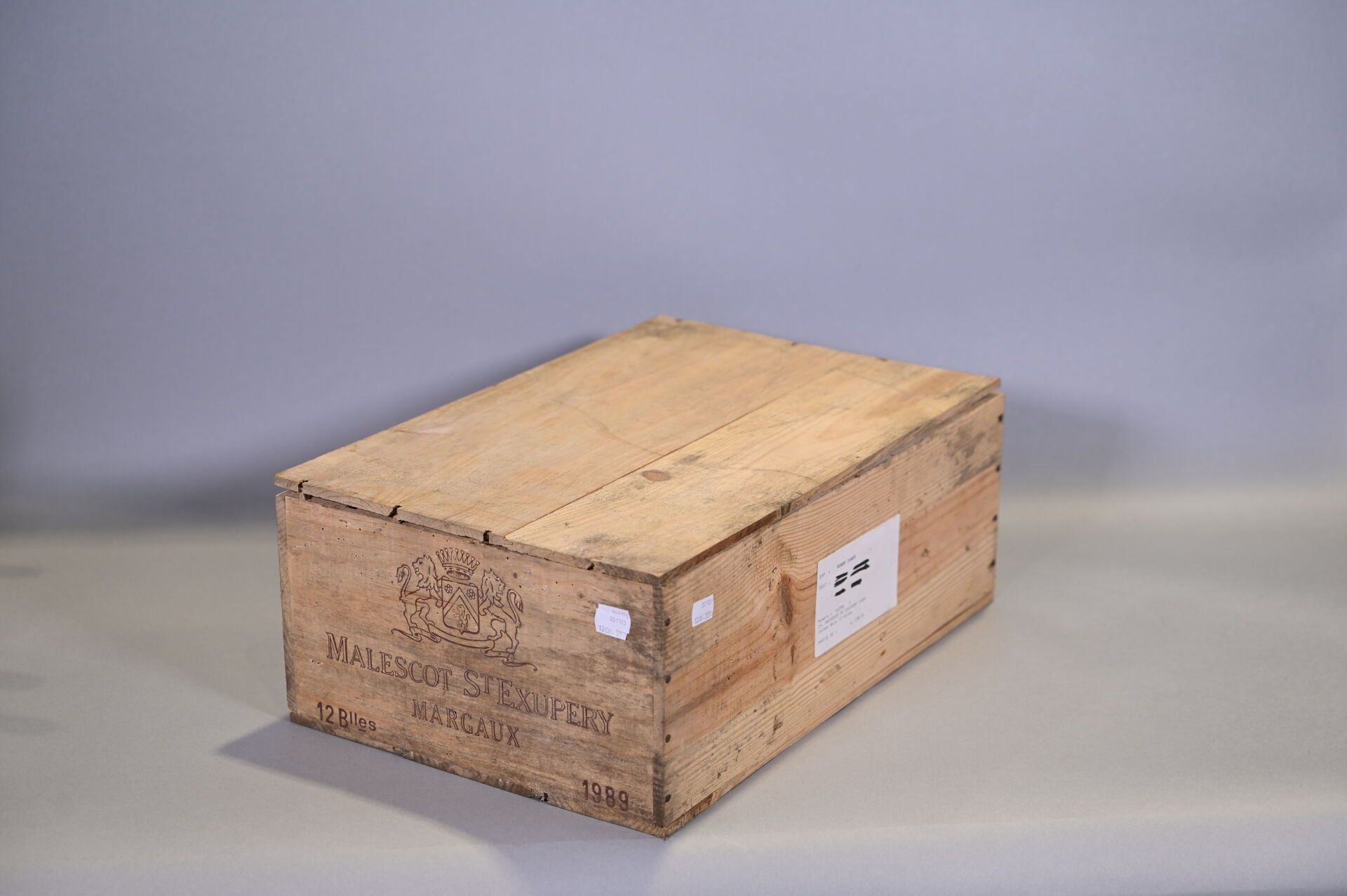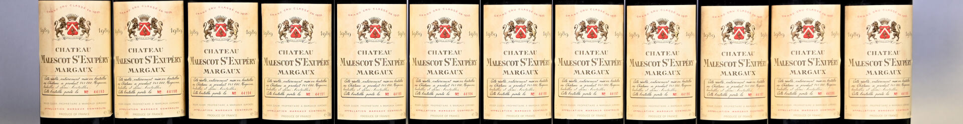 BORDEAUX – 1 CBO, 12 bouteilles, Margaux, Château Malescot-Saint-Exupéry, 3ème Grand Cru Classé, 1989. 2 BG (+), 2 BG, 1 BG (-), 1 TLB (+) et 1 HE (+). Capsules légèrement sales. Etiquettes légèrement sales avec quelques points de décollement dont quatre sont partiellement décollées et une autre entièrement décollée.