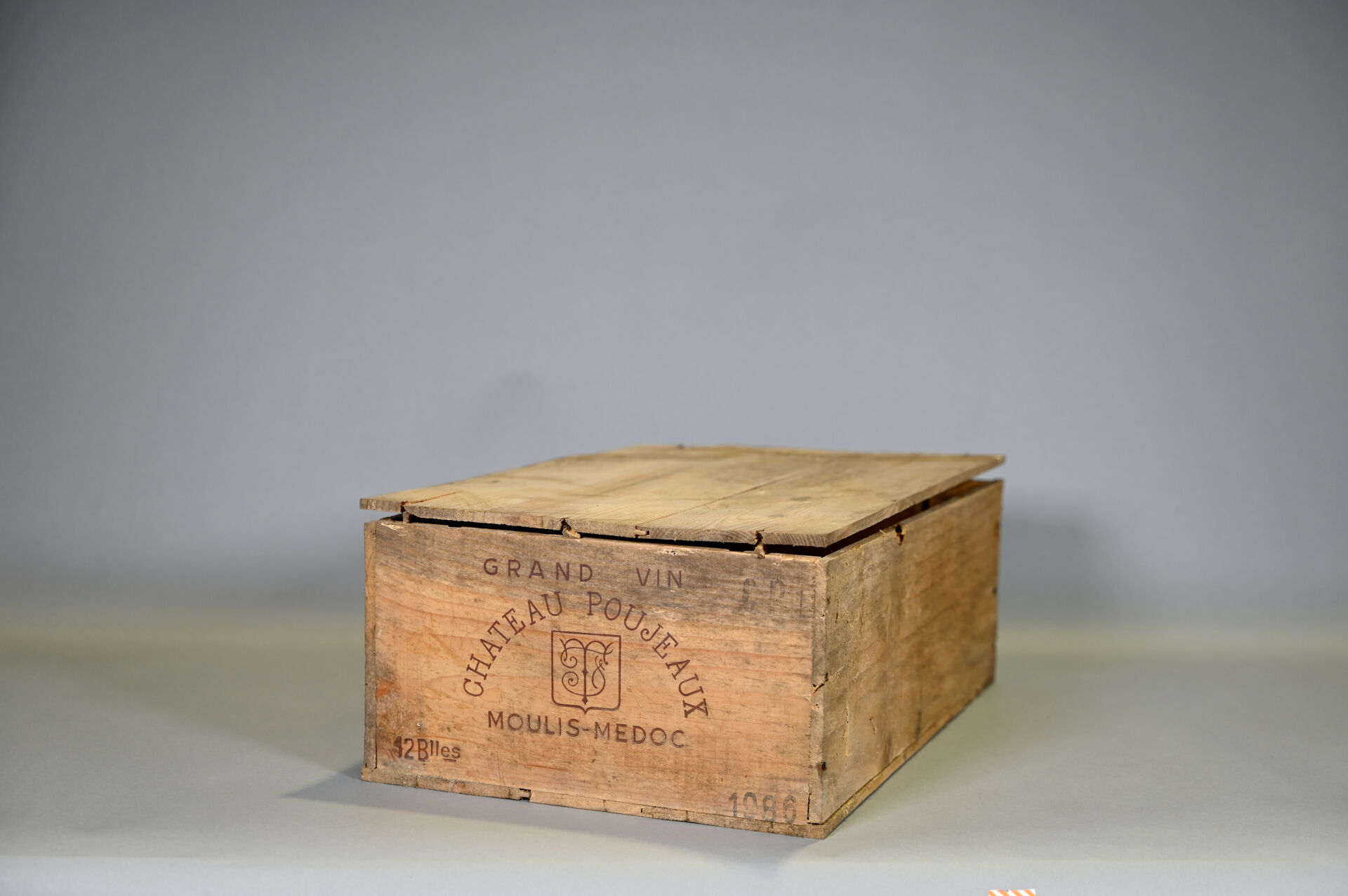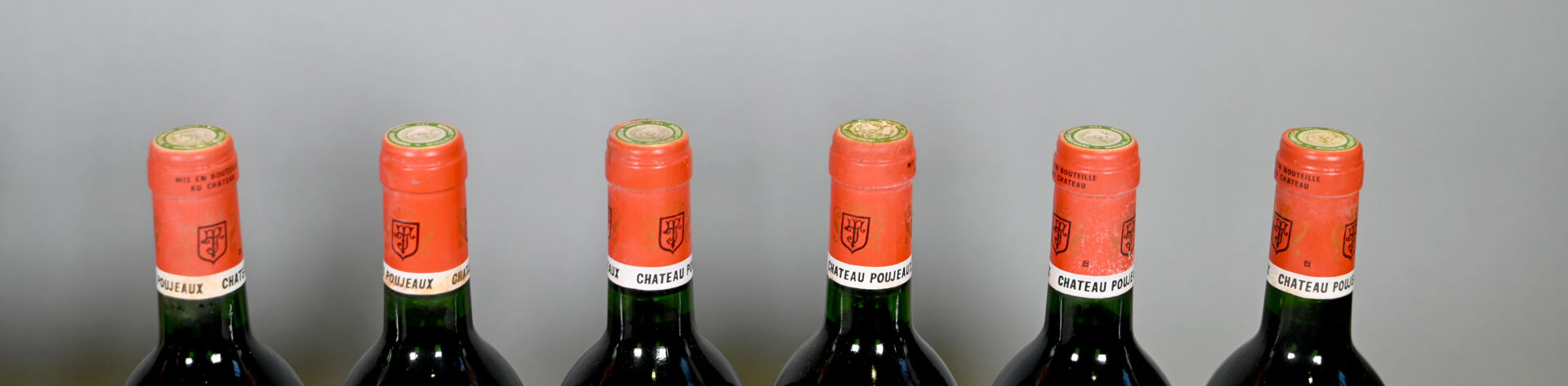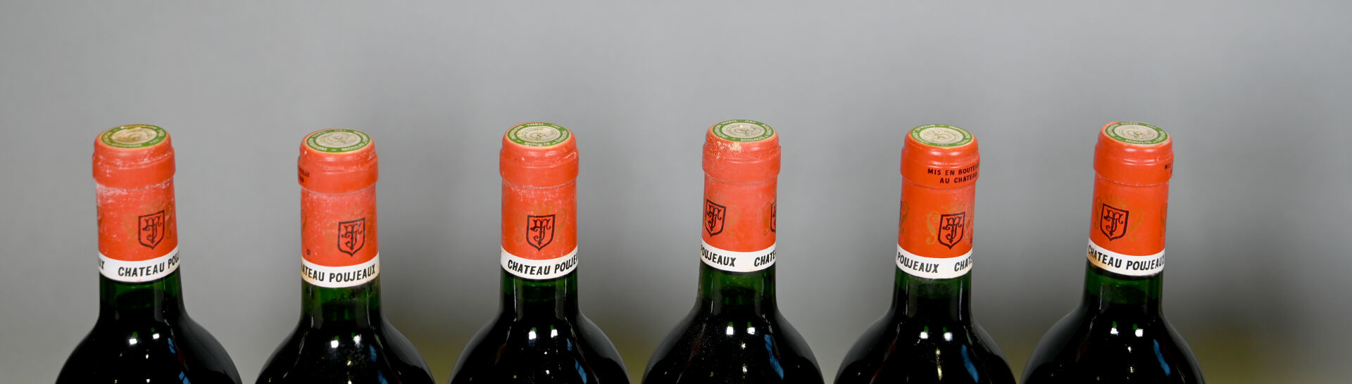 BORDEAUX – 1 CBO, 12 bouteilles, Moulis, Château Poujeaux, 1986. Capsules légèrement sales. Etiquettes très légèrement sales à légèrement sales. Une étiquette avec une bande sale.