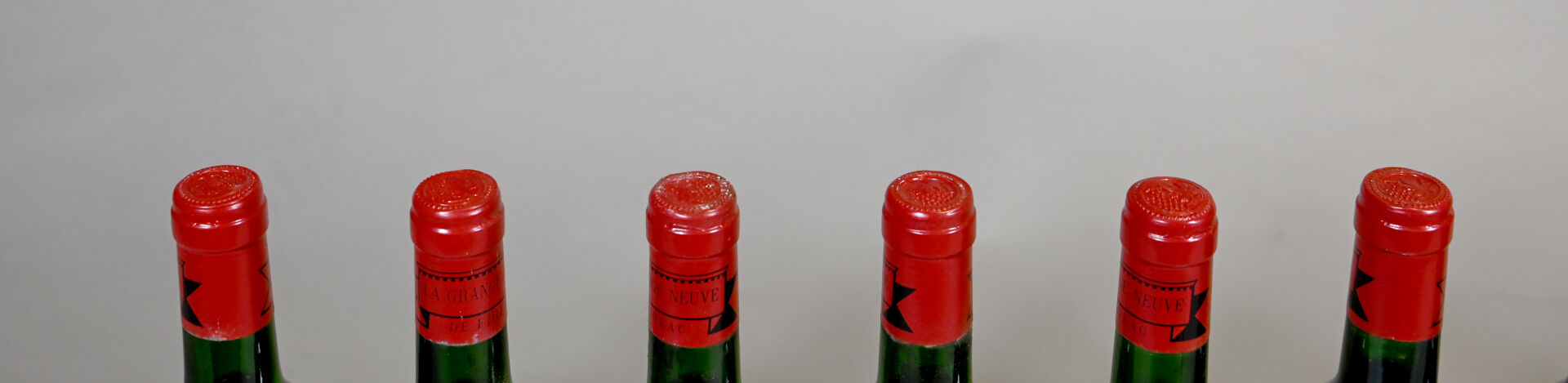 BORDEAUX – 1 CBO, 12 bouteilles, Saint-Emilion, Château La Grange Neuve de Figeac (second vin du Château Figeac), 1985. 1 BG (+), 3 BG, 1 TLB (+) et 3 TLB. Capsules légèrement sales et abimées. Etiquettes décollées, légèrement sales et abimées.