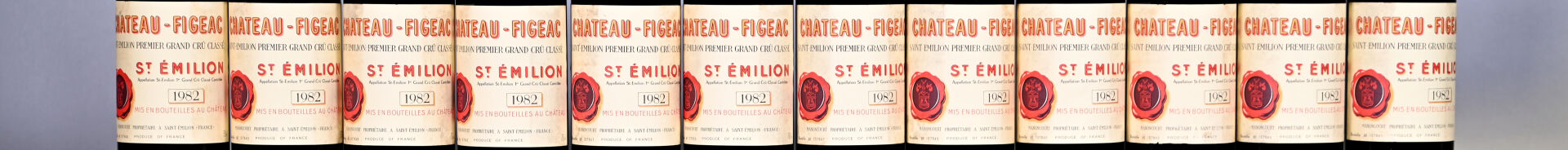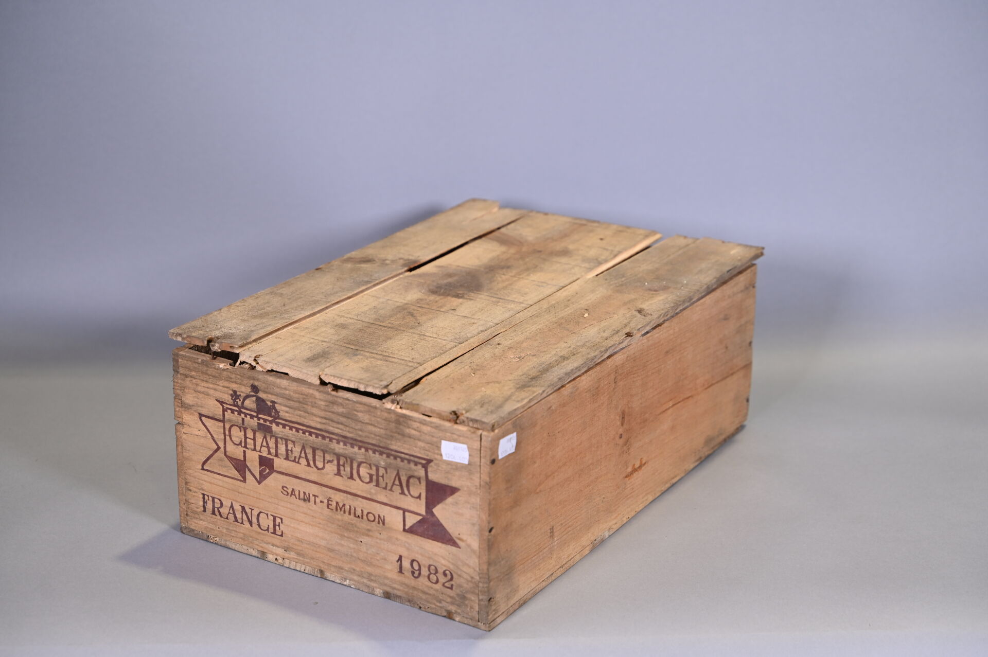 BORDEAUX – 1 CBO, 12 bouteilles, Saint-Emilion Grand Cru, Château Figeac, 1er Grand Cru Classé ‘A’, 1982. 4 BG (+), 1 BG (-), 2 TLB (+) et 1 TLB (-). Capsules très légèrement sales. Etiquettes légèrement sales.