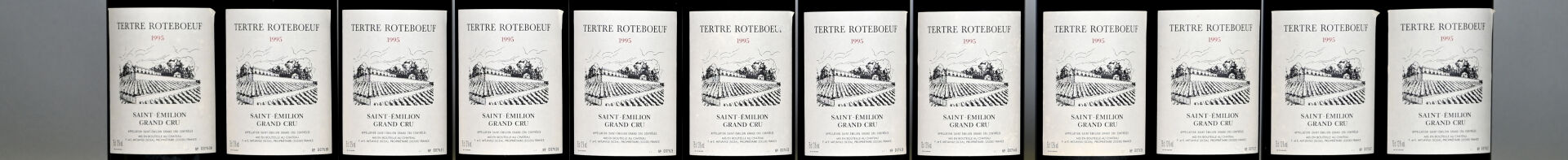 BORDEAUX – 1 CBO, 12 bouteilles, Saint-Emilion Grand Cru, Tertre Roteboeuf, 1995. 9 BG (+) et 3 BG. Capsules légèrement sales et abimées. Etiquettes avec des petits points de décollement au niveau des angles supérieurs.